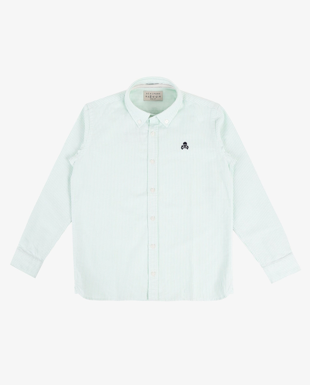 Camisa oxford de rayas confeccionada en tejido 100% algodón. Corte Regular Fit, cuello con botones y cierre con botones. Manga larga terminada en puño y bordado de calavera a contraste en el pecho.