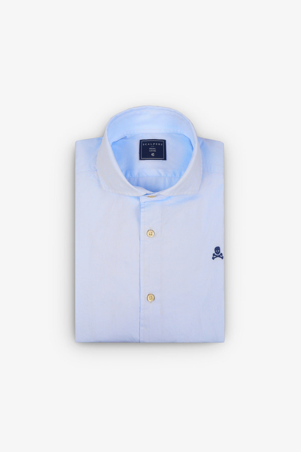 Camisa de vestir lisa. Confeccionada en tejido 100% algodón. Corte Regular Fit. Cuello cutaway. Cierre con botones. Manga larga terminada en puño simple. Detalle de calavera bordada en el pecho.