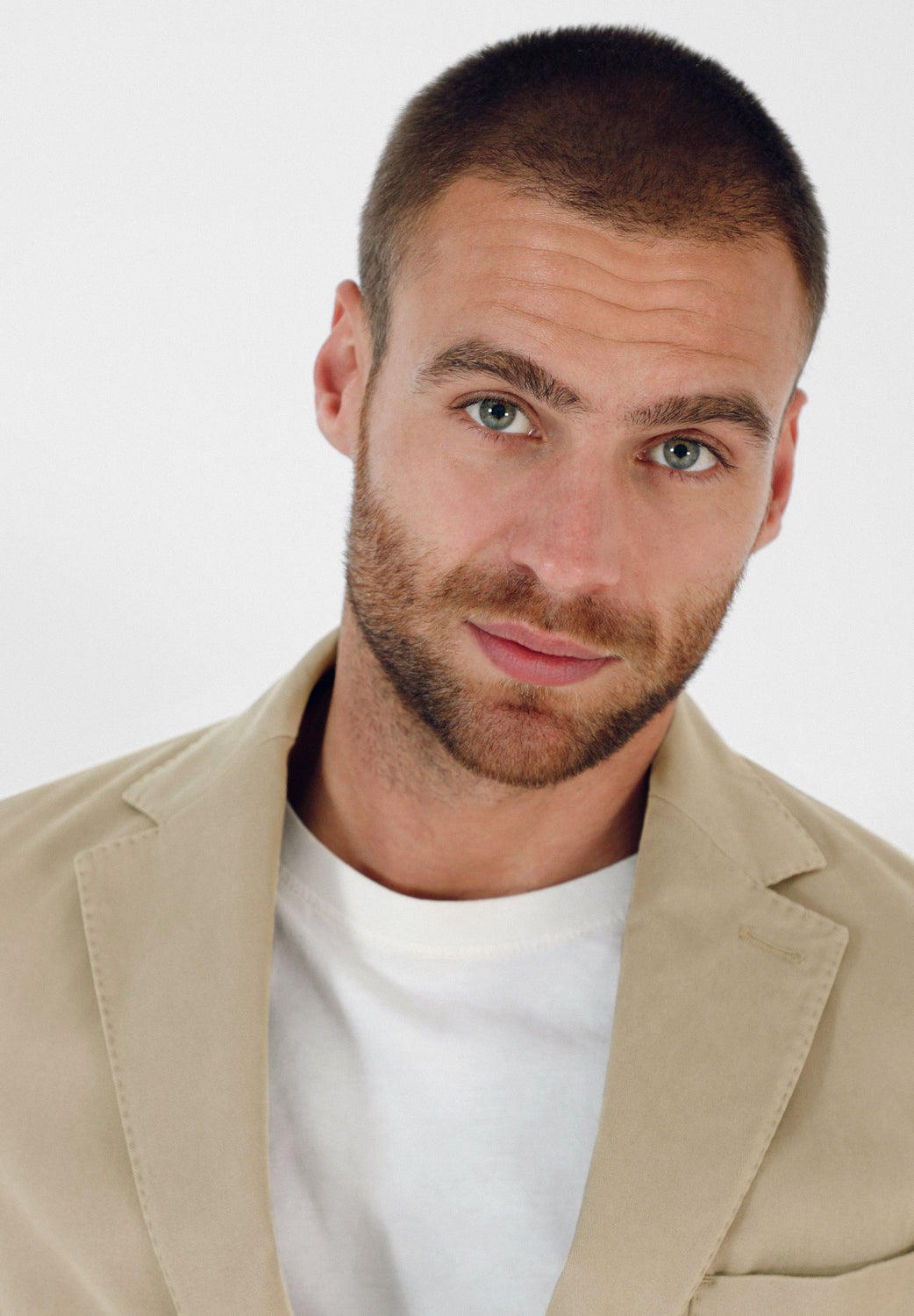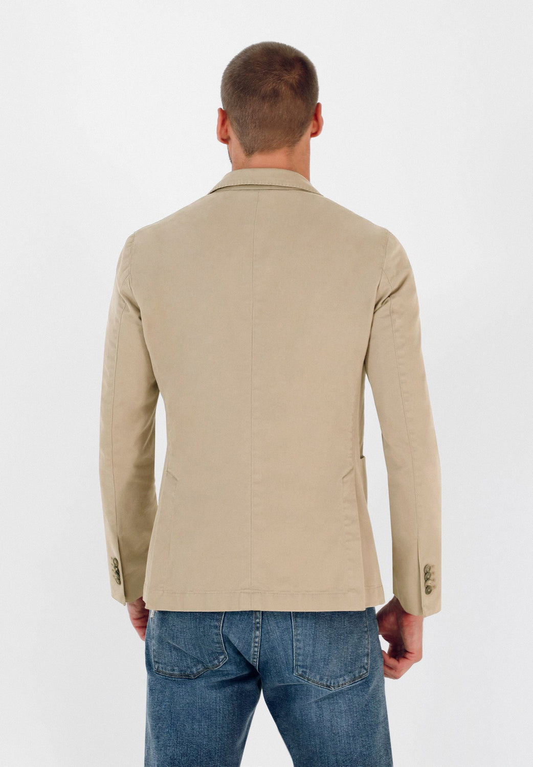 Americana confeccionada en tejido 100% algodón. Corte Regular Fit, cuello con solapas y cierre con botones. Manga larga terminada en puño con botones y bolsillos de parche.