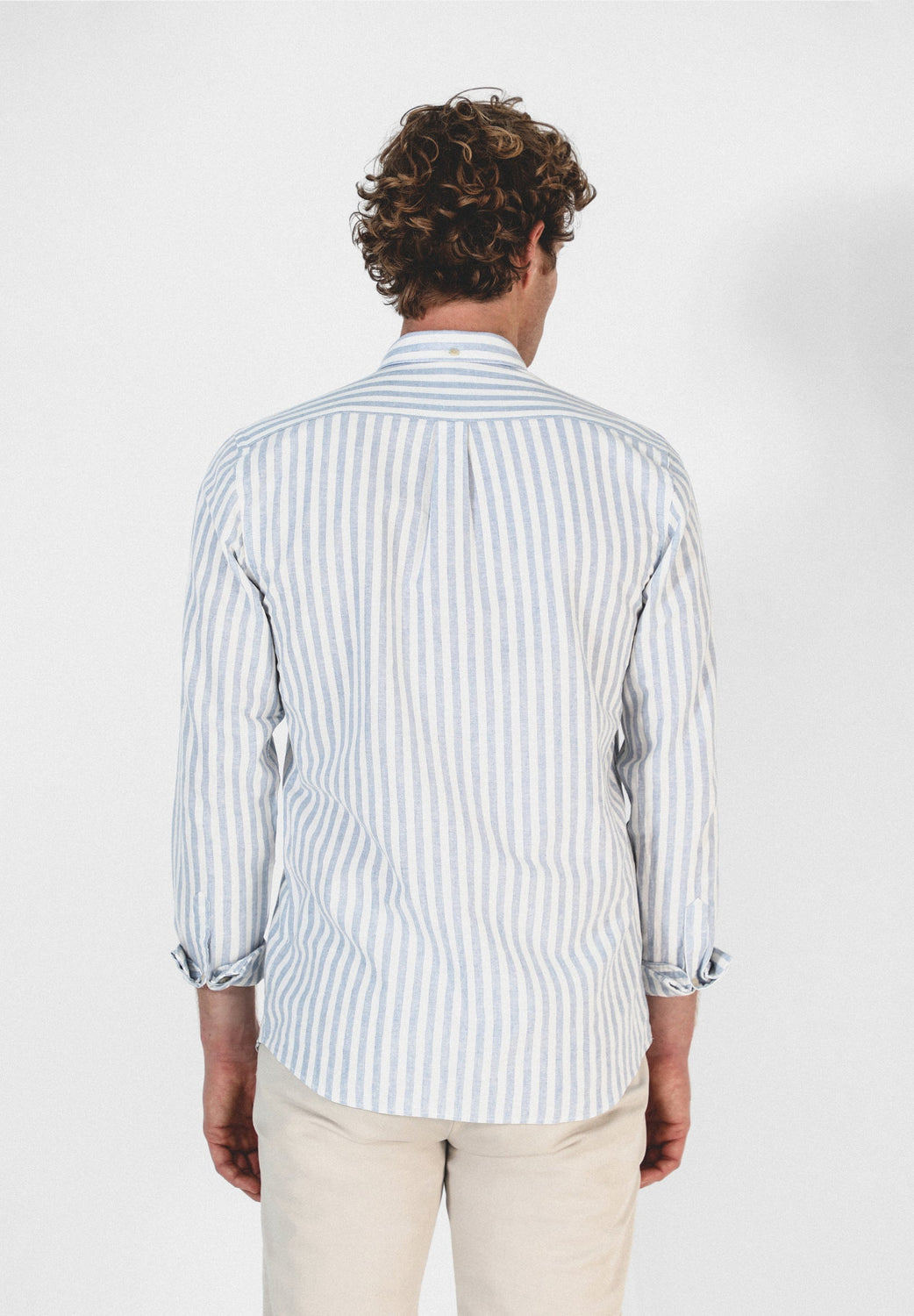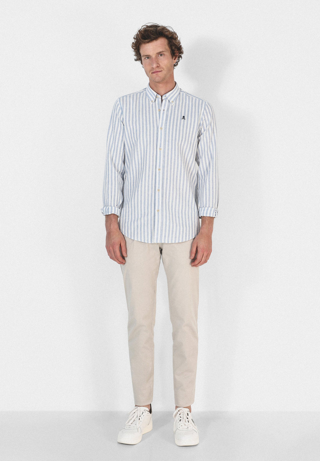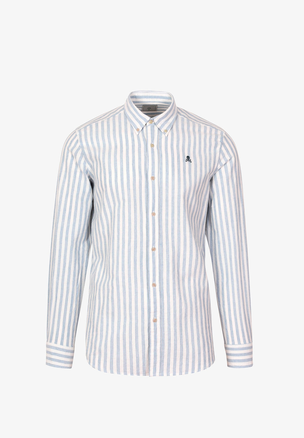 Camisa de rayas confeccionada en tejido mezcla de algodón y lino. Corte Regular Fit, cuello con botones y cierre con botones. Manga larga terminada en puño con botones y detalle de calavera bordada a contraste.