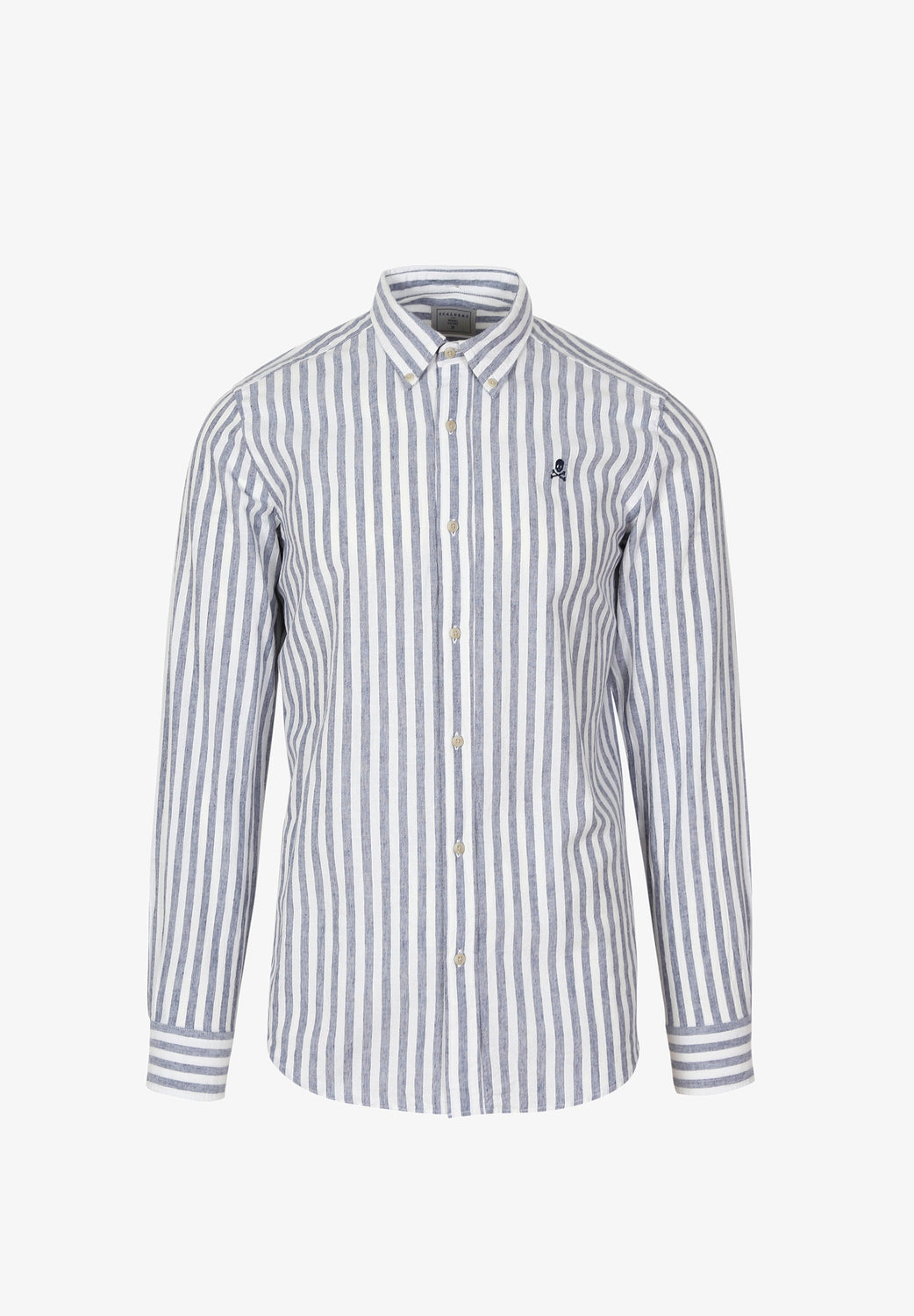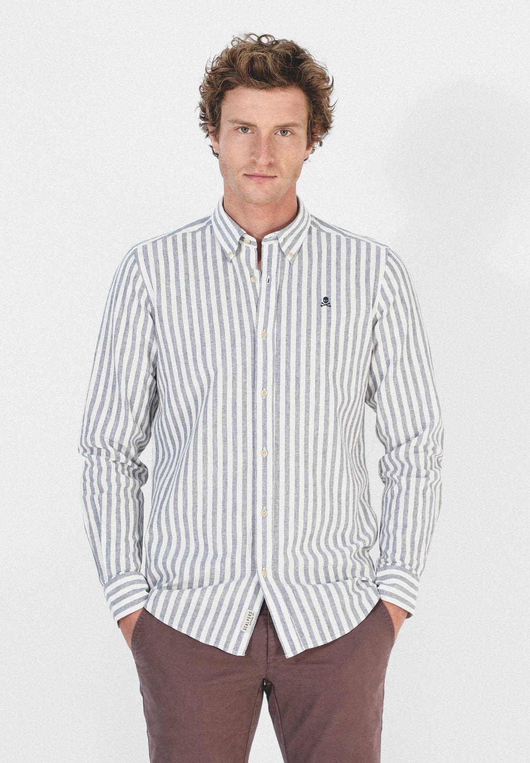 Camisa de rayas confeccionada en tejido mezcla de algodón y lino. Corte Regular Fit, cuello con botones y cierre con botones. Manga larga terminada en puño con botones y detalle de calavera bordada a contraste.