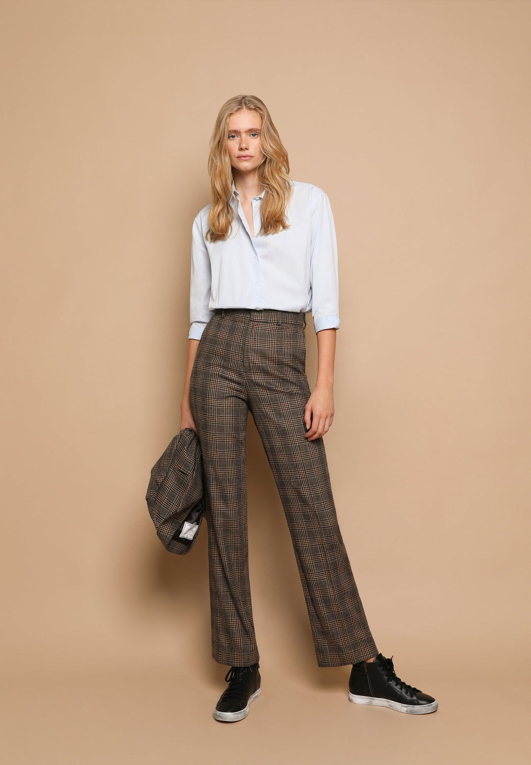 Pantalón recto premium con estampado de cuadros.