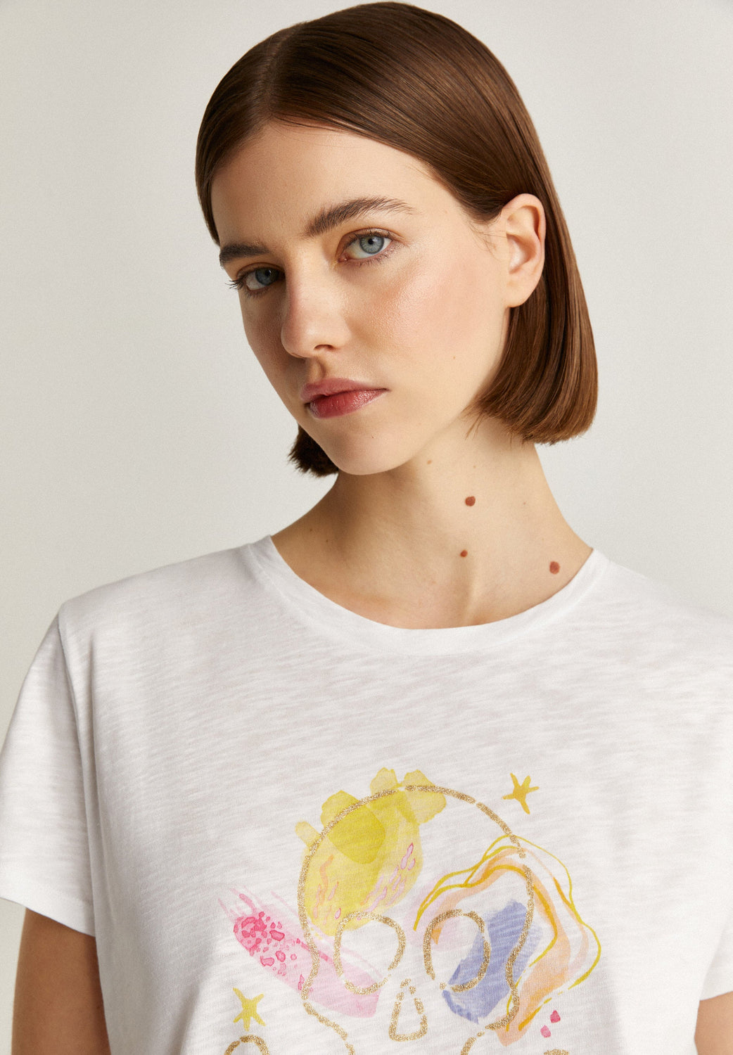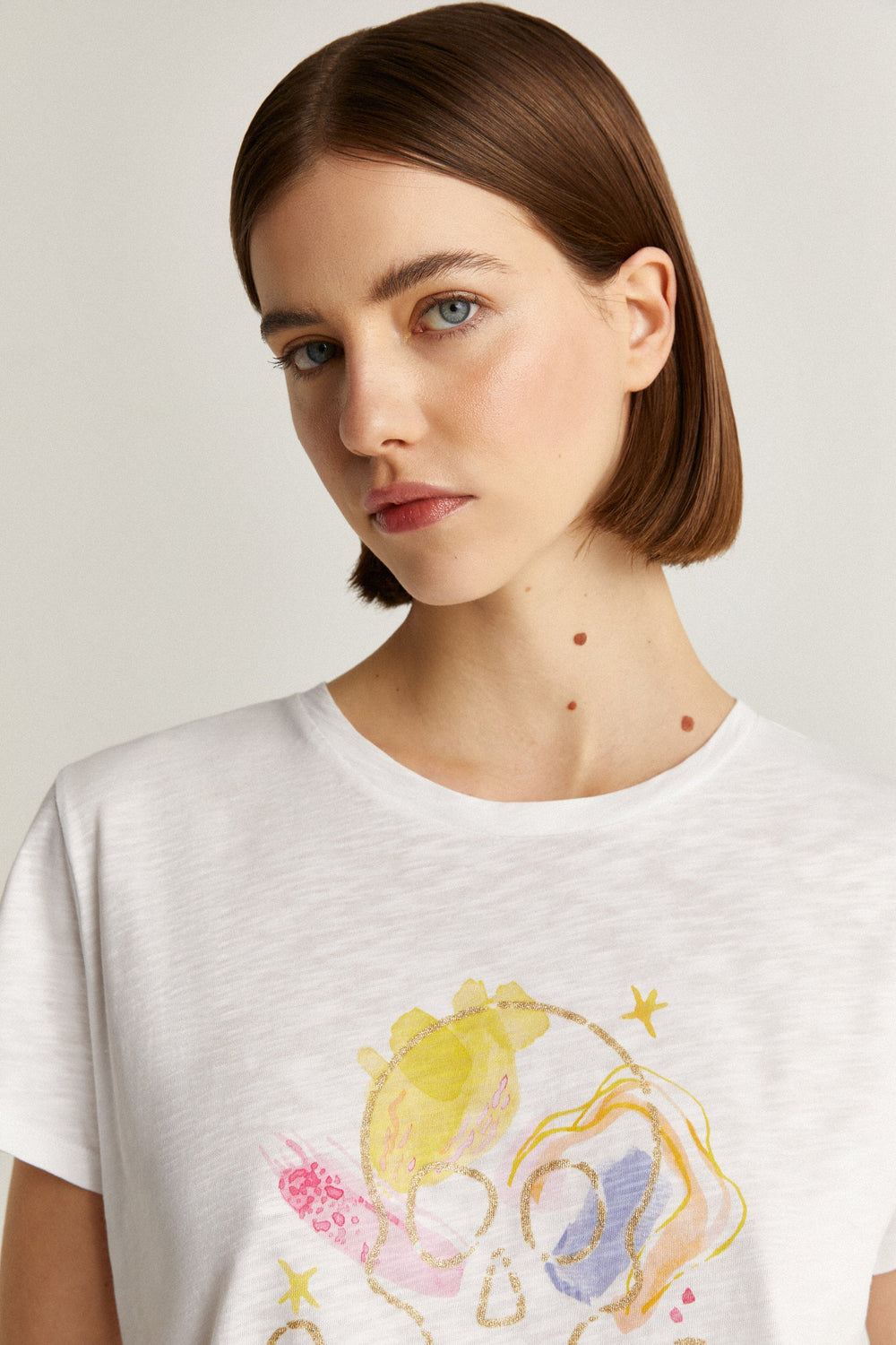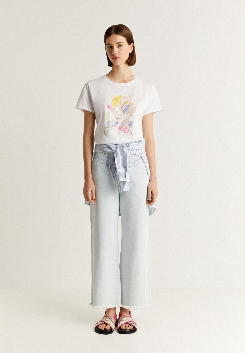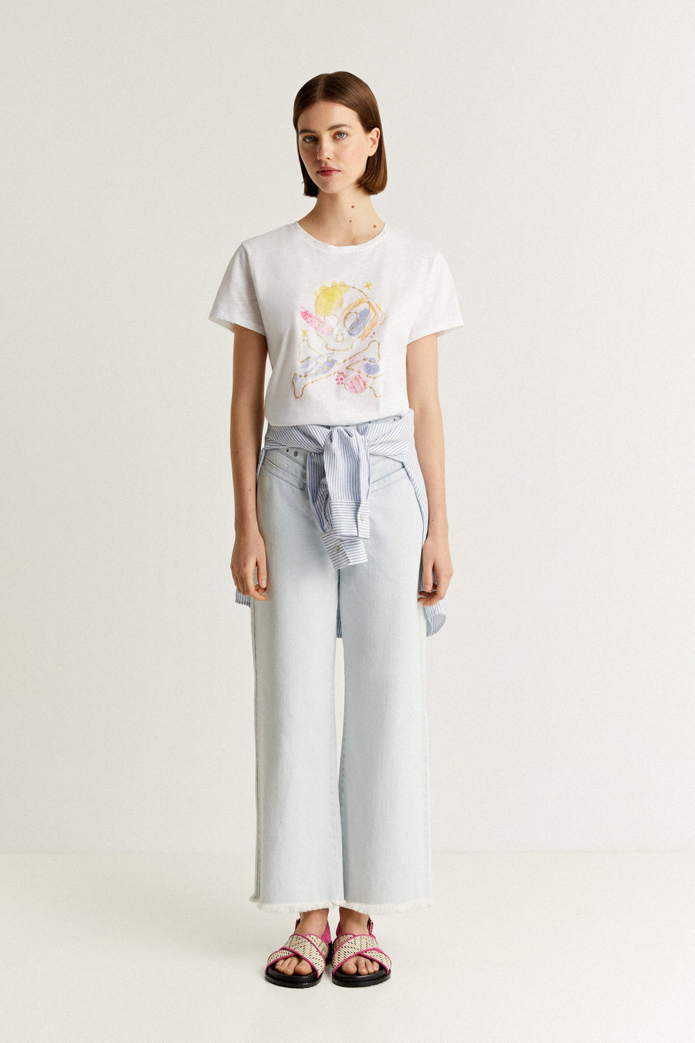 Camiseta con print frontal y detalle contorno calavera en glitter.