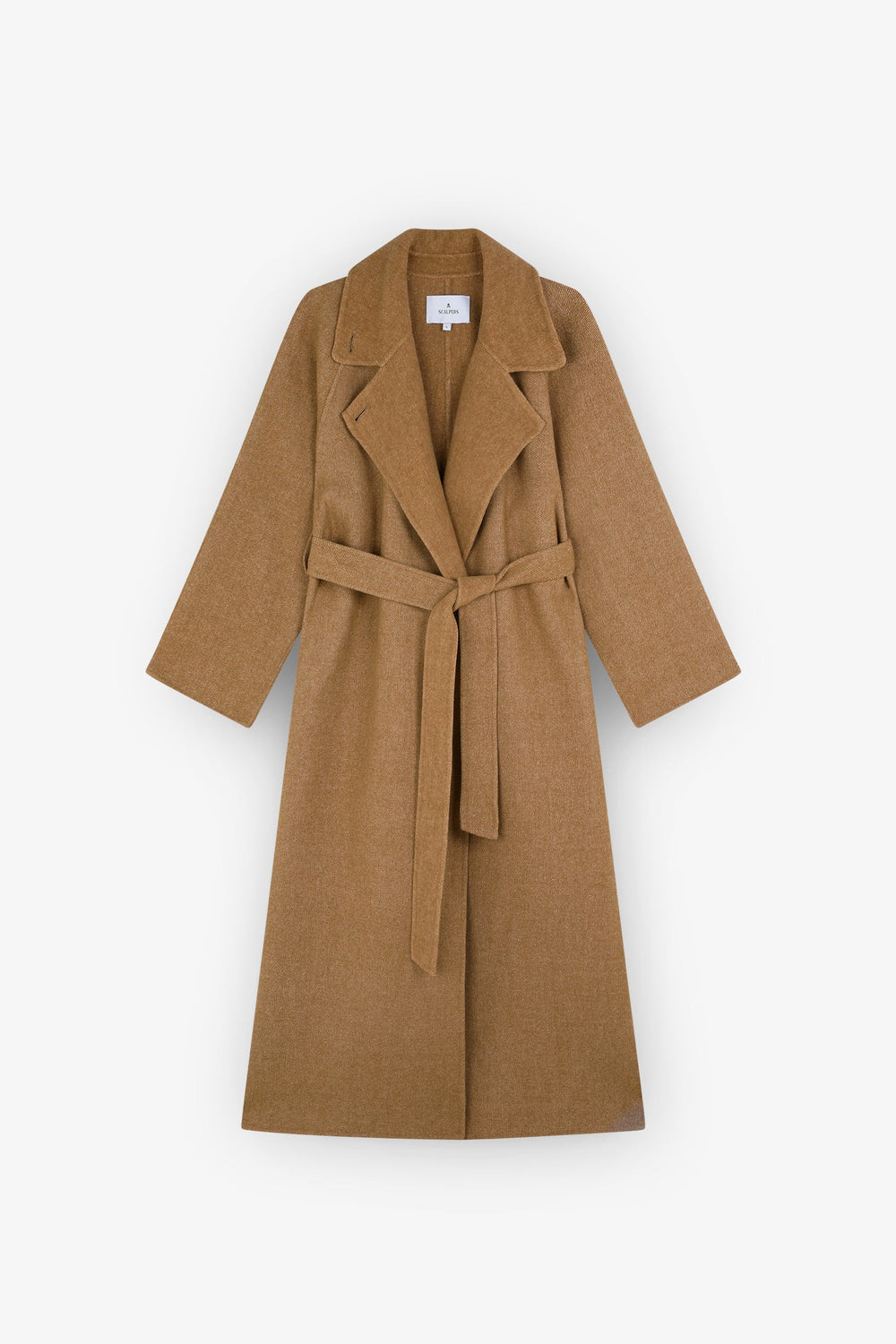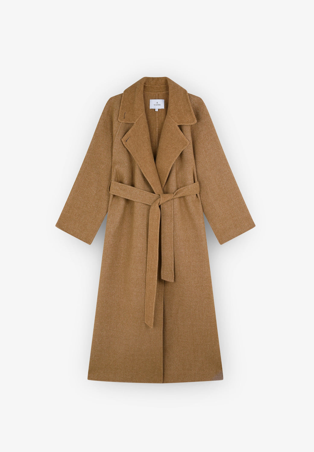 Abrigo largo confeccionado en lana haciendo espiga. Regular fit, cierre con lazada y botones en cuello y cuello con solapas de muesca. Manga larga y bolsillos. Abertura trasera.