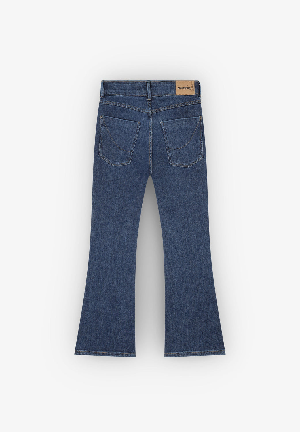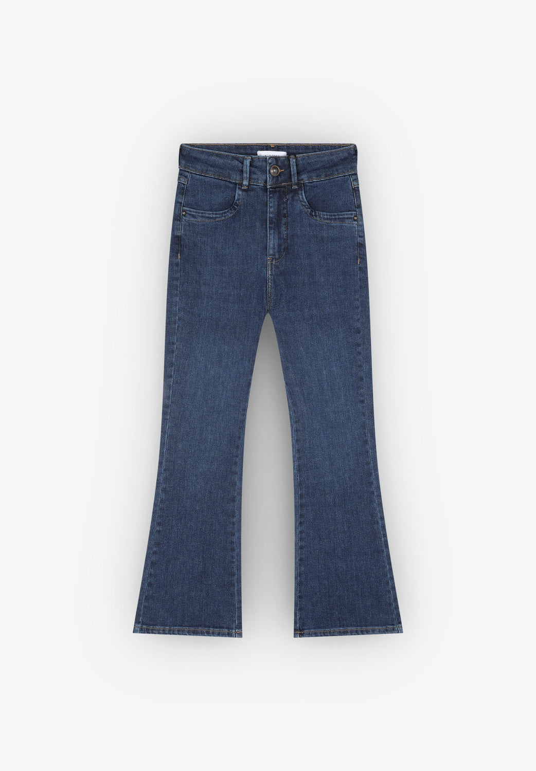 Jeans confeccionados en algodón ligeramente elástico. Corte ankle flare, cierre con botón y cremallera. Bolsillos laterales y traseros y trabillas en cintura.