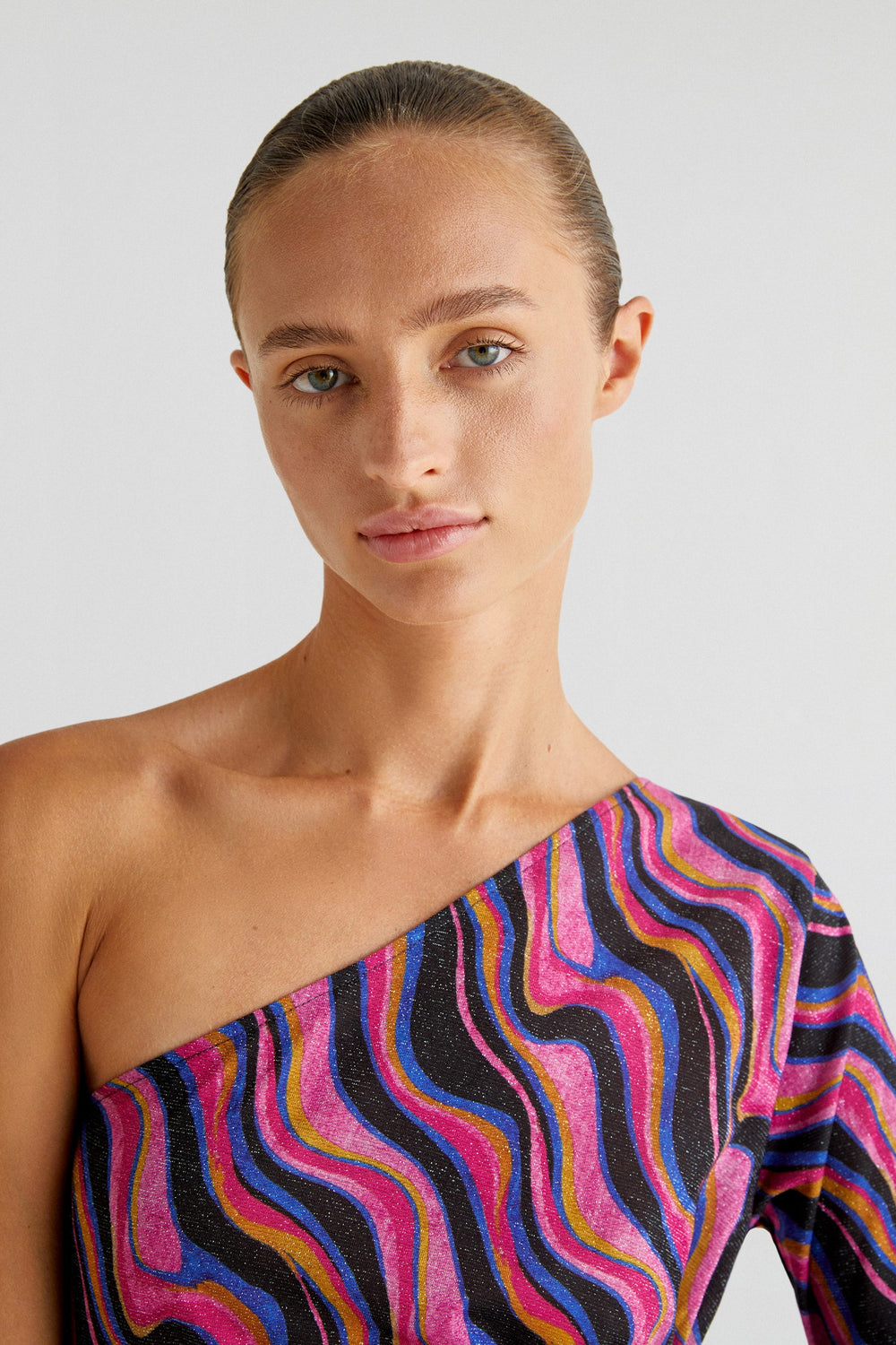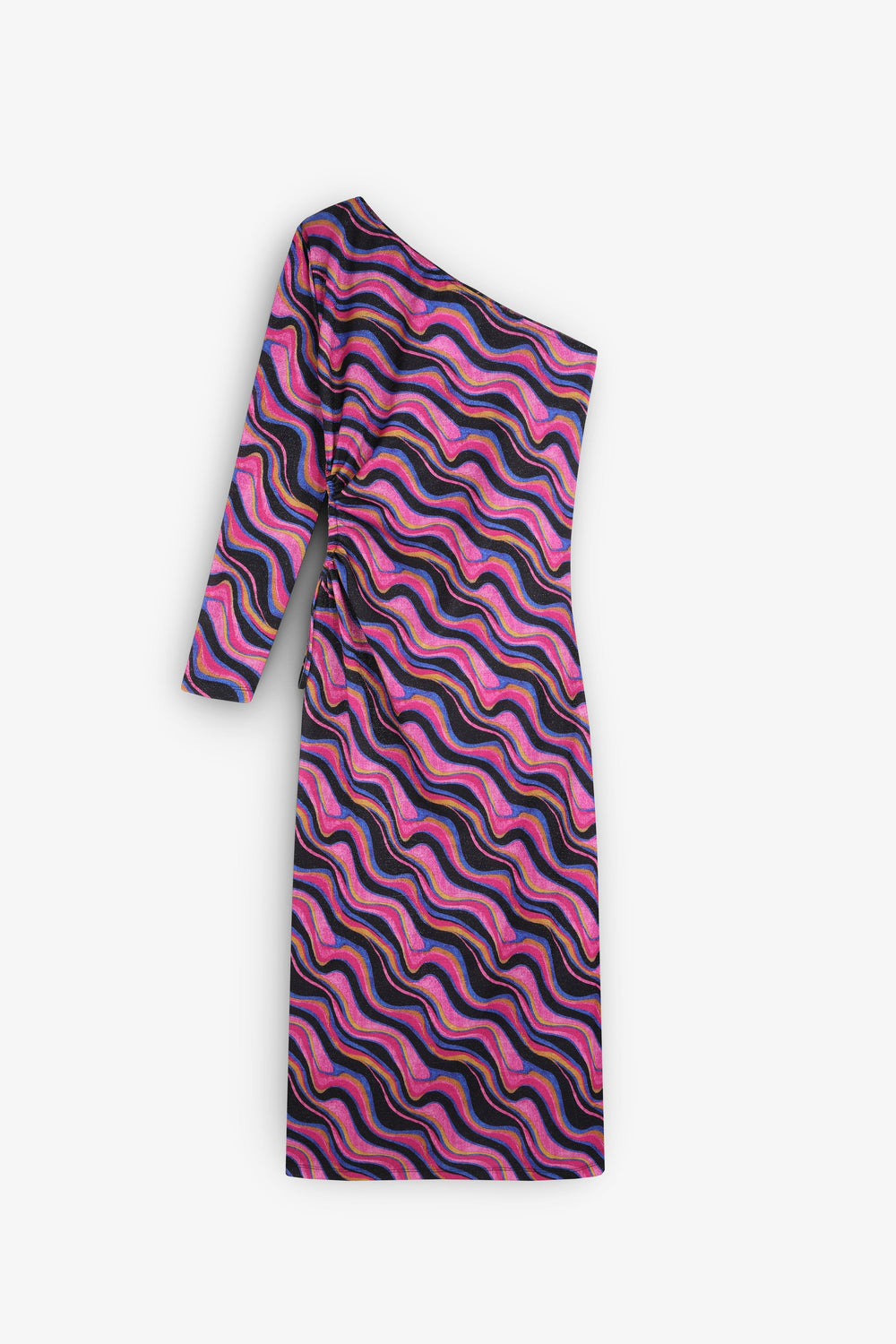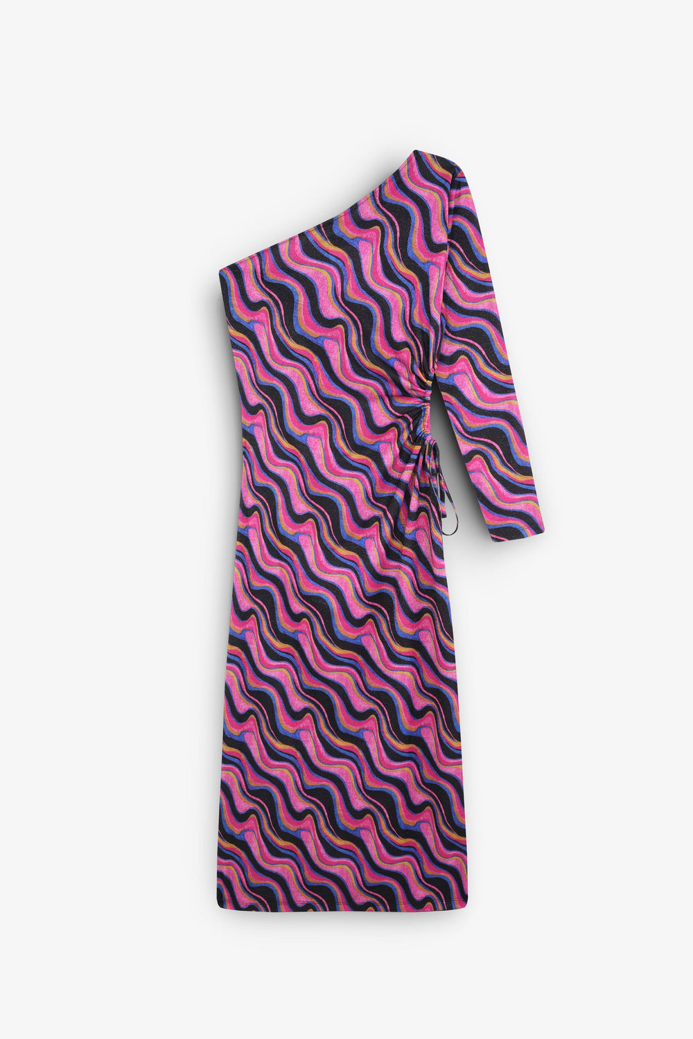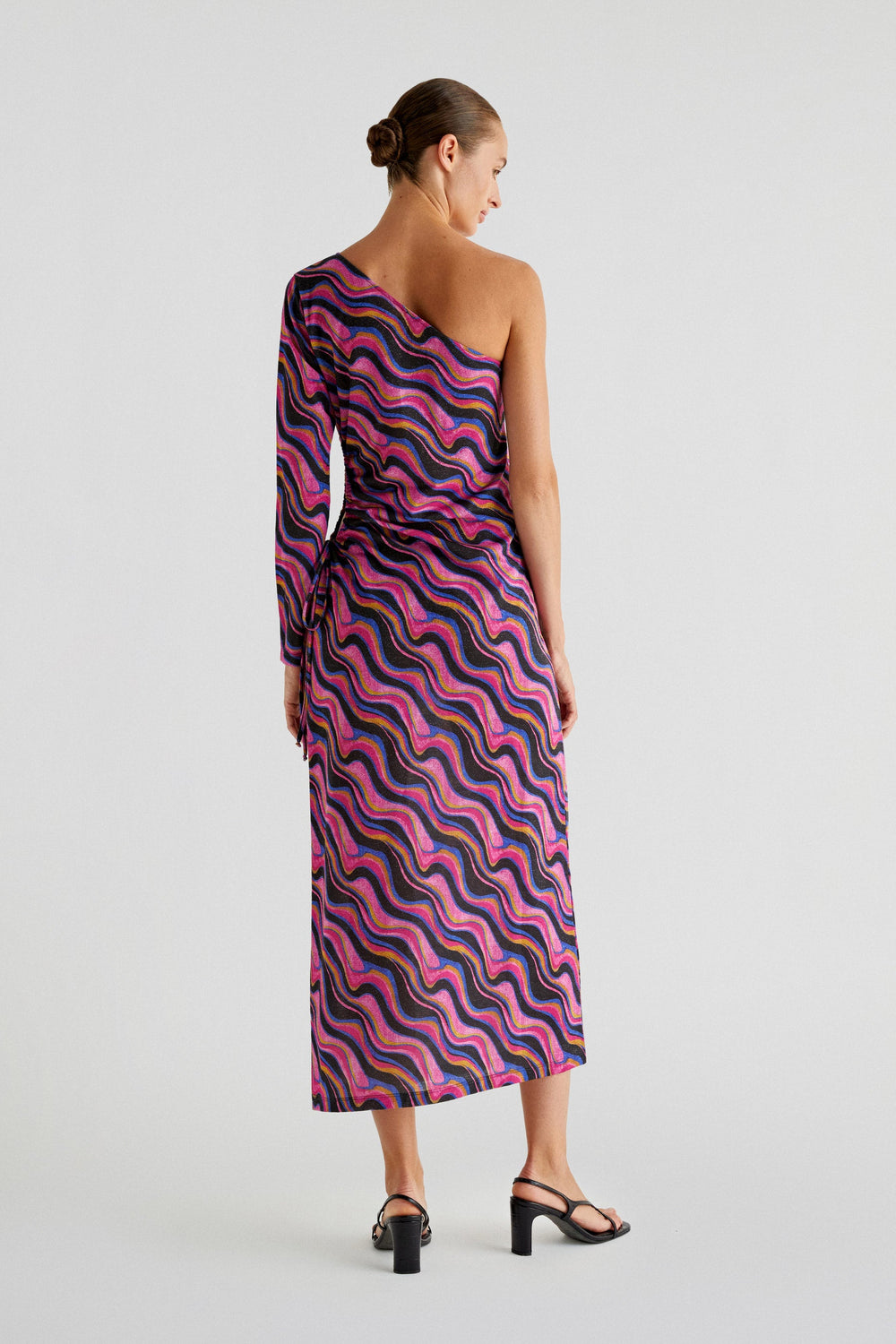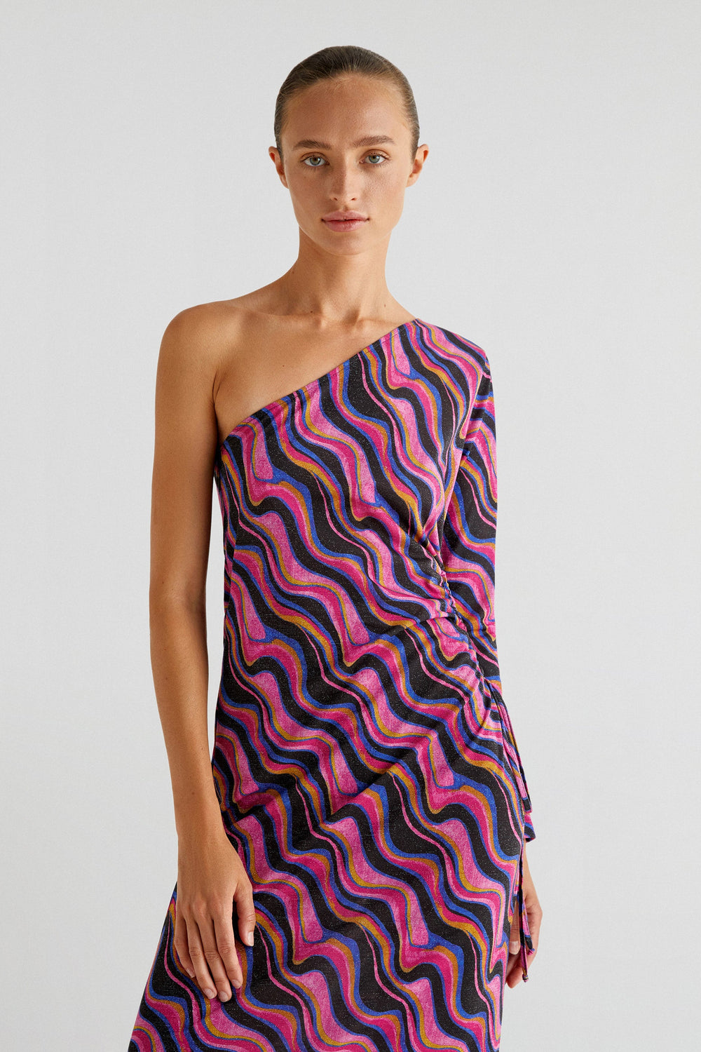 Vestido midi asimétrico con print con lurex. Slim fit, manga larga y cut out lateral.