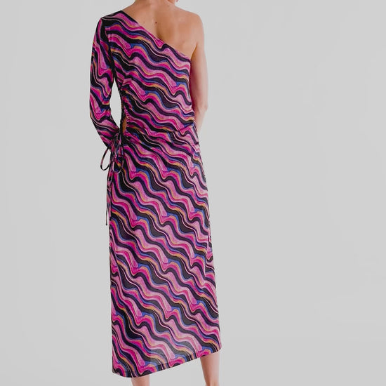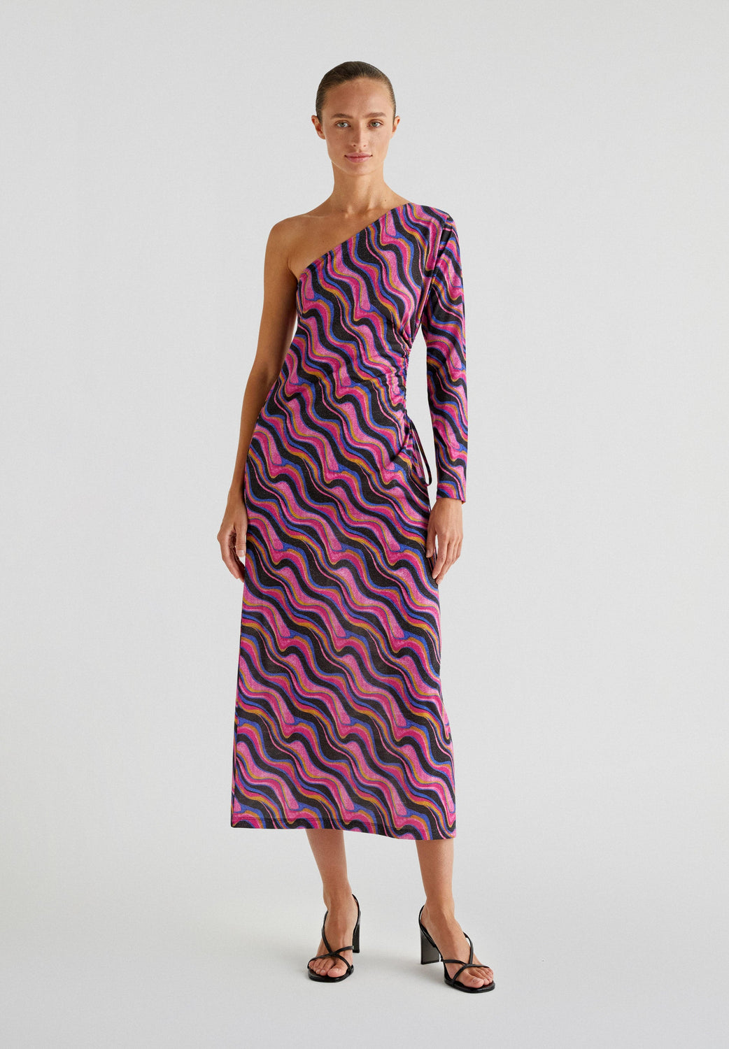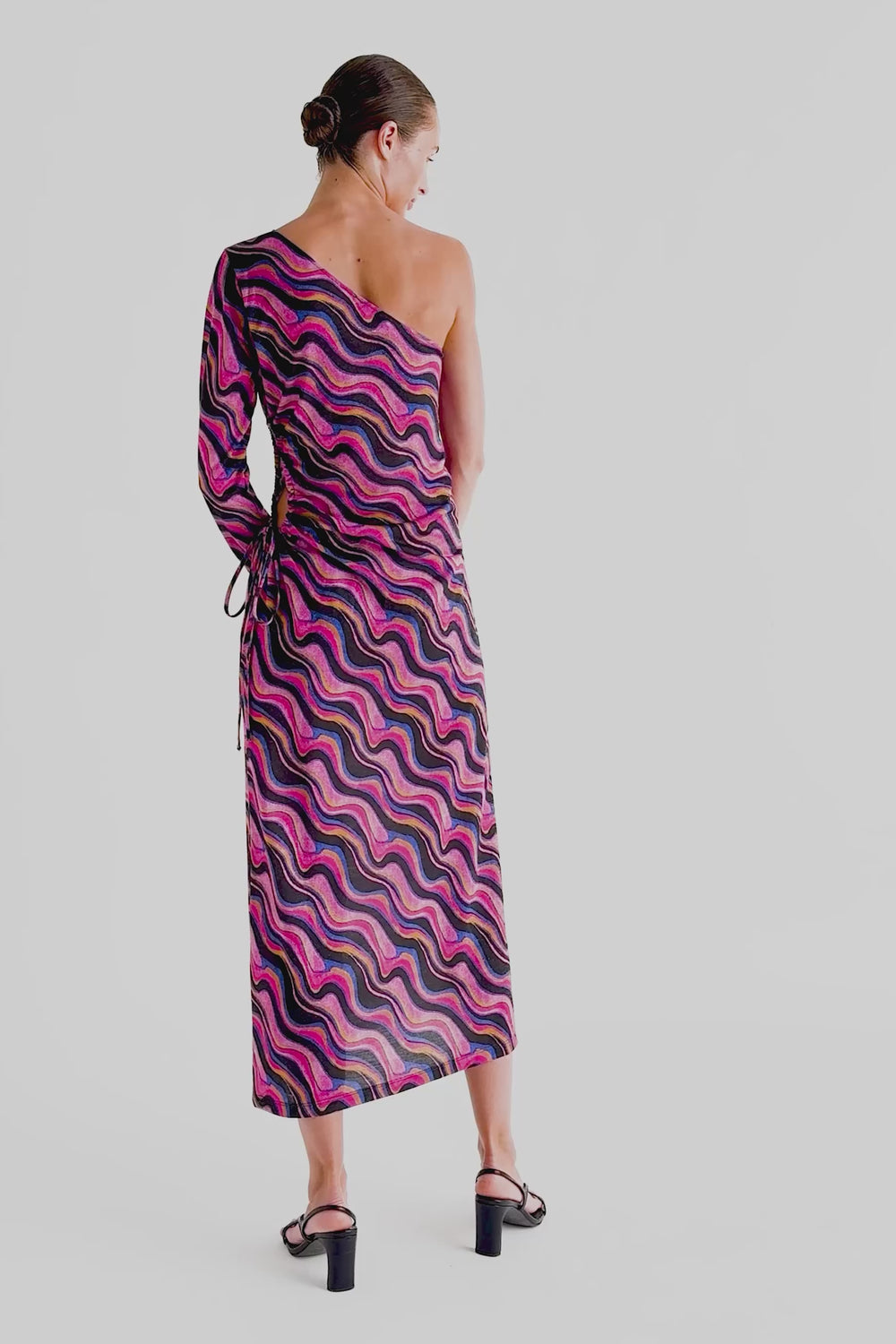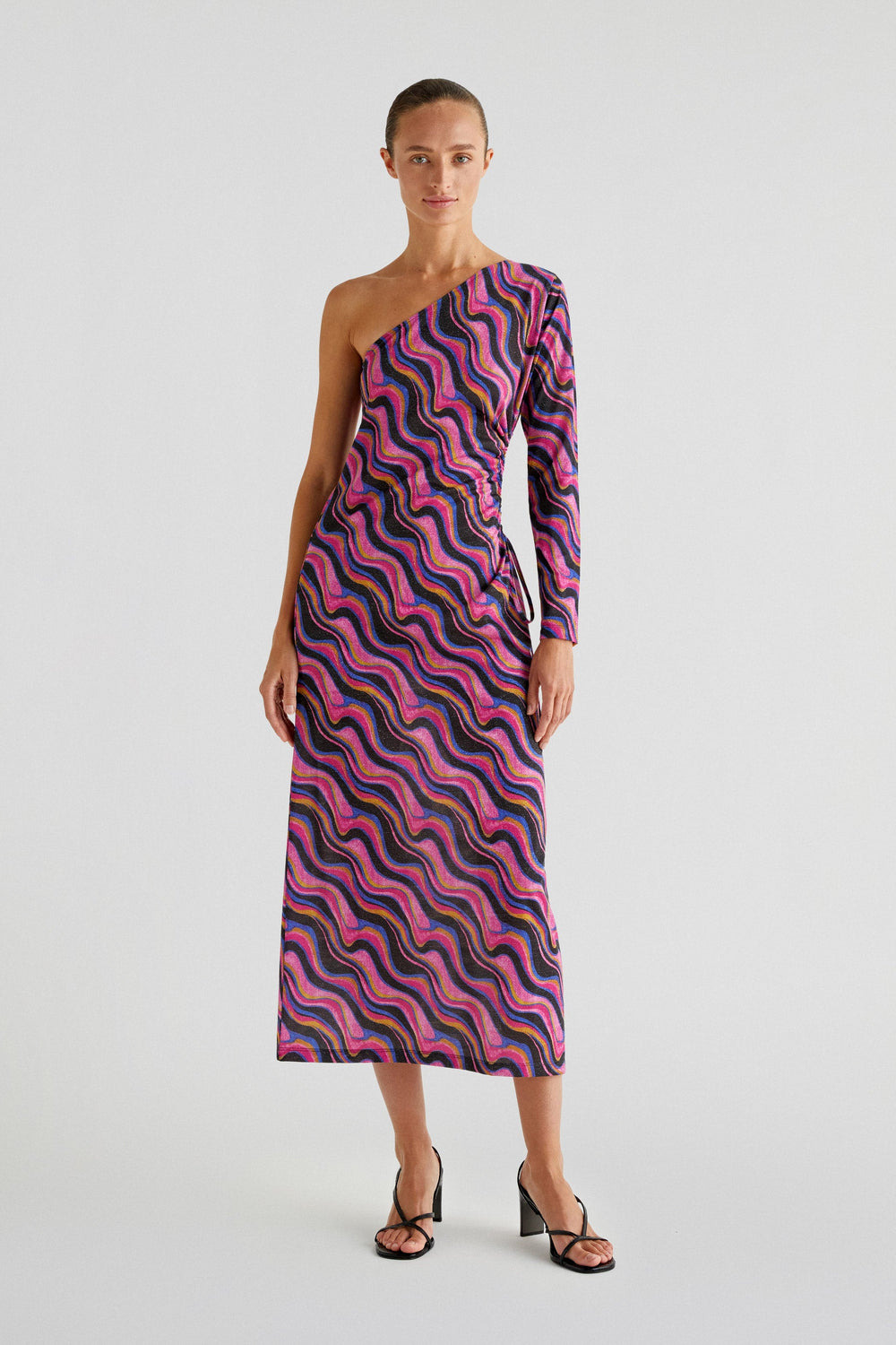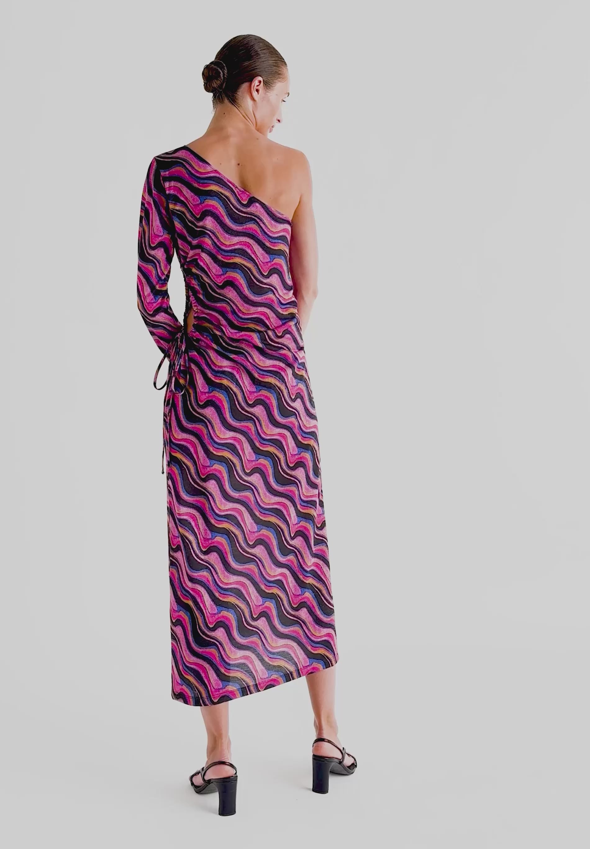 Vestido midi asimétrico con print con lurex. Slim fit, manga larga y cut out lateral.