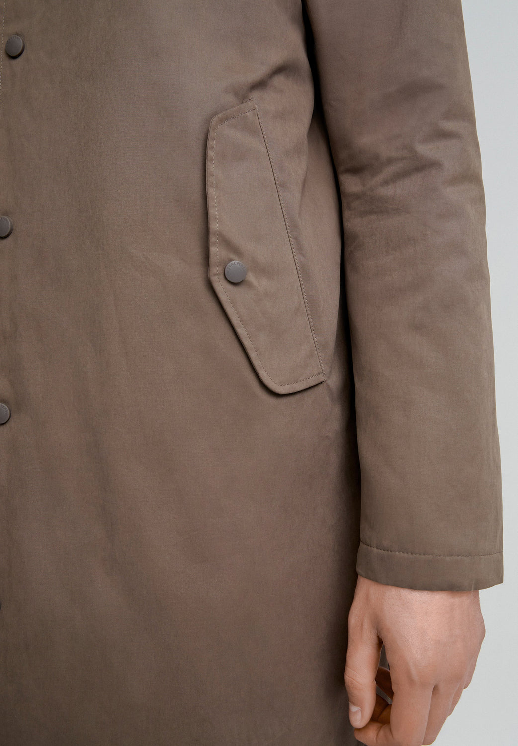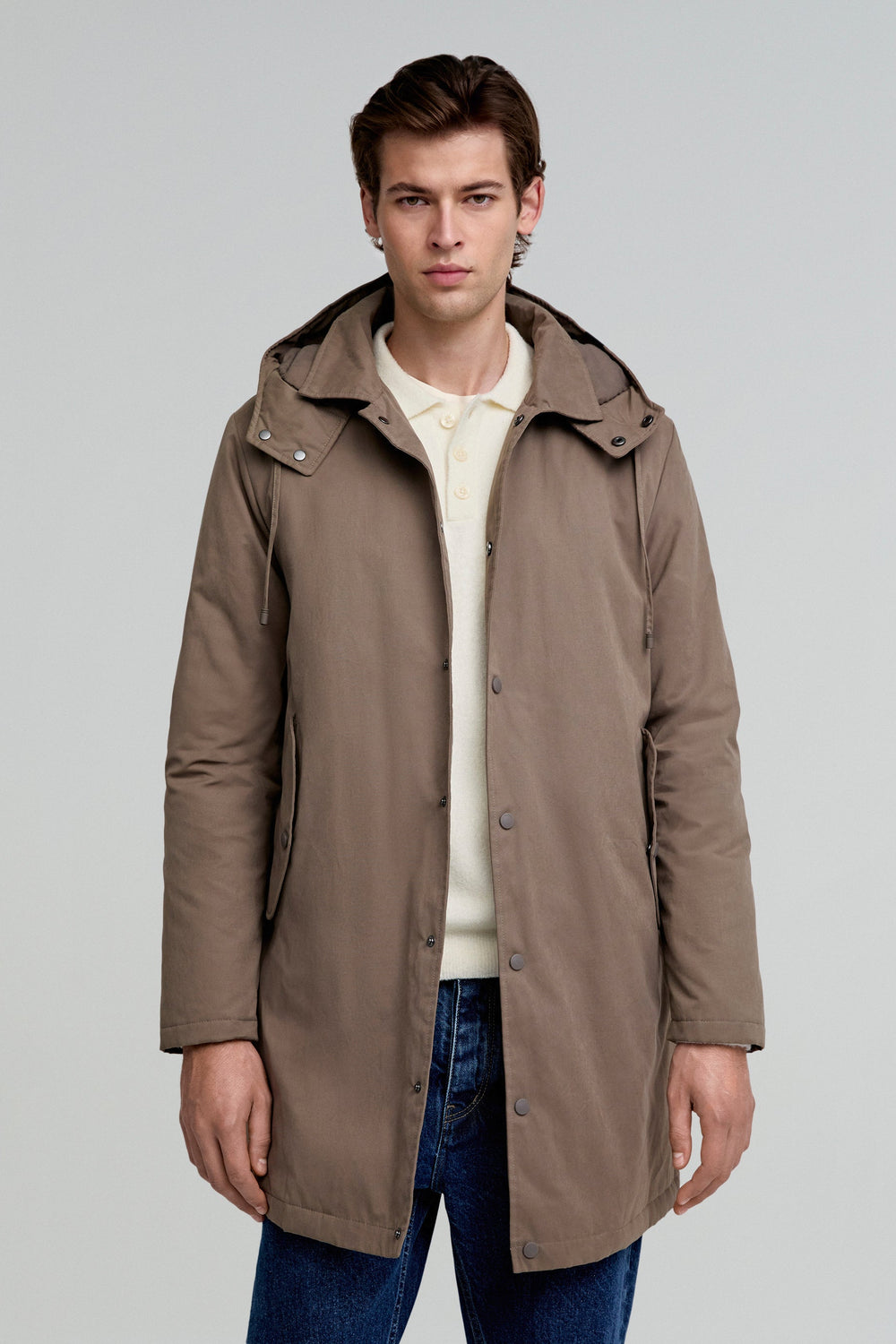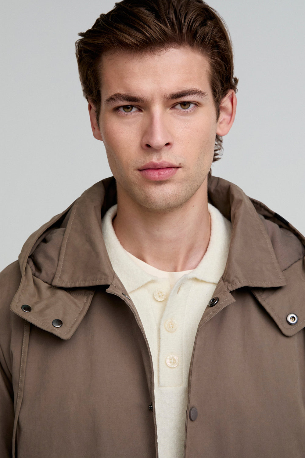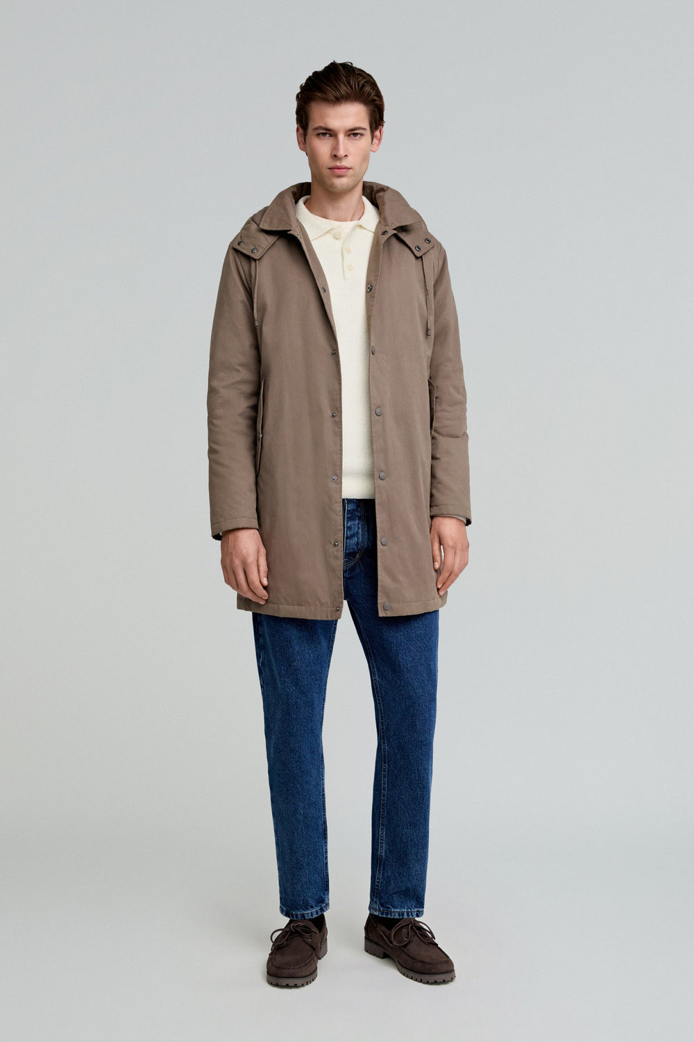 Parka tipo trench confeccionada en tejido técnico. Regular fit, cierre con snaps y cuello clásico con capucha desmontable. Manga larga y bolsillos laterales con tapeta.
