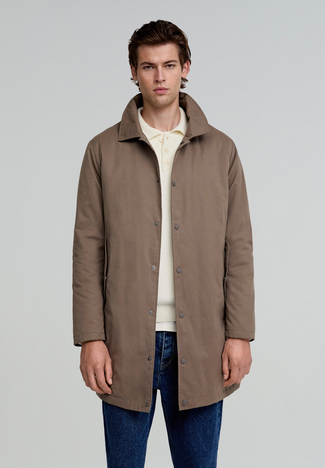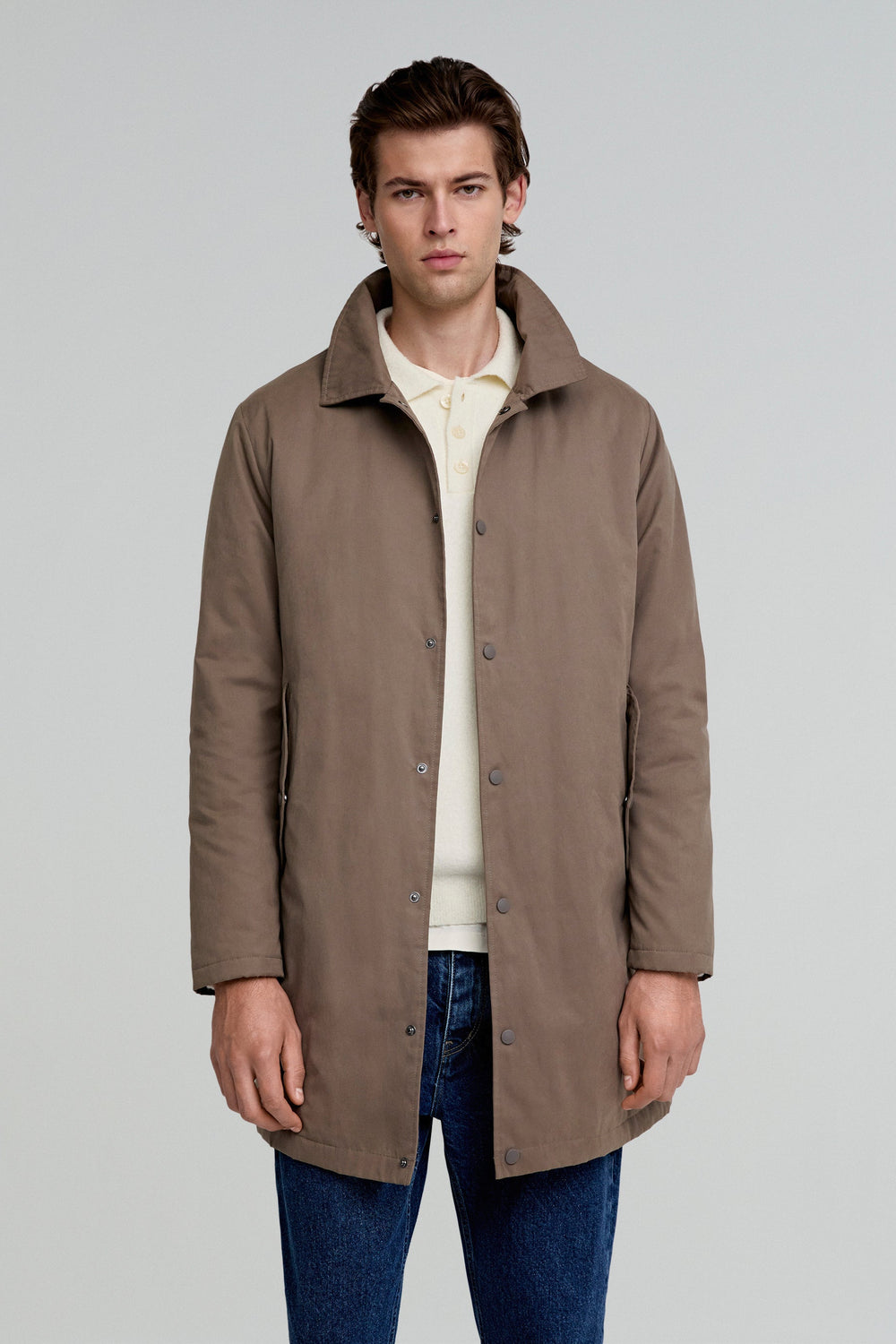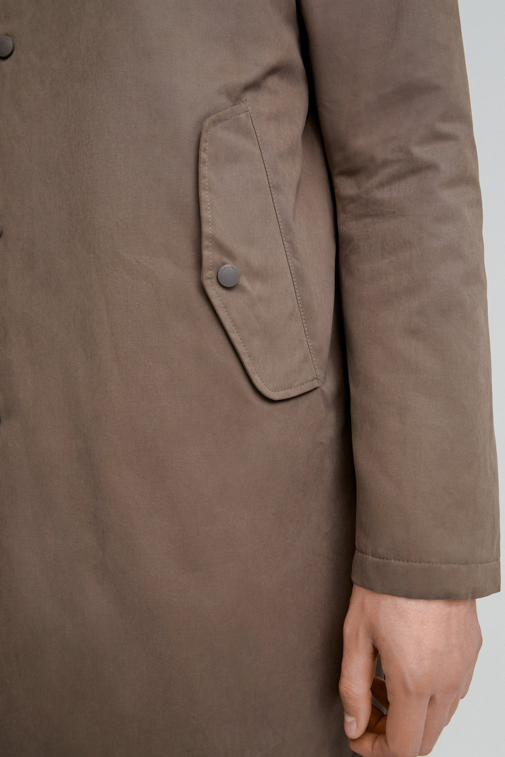 Parka tipo trench confeccionada en tejido técnico. Regular fit, cierre con snaps y cuello clásico con capucha desmontable. Manga larga y bolsillos laterales con tapeta.