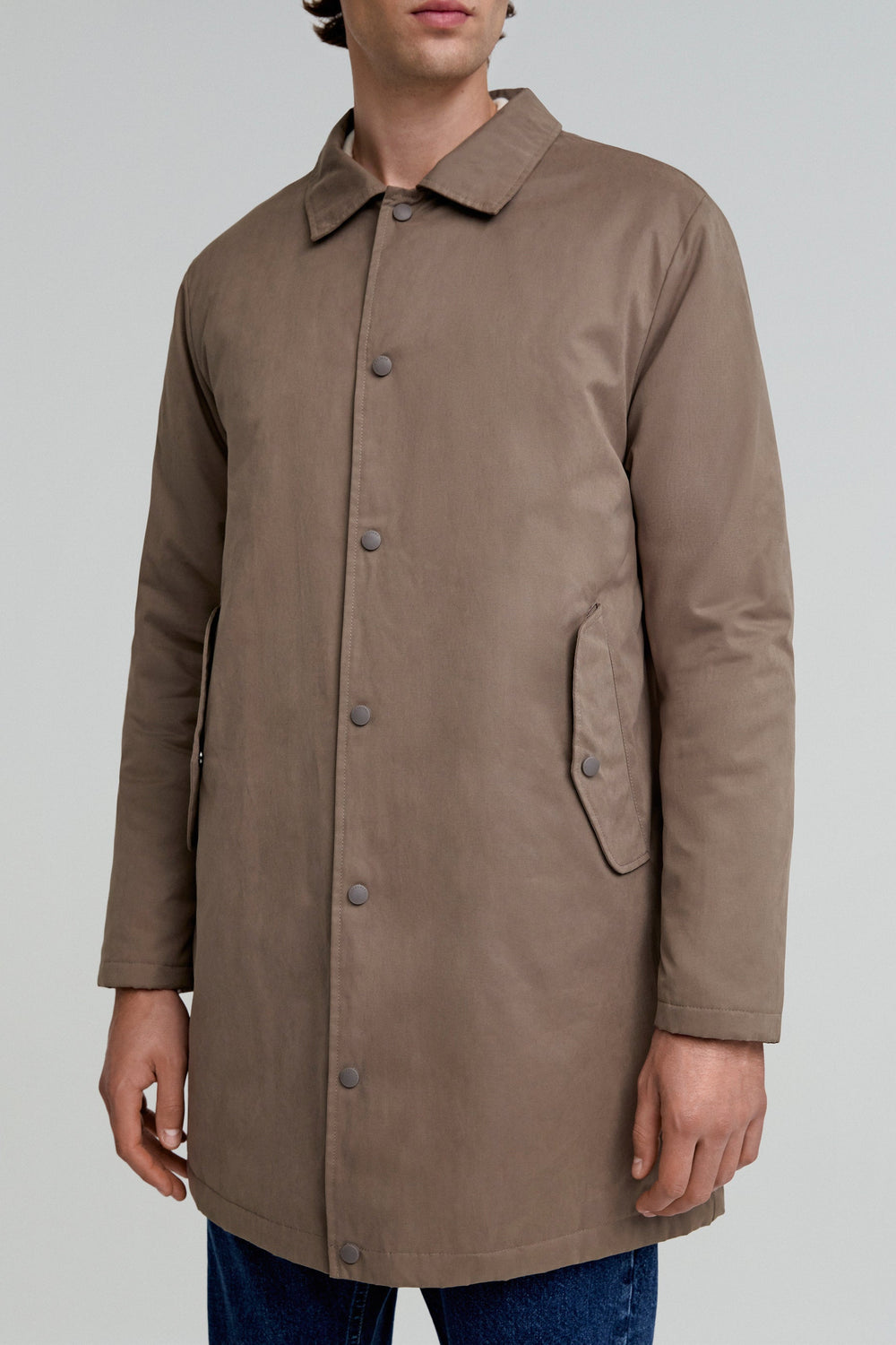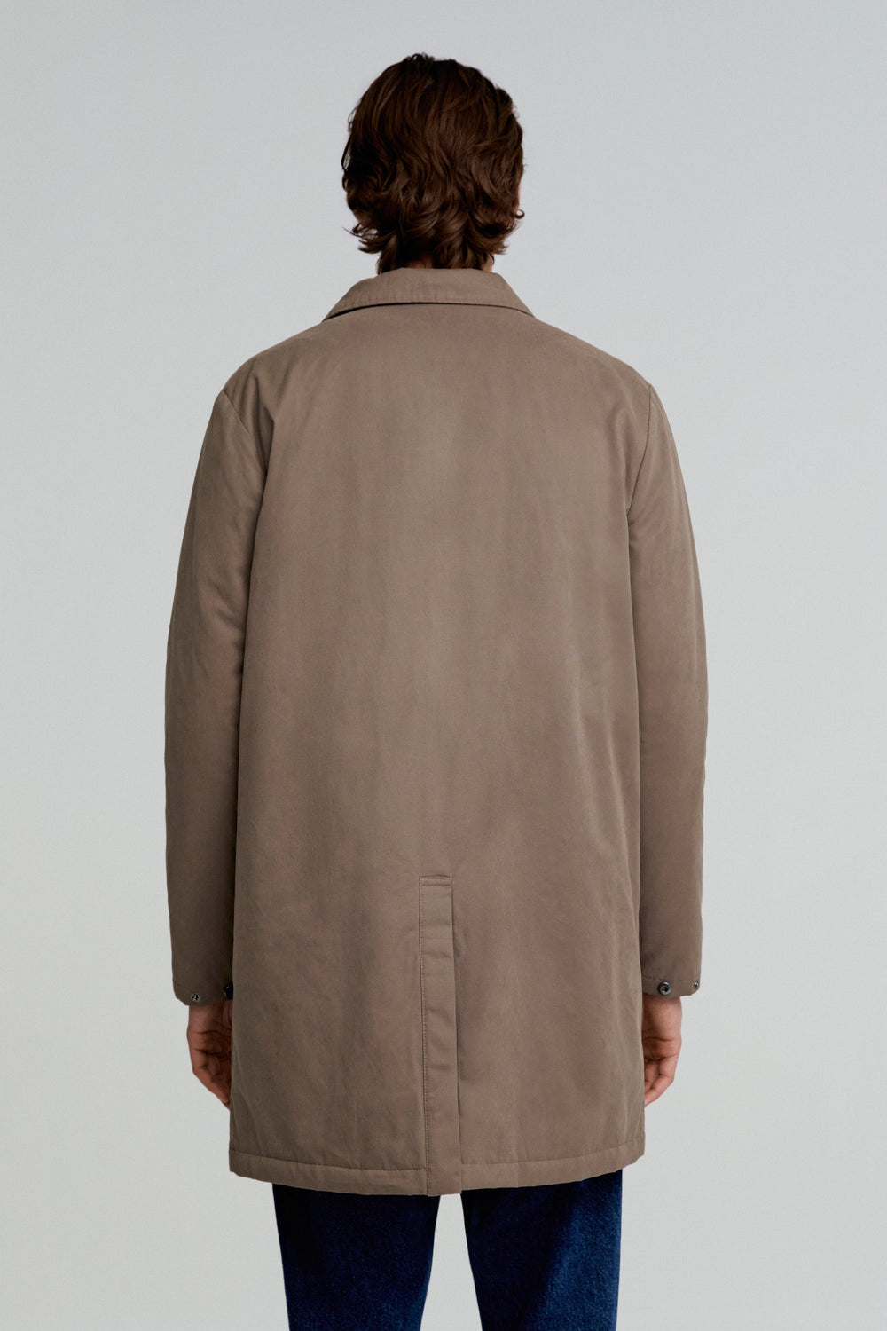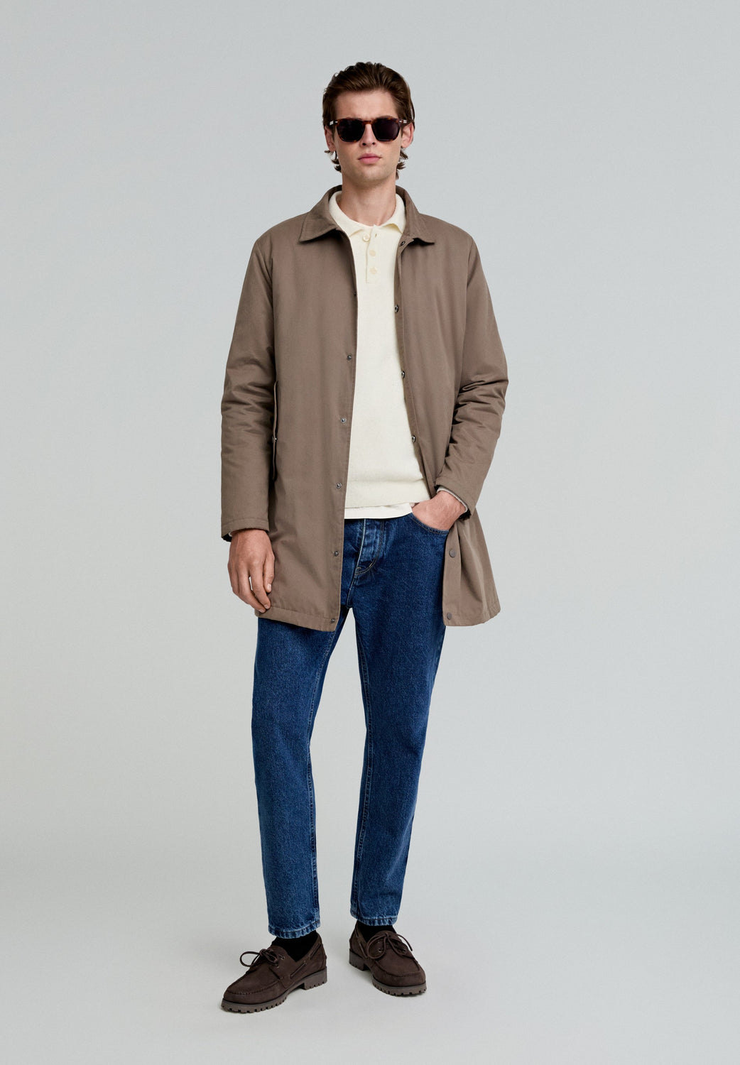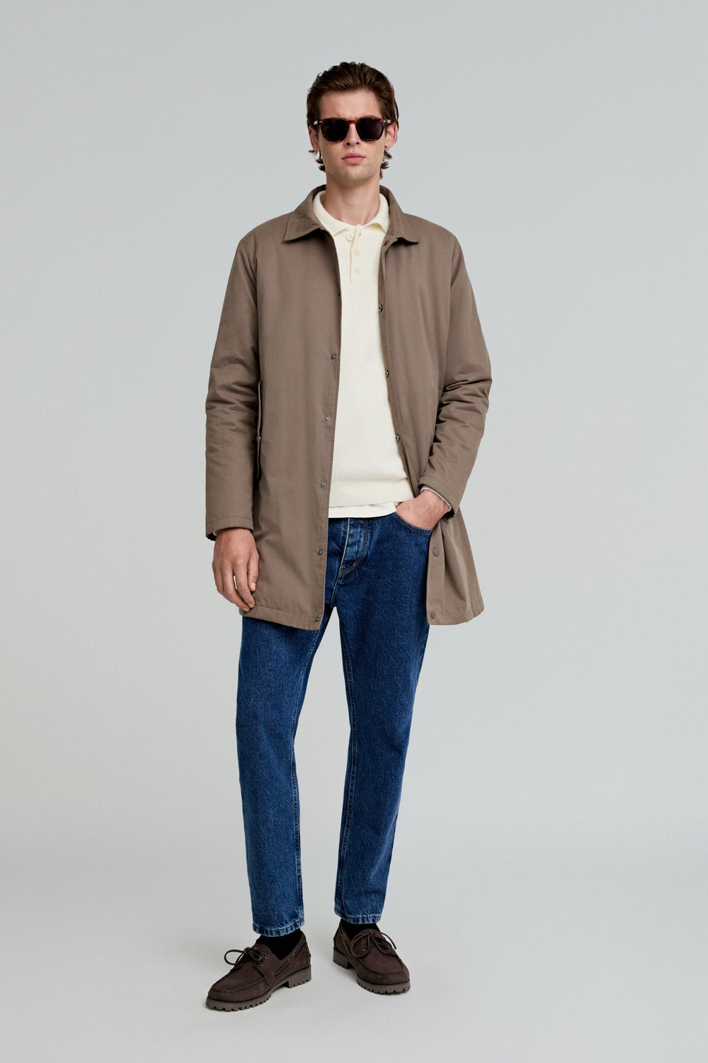 Parka tipo trench confeccionada en tejido técnico. Regular fit, cierre con snaps y cuello clásico con capucha desmontable. Manga larga y bolsillos laterales con tapeta.