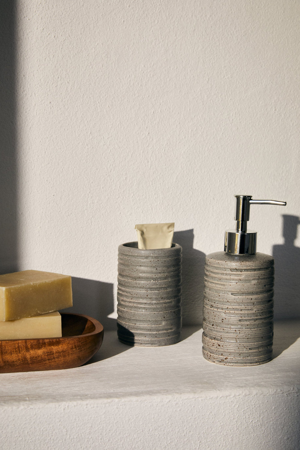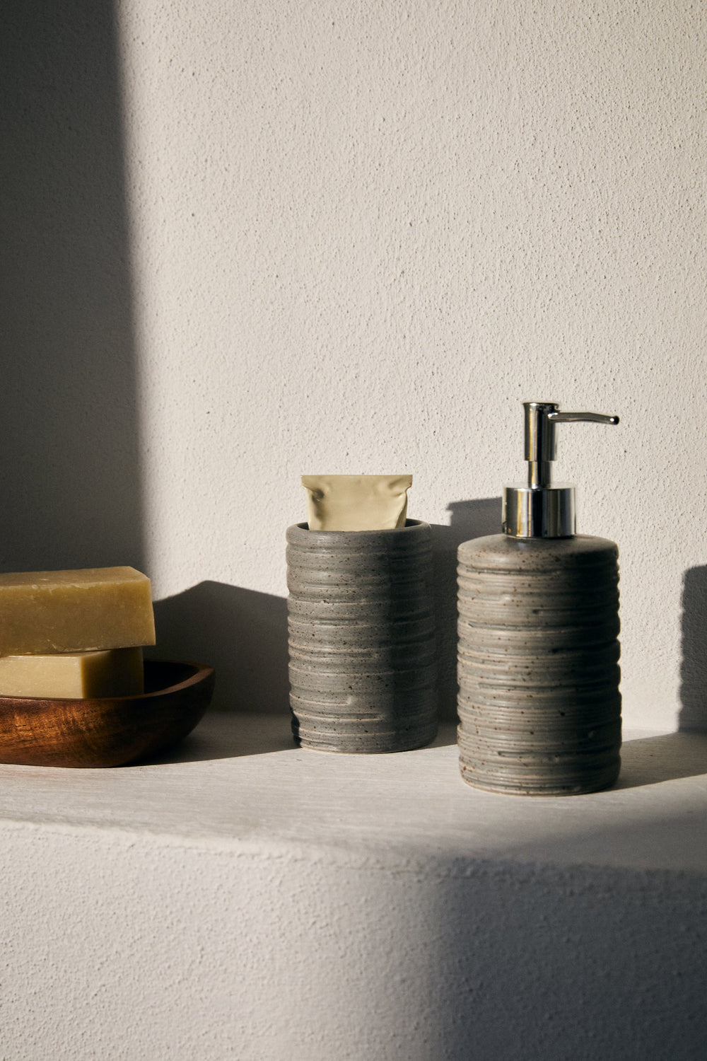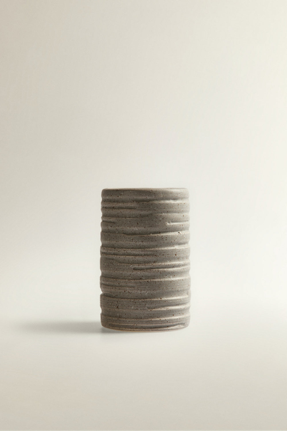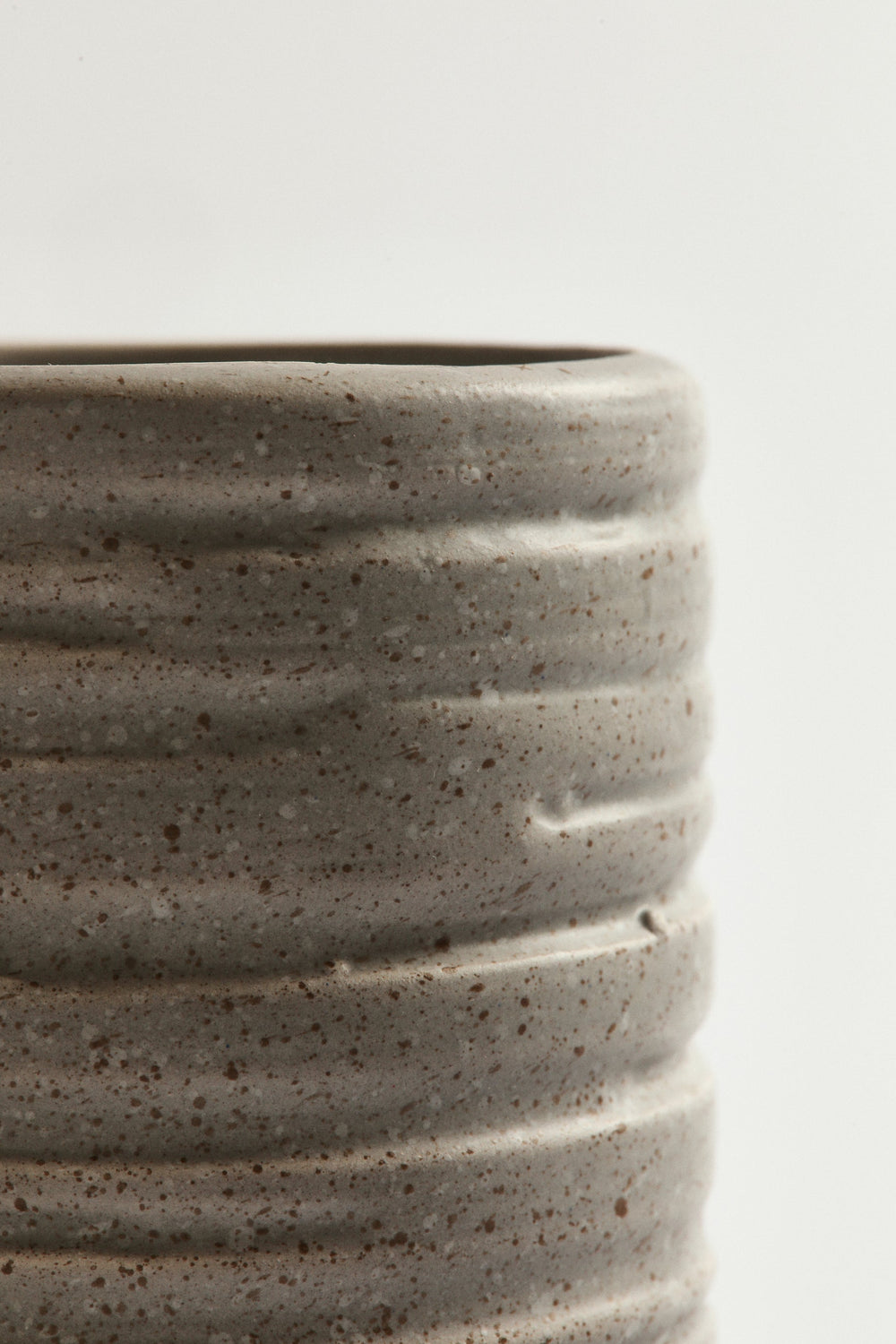 Vaso con acabado de piedra y diseño de líneas en relieve.