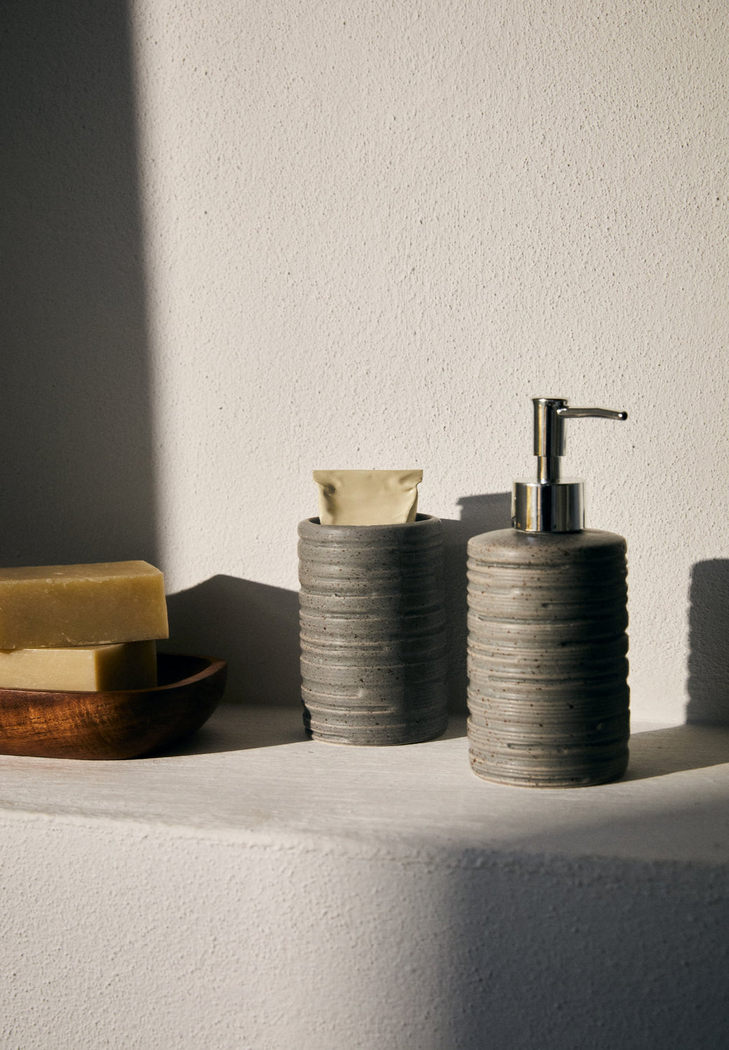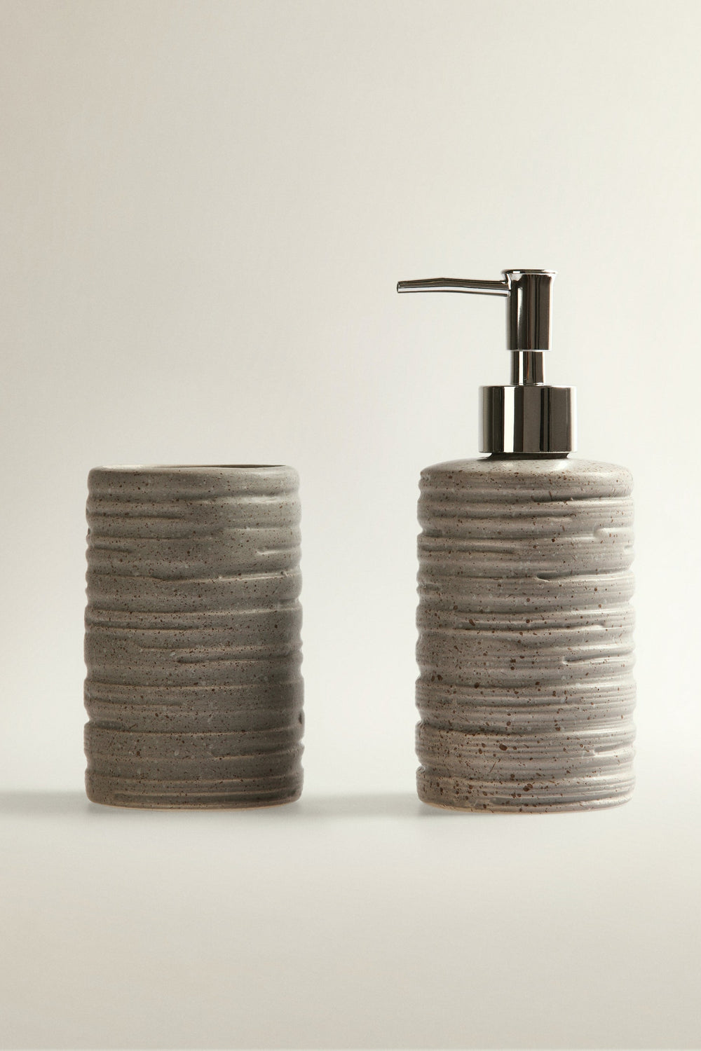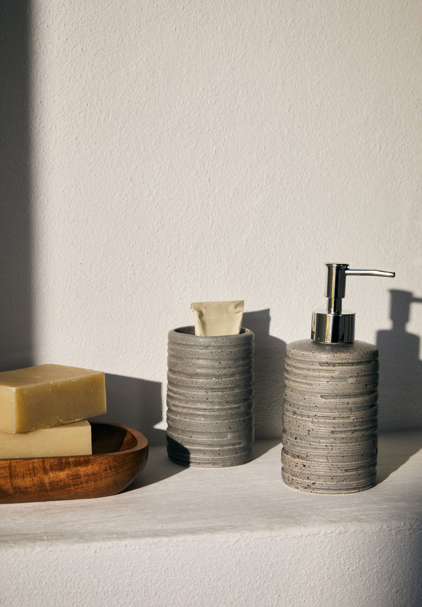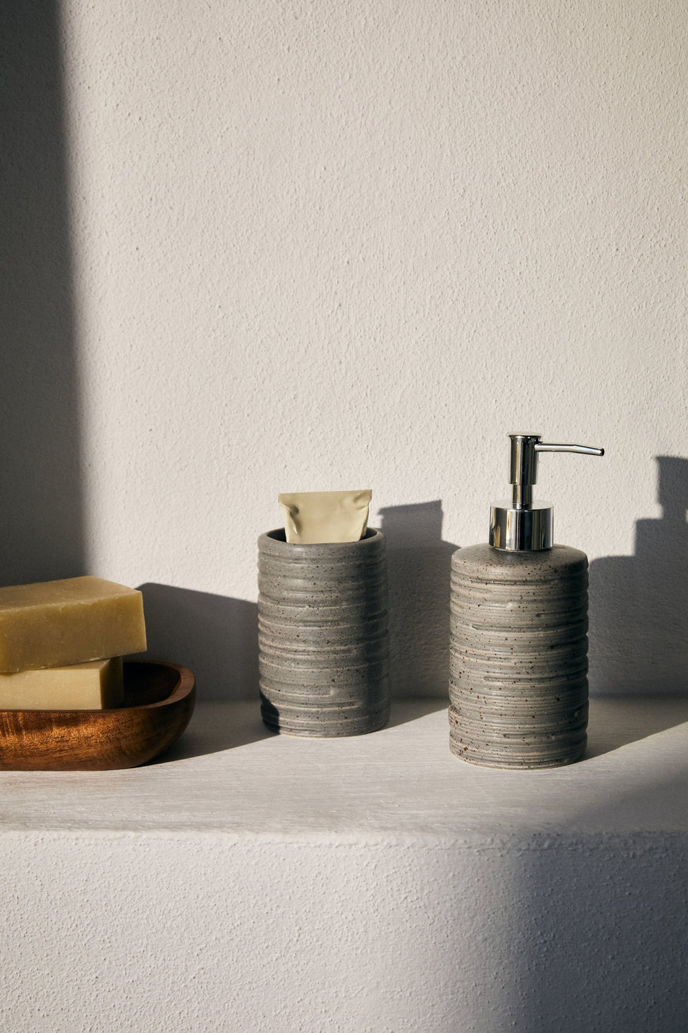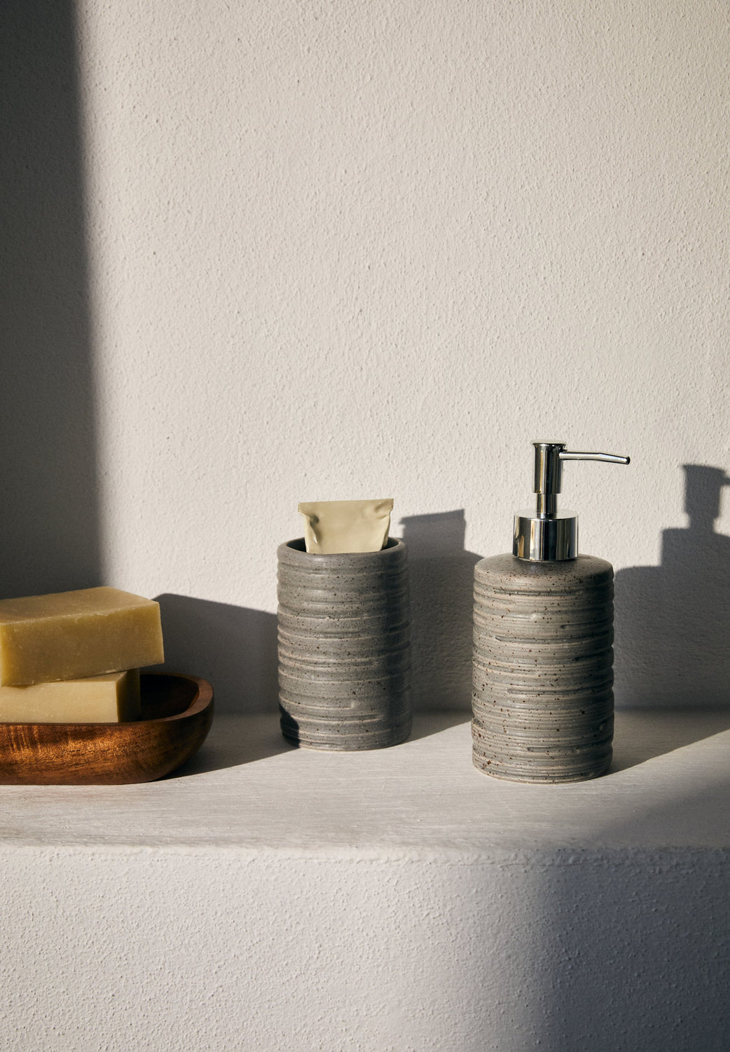 Vaso con acabado de piedra y diseño de líneas en relieve.