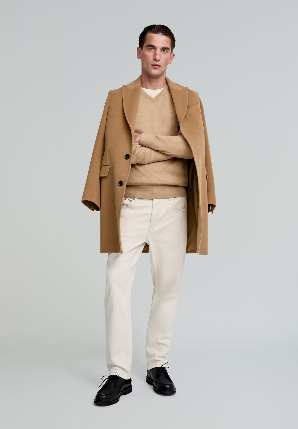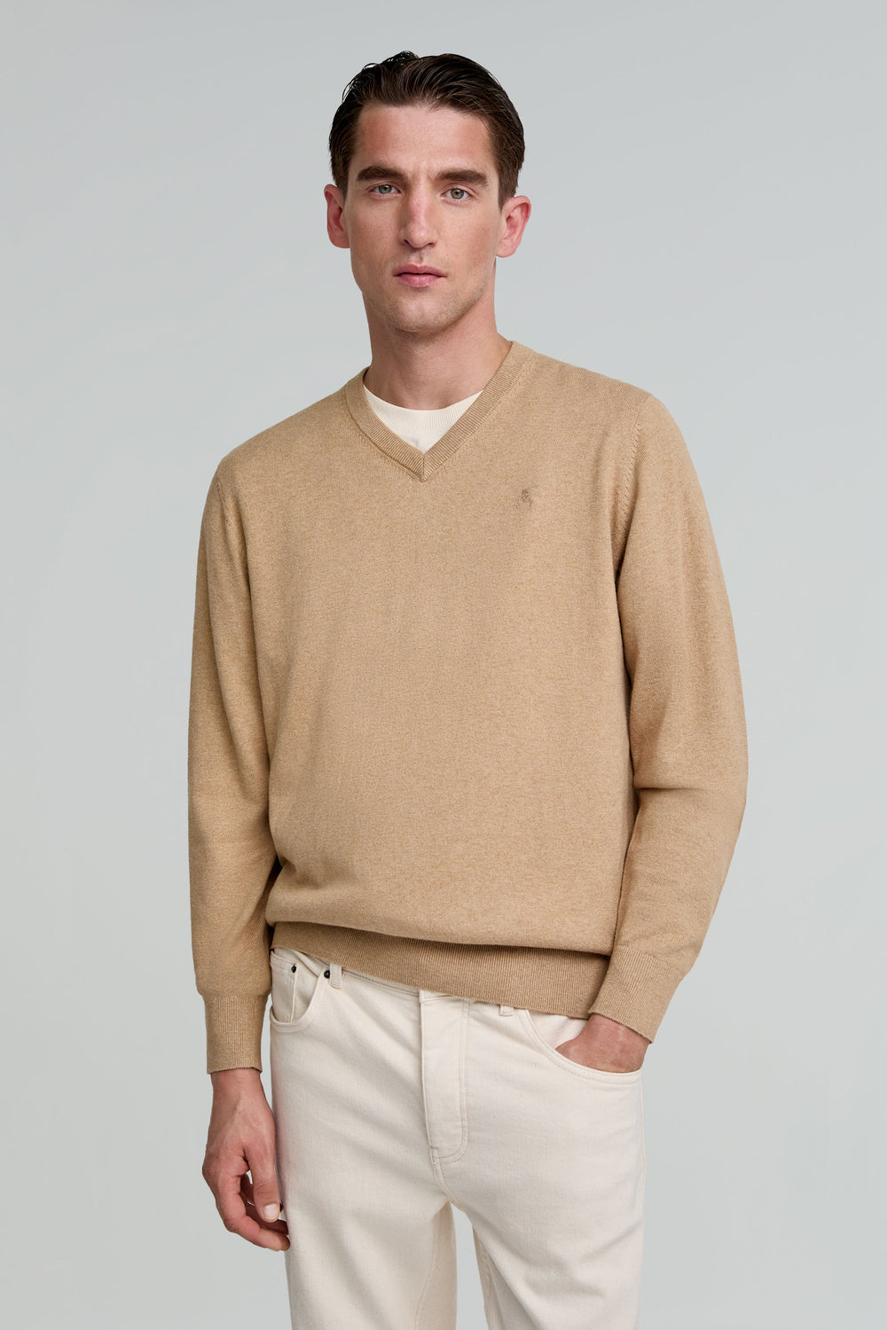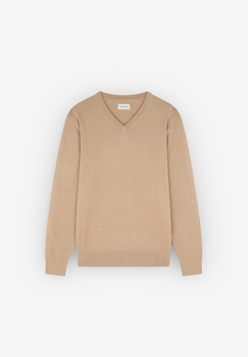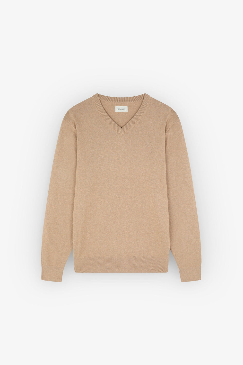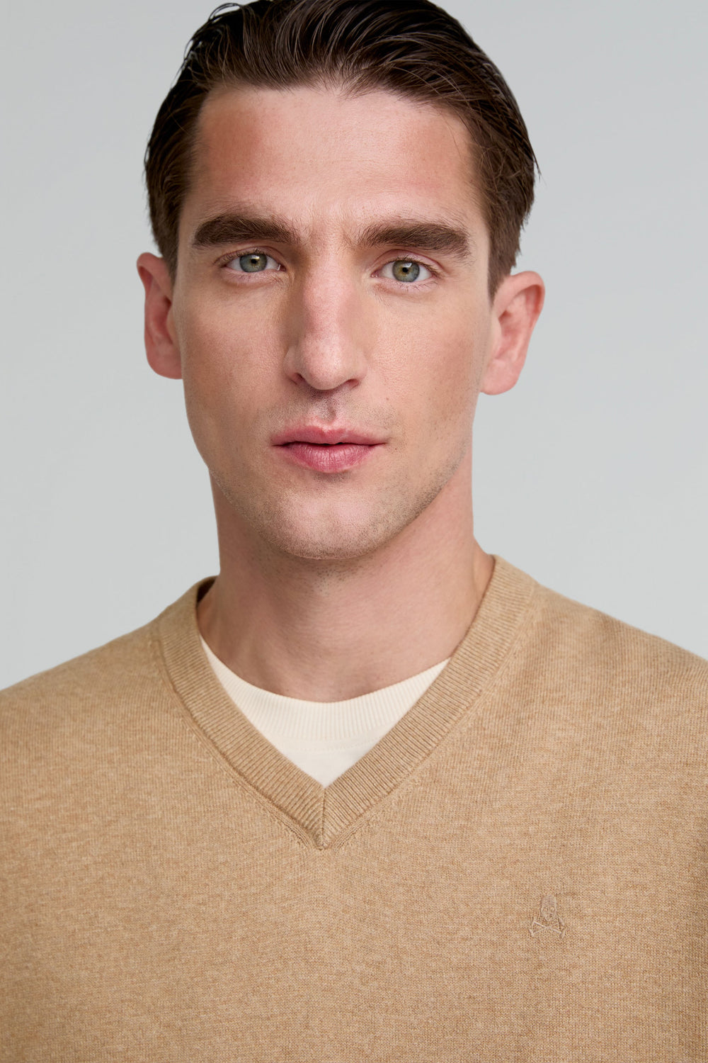 Jersey confeccionado en mezcla de algodón BCI y cashmere. Regular fit, cuello de pico y manga larga. Calavera bordada a tono.