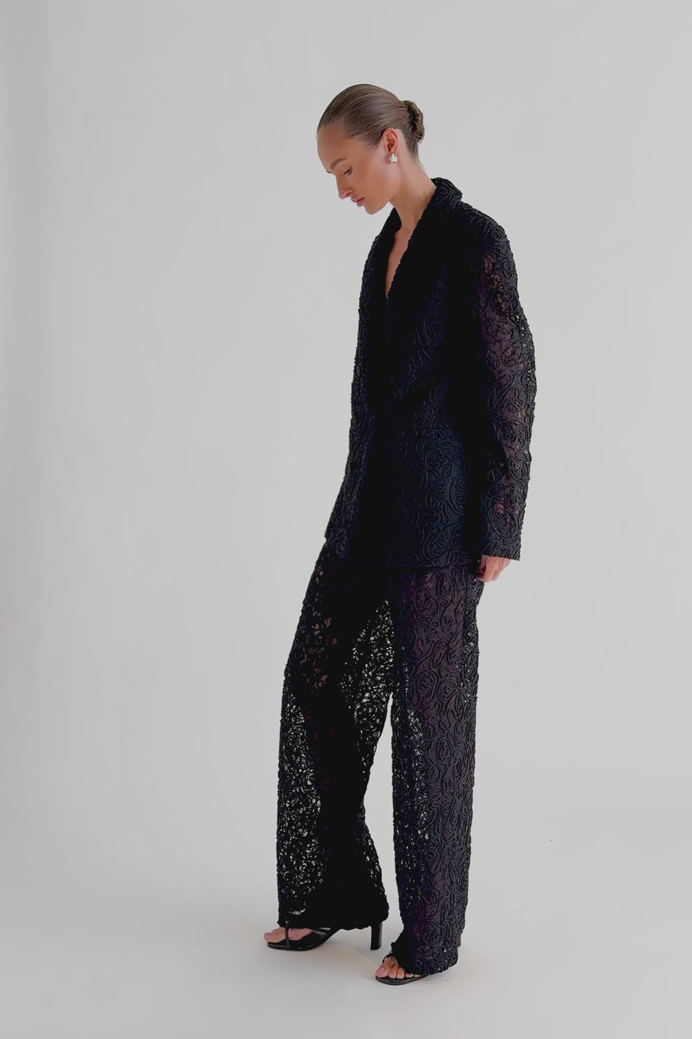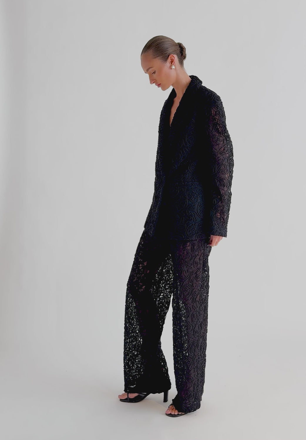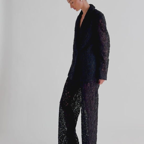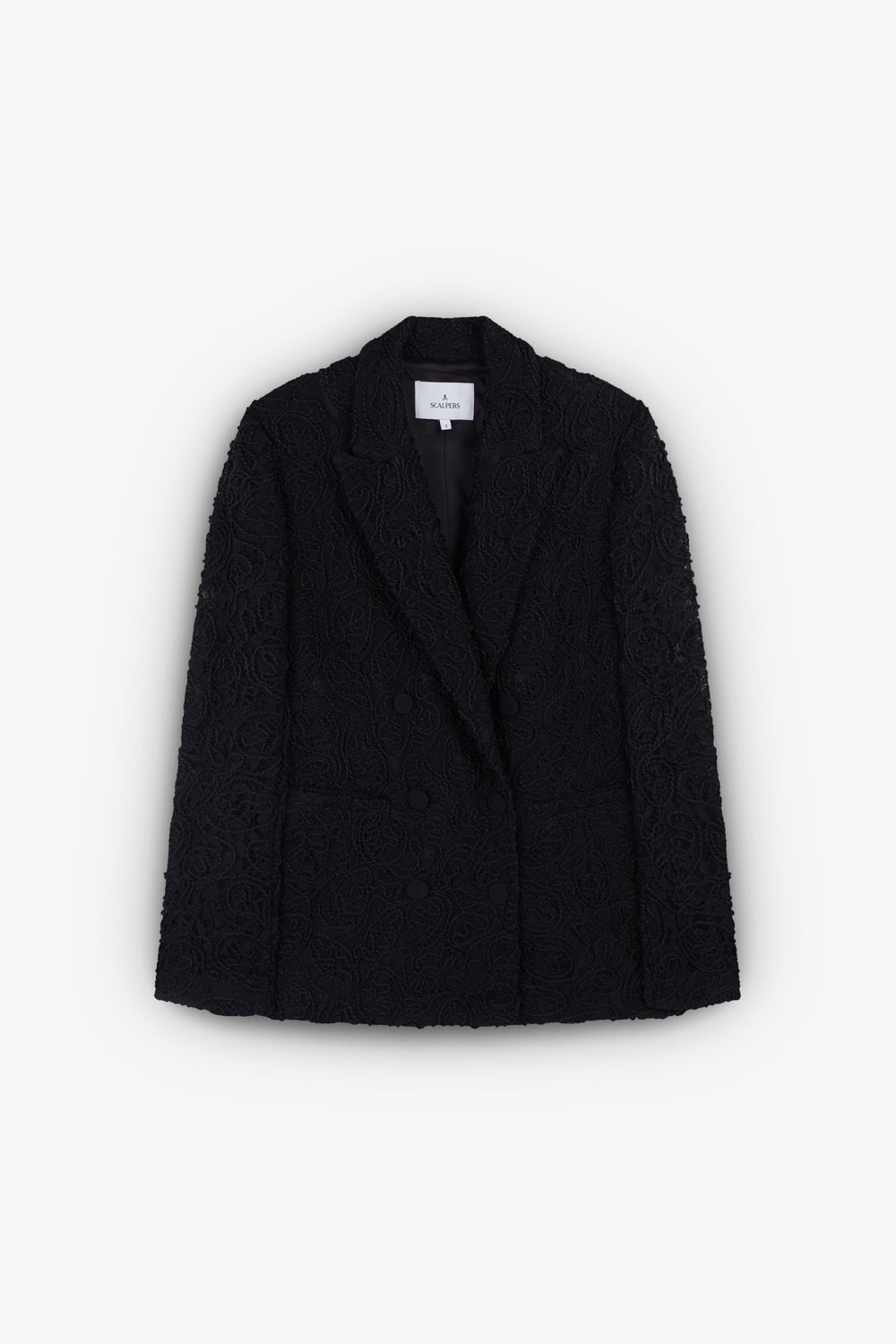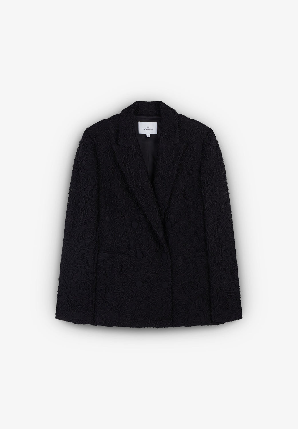 Blazer de encaje bordado confeccionada en tejido de nylon y algodón. Regular fit, cierre cruzado con botones y manga larga. Bolsillos laterales.