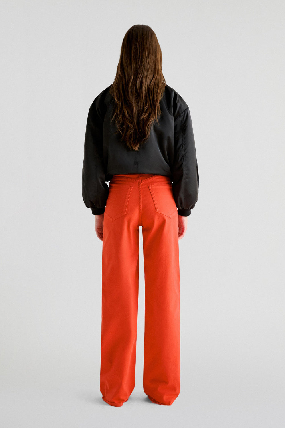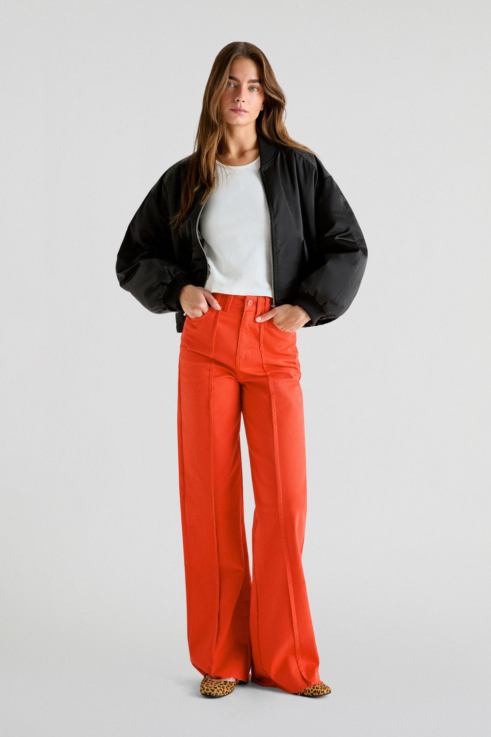 Jeans con costura marcada confeccionada en tejido de algodón ligeramente elástico. Corte full lenght slim y cierre con botón y cremallera. Bolsillo delantero y trasero.