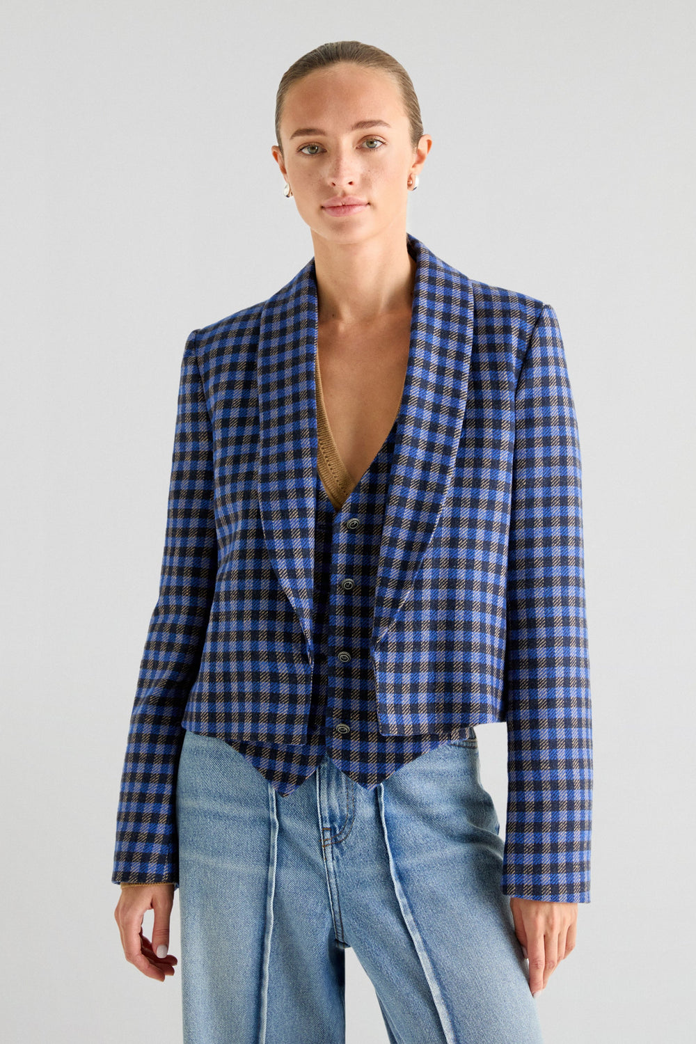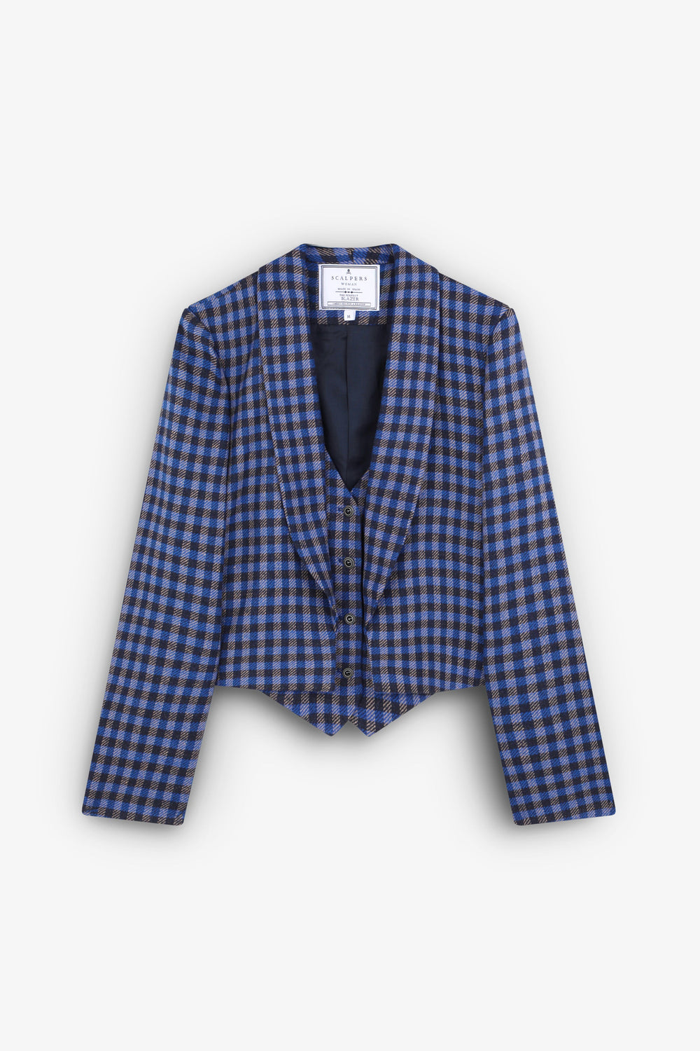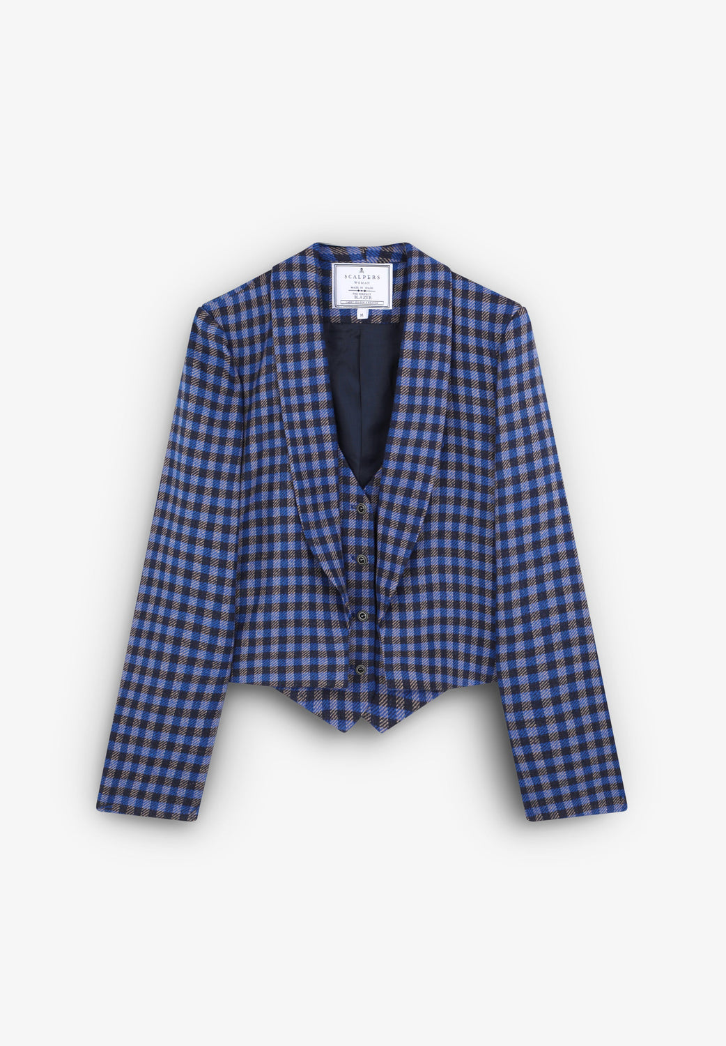 Blazer con chaleco integrado de cuadros confeccionada en mezcla de lana. Regular fit ligeramente cropped, cuello con solapas y cierre con botones en el chaleco. Manga larga.
