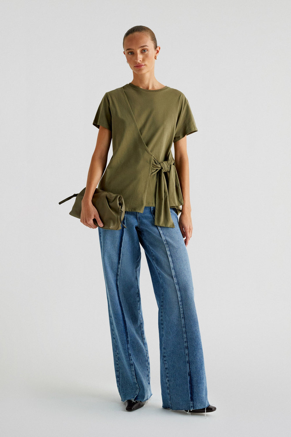 Camiseta con nudo lateral confeccionada en 100% algodón. Regular fit, cuello redondo y manga corta.
