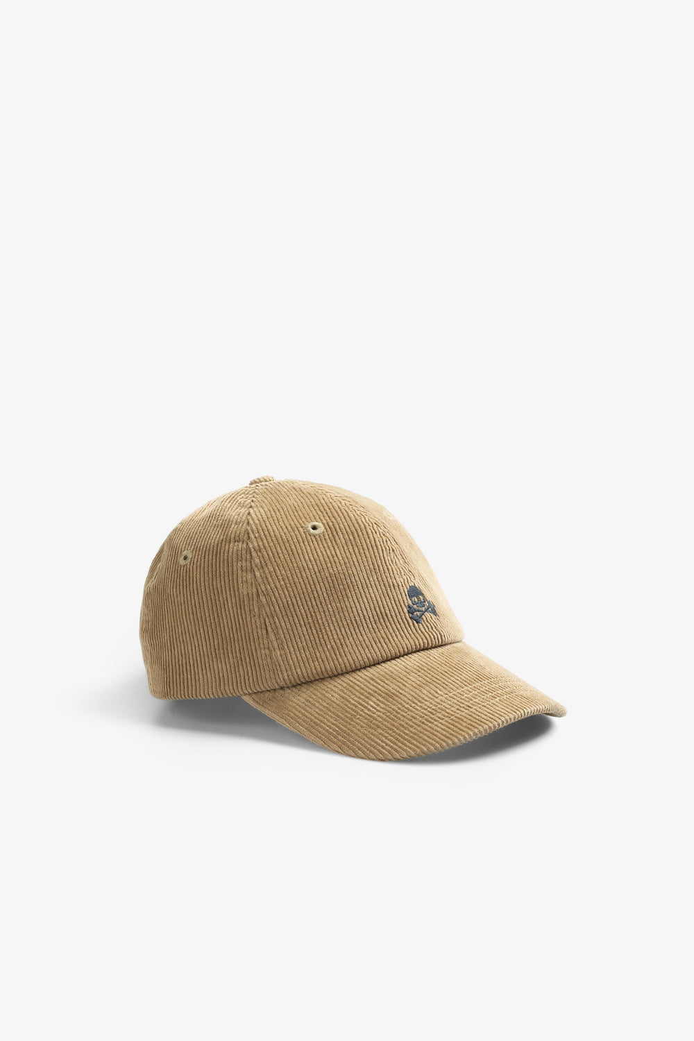 Gorra de pana confeccionada en 100% algodón. Cierre ajustable trasero y calavera a contraste.