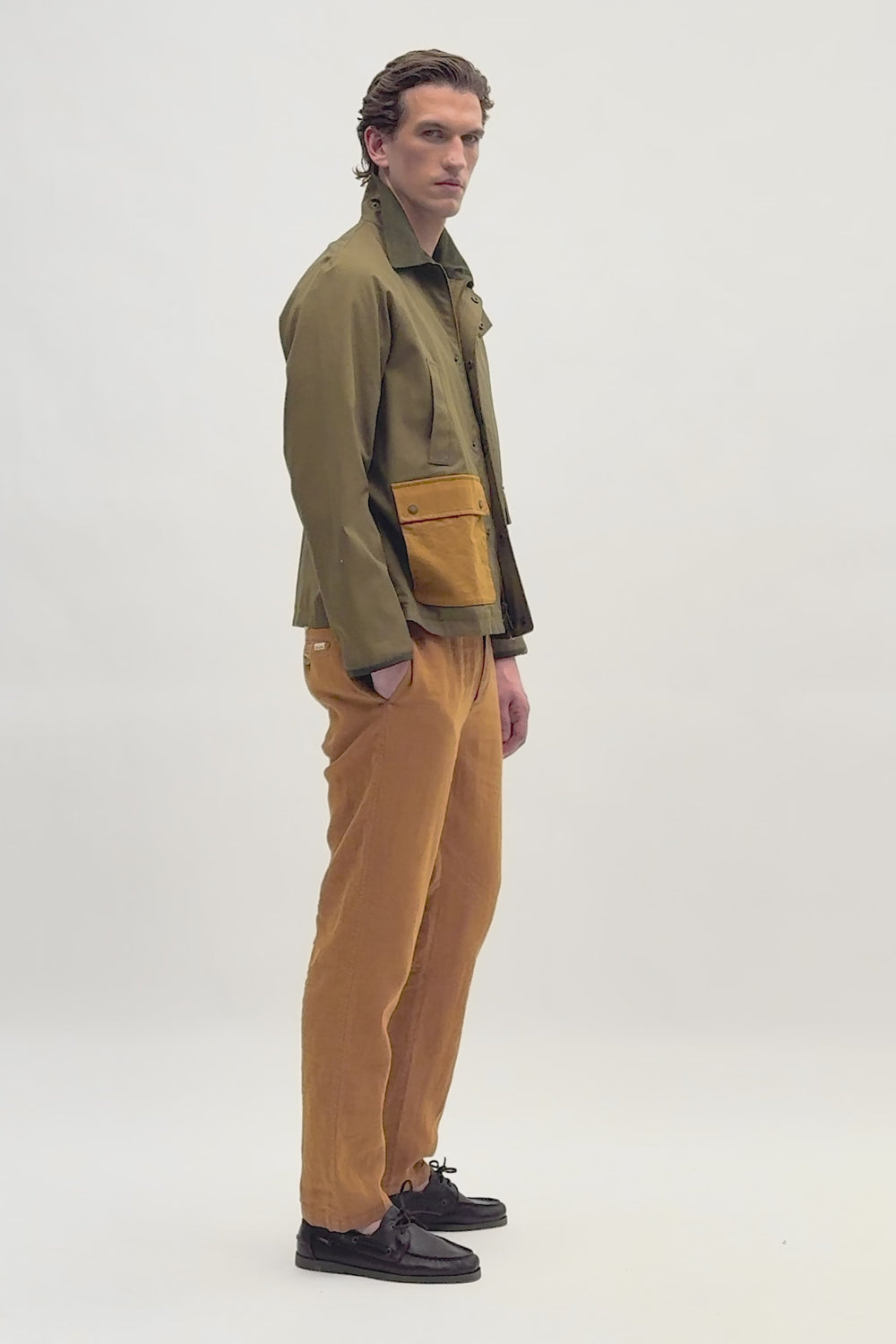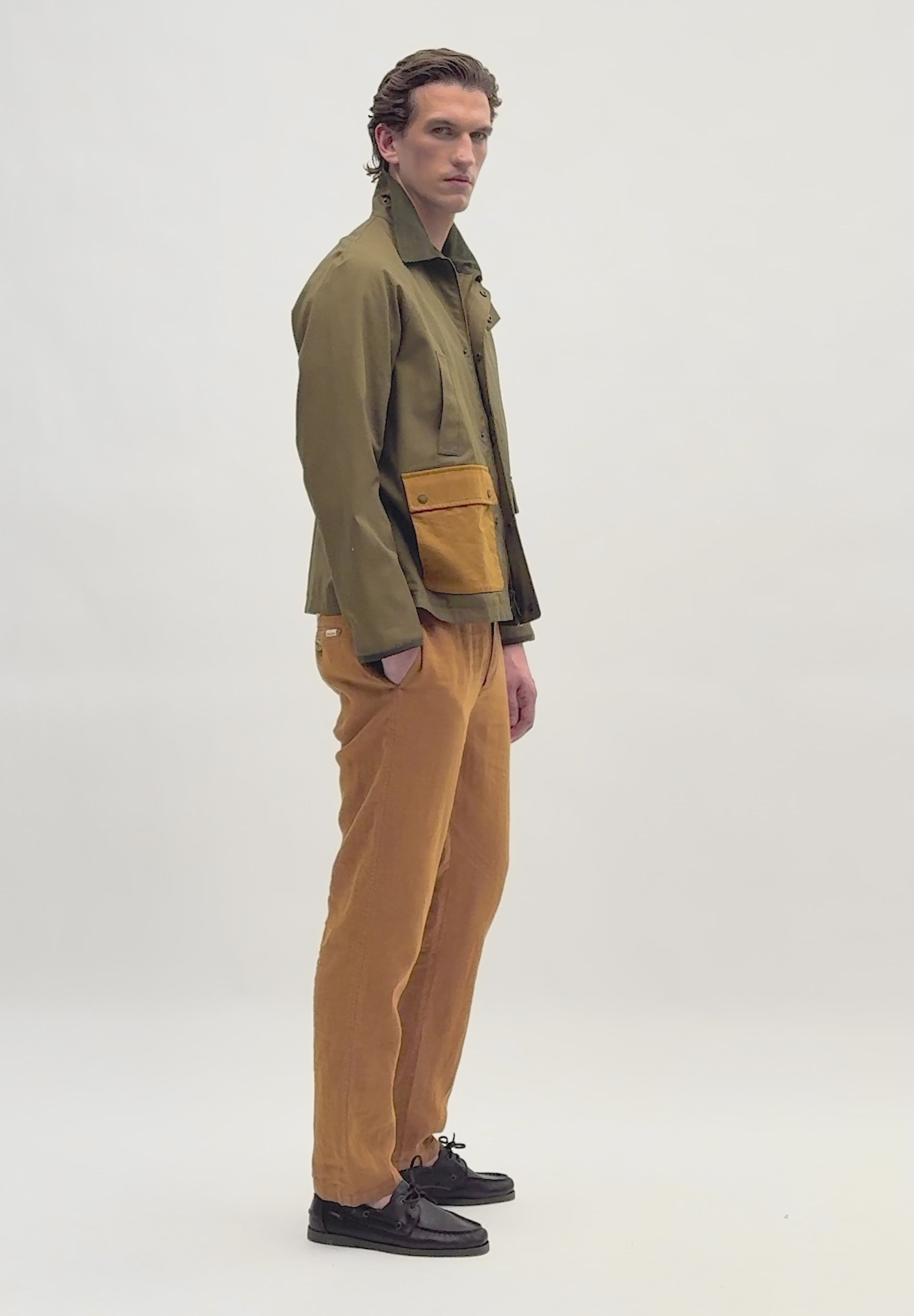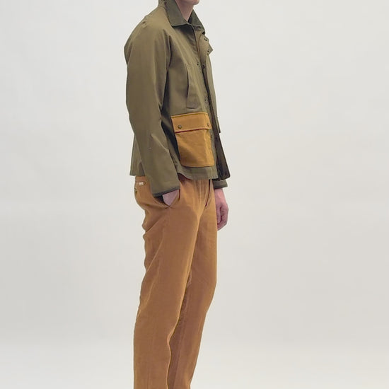 Parka ligera. Confeccionada en algodón 100% BCI con cuello camisero de pana y cierre con cremallera de doble carro y tapeta con snaps. Bolsillos frontales ocultos y bolsillos con cierre de tapeta con snaps bicolor. Acabado de rib en el puño.