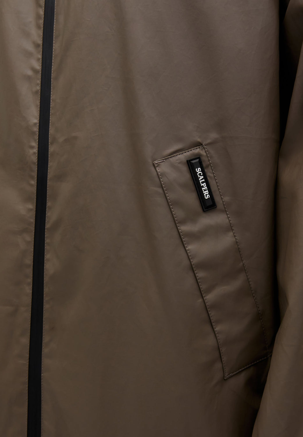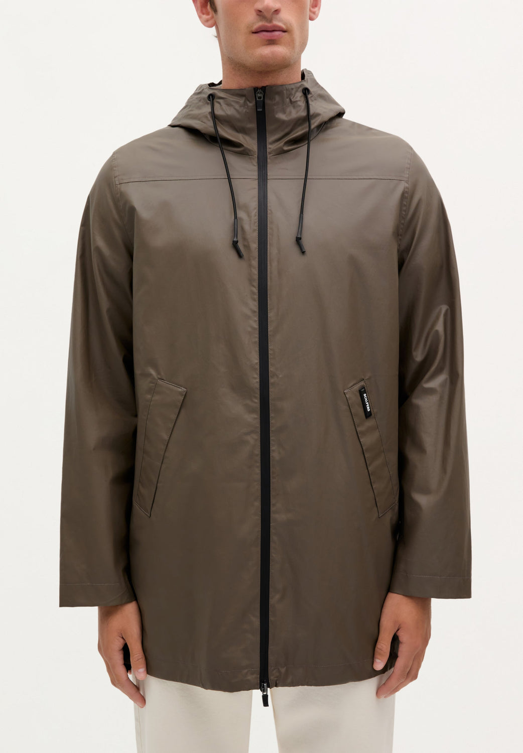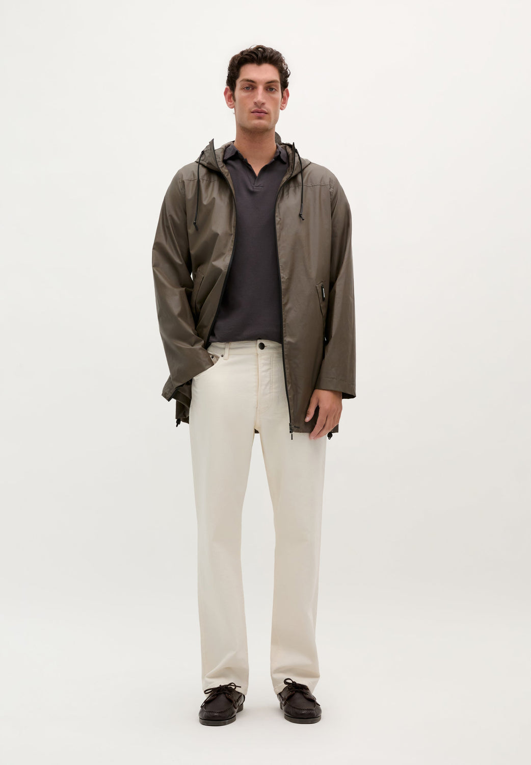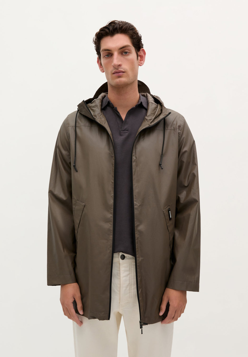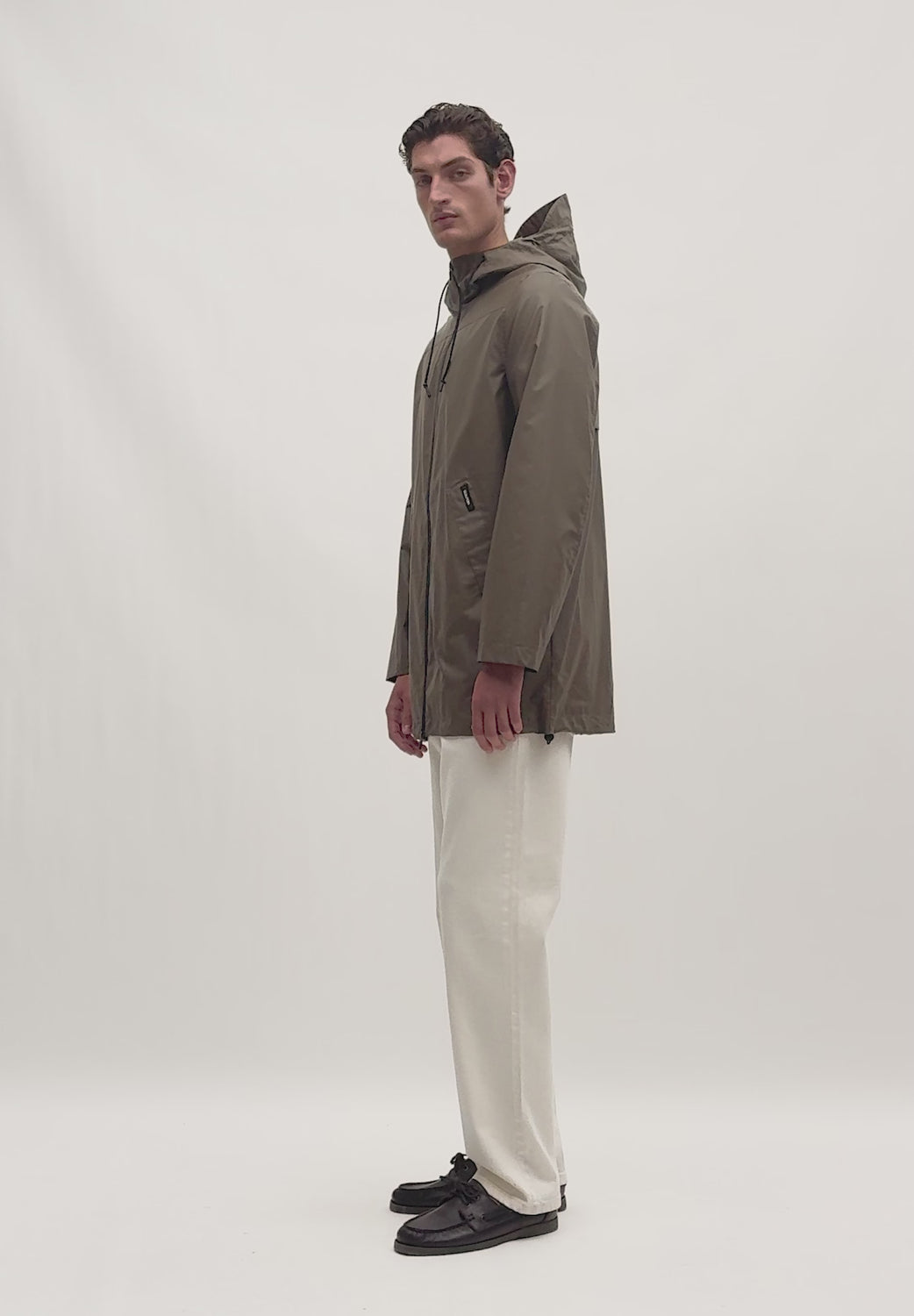 Parka impermeable tipo chubasquero. Confeccionada en 100% algodón resinado. Cuello con capucha ajustable con cordón. Cierre con cremallera termosellada. Manga larga. Bolsillos laterales con tapeta y snap. Detalle en la espalda.
