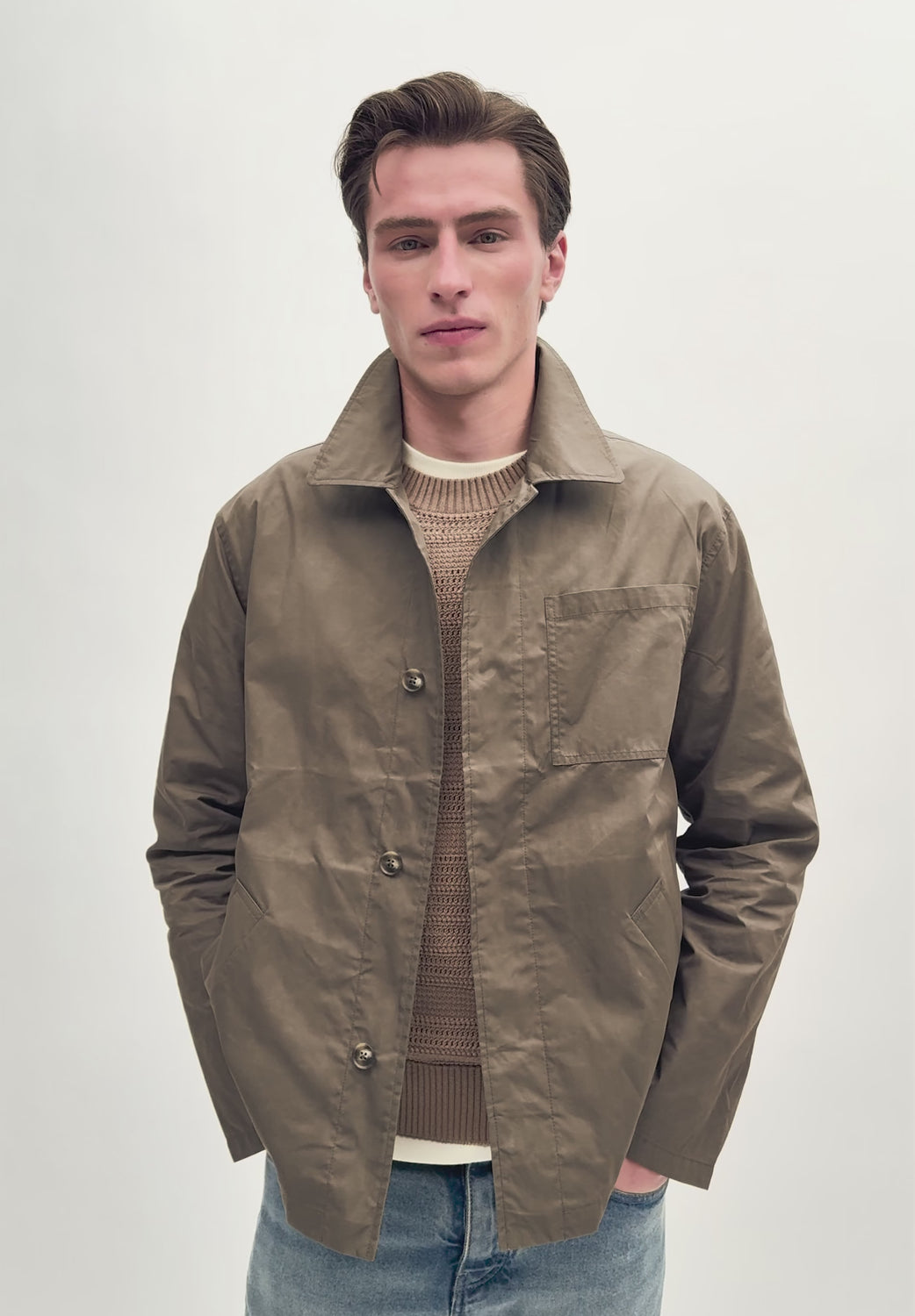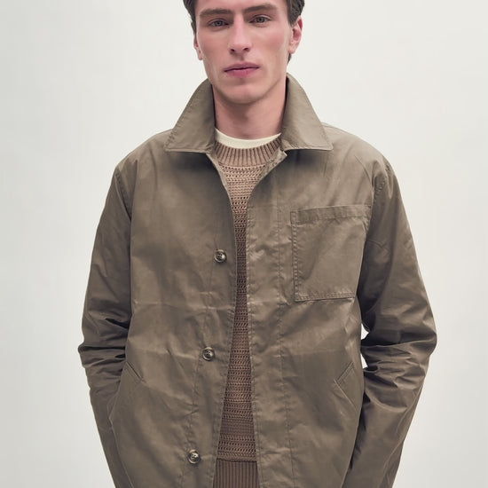 Sobrecamisa confeccionada en mezcla de algodón con efecto encerado. Corte Regular Fit, cuello camisero y manga larga. Bolsillo en pecho y bolsillos inclinados laterales con detalle de etiqueta con logo. Cierre con botones.