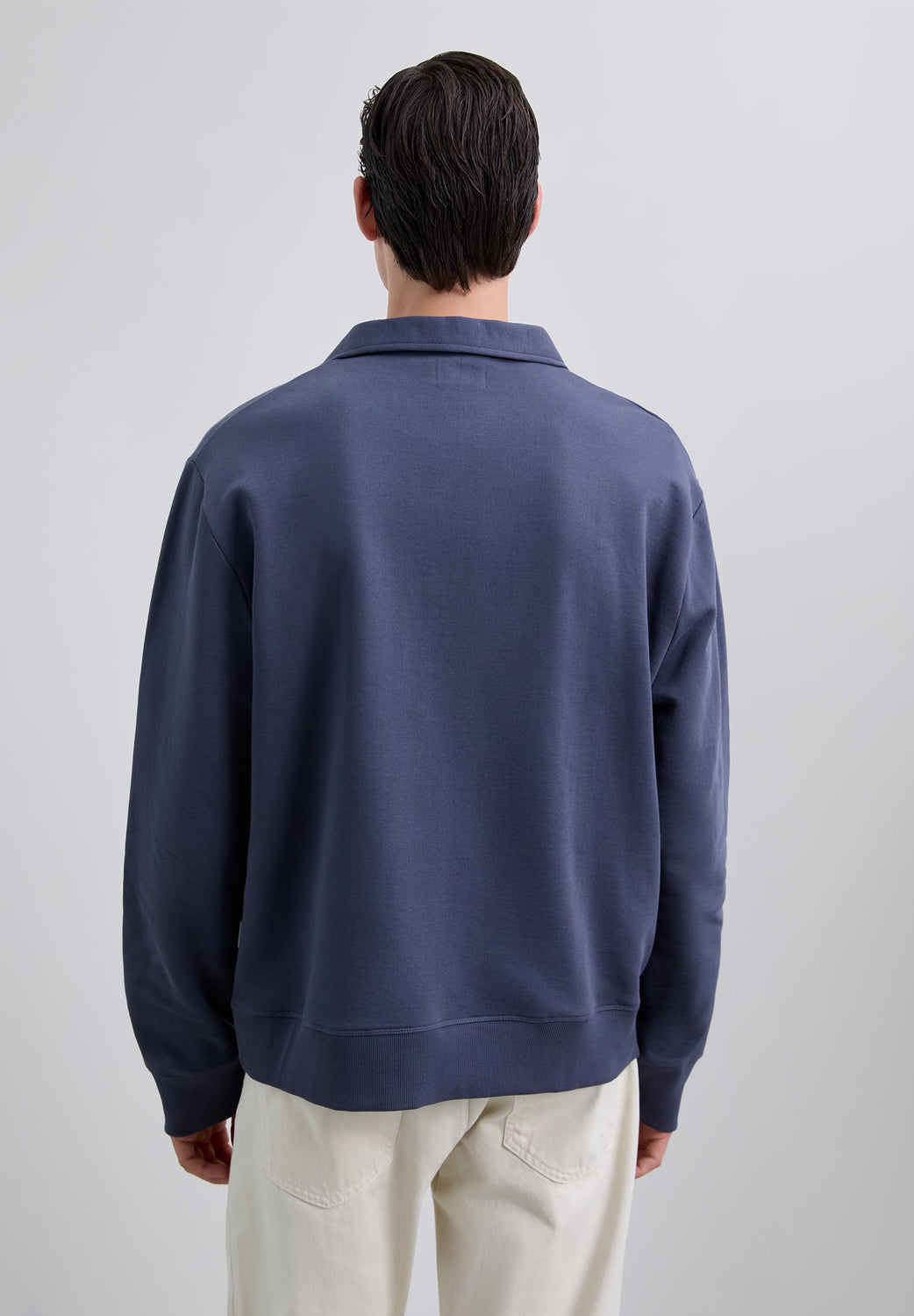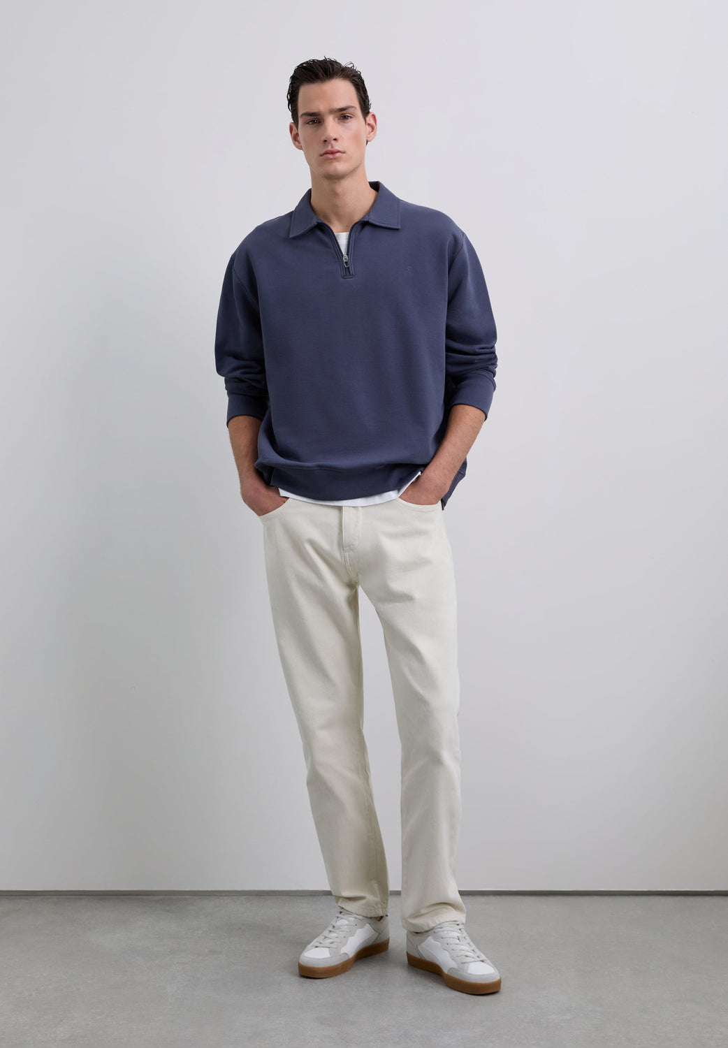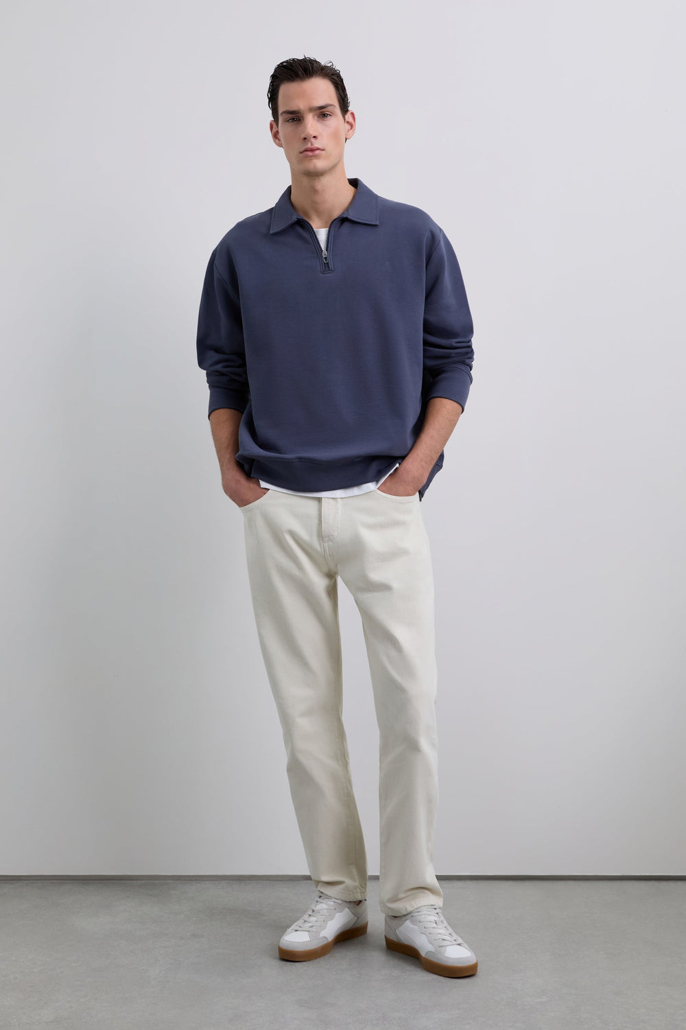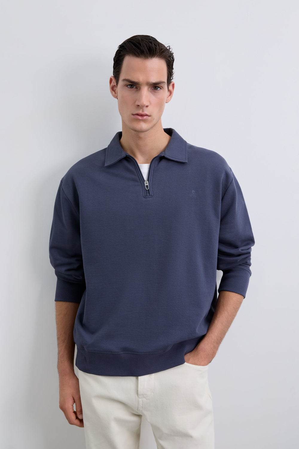 Sudadera confeccionada en 100% algodón BCI. Cuello polo con media cremallera. Corte Regular Fit, manga larga y bordado logo en pecho. Acabado de puños en rib.