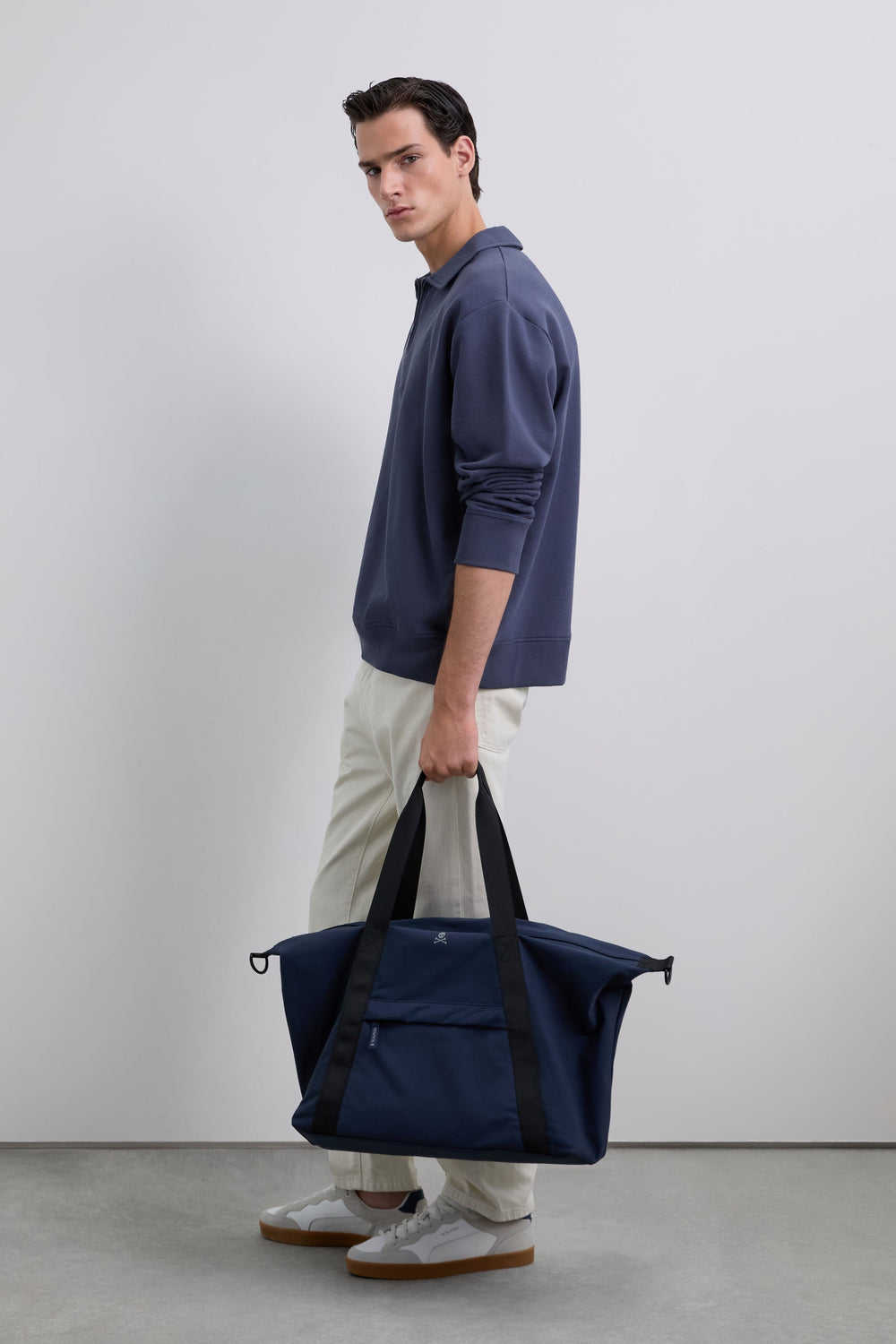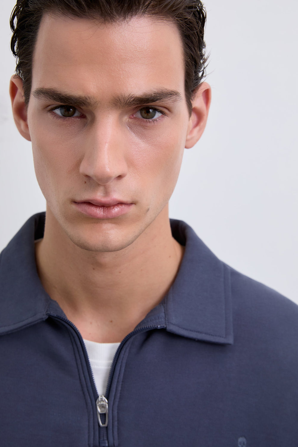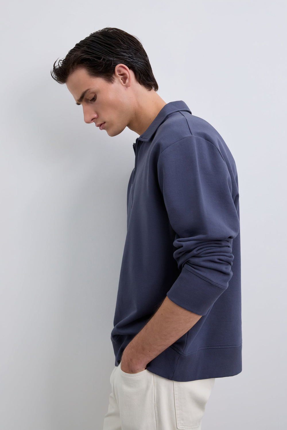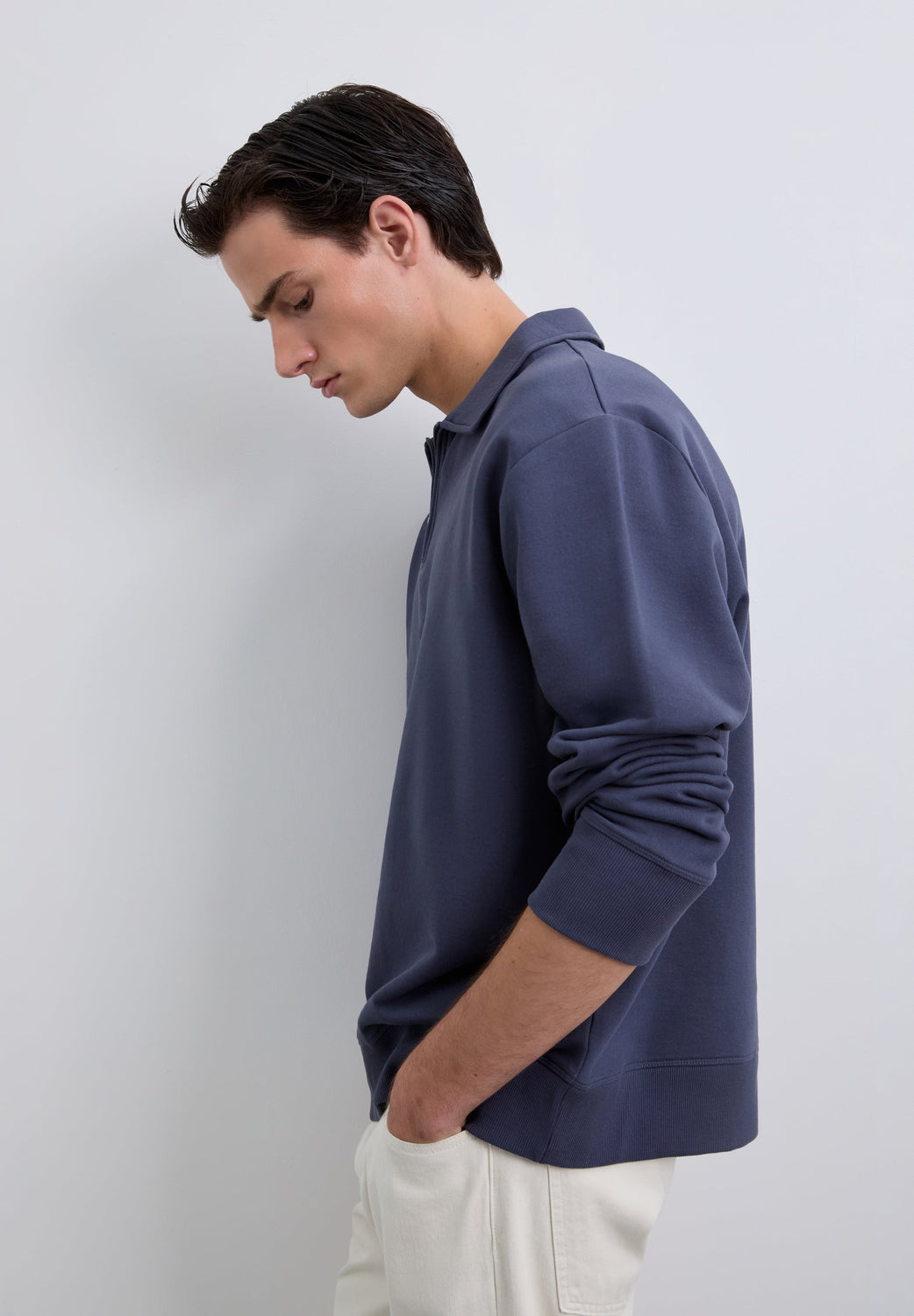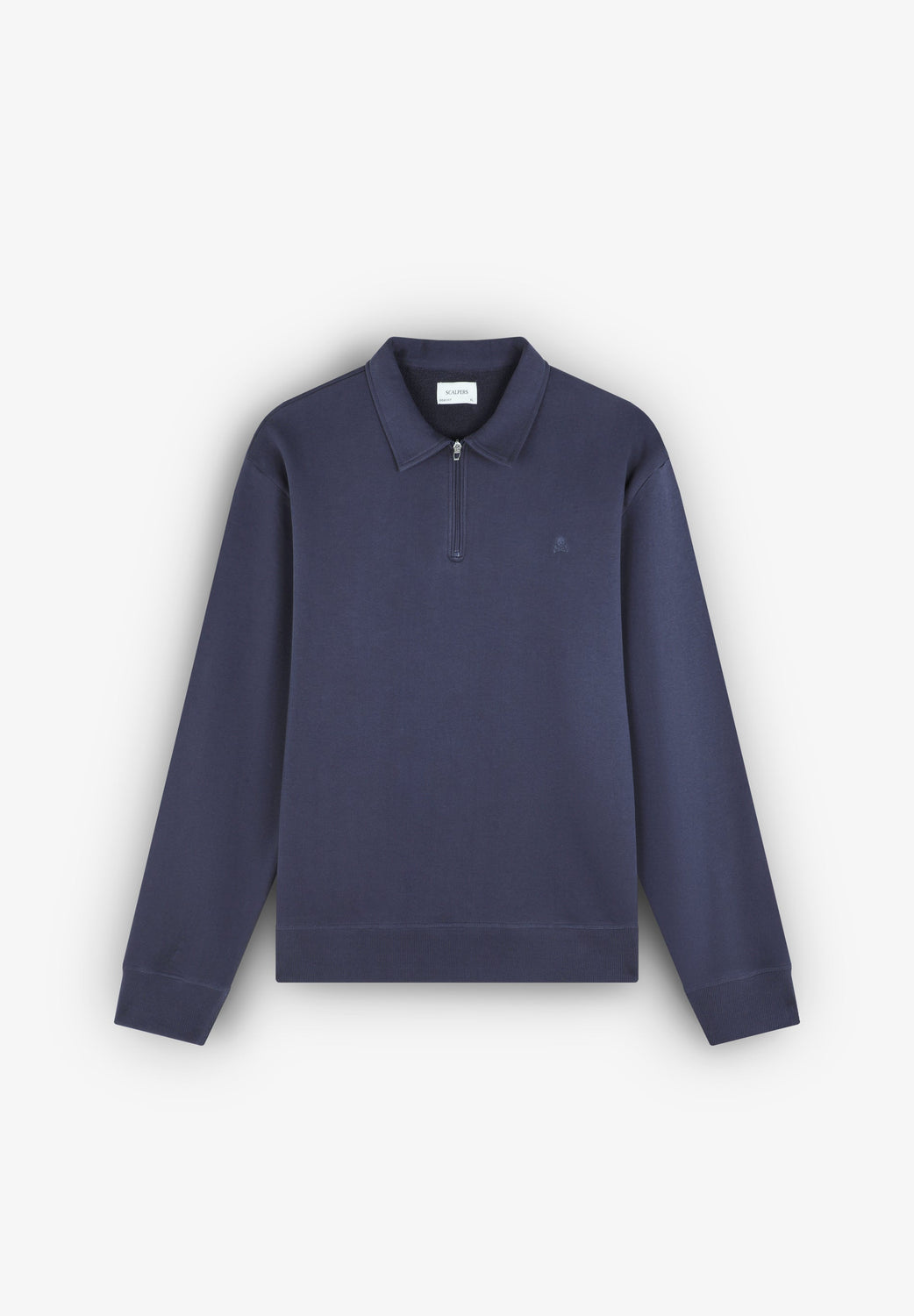 Sudadera confeccionada en 100% algodón BCI. Cuello polo con media cremallera. Corte Regular Fit, manga larga y bordado logo en pecho. Acabado de puños en rib.