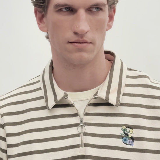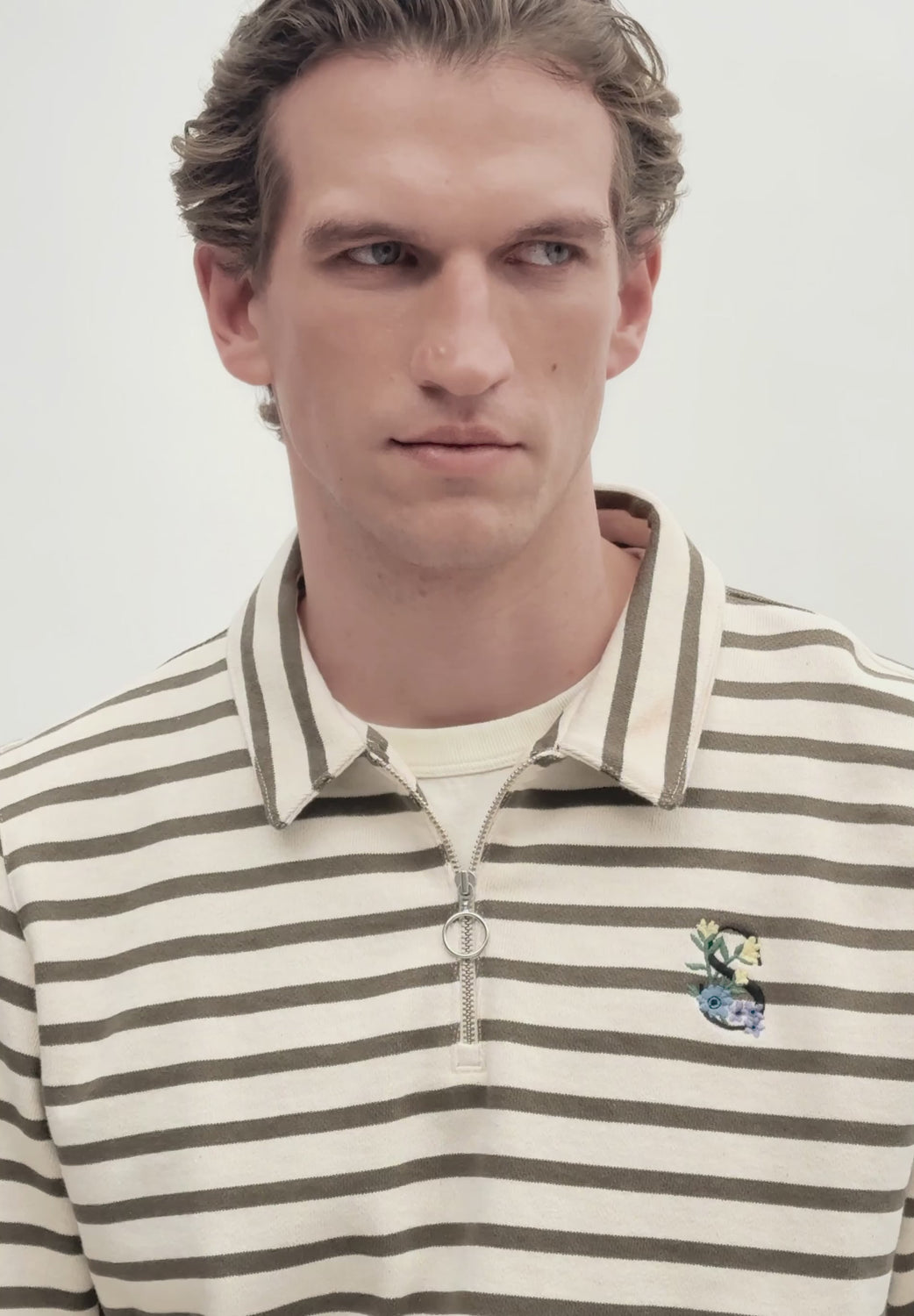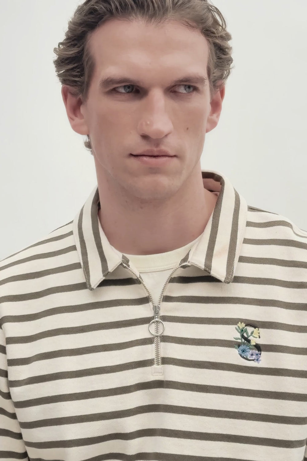 Sudadera de rayas confeccionada en 100% algodón BCI. Cuello polo con media cremallera. Corete Regular Fit, manga larga y bordado logo en pecho. Acabado de puños en rib.