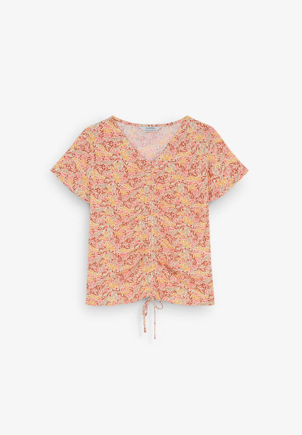 Top confeccionando en 100% viscosa con estampado floral con frunce frontal. Corte slim fit, escote en V y manga corta.