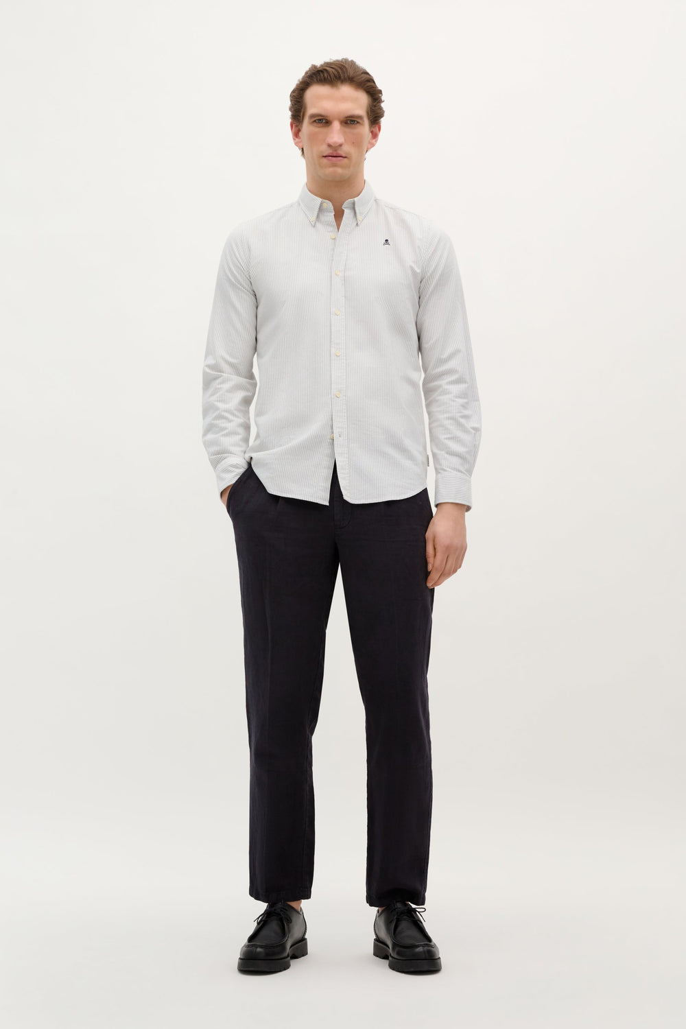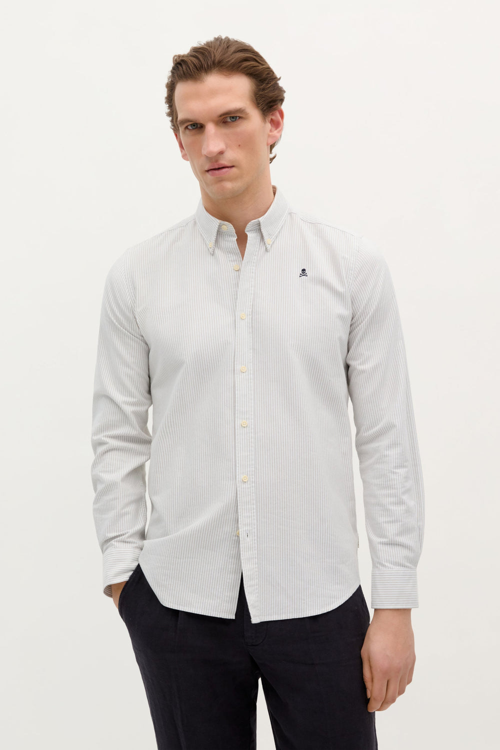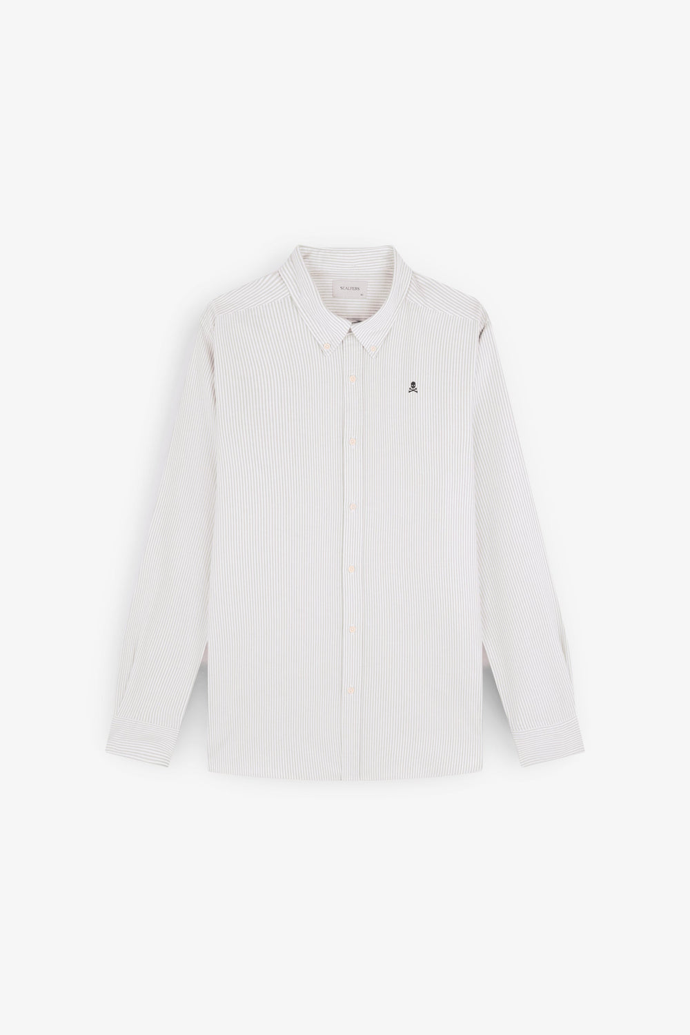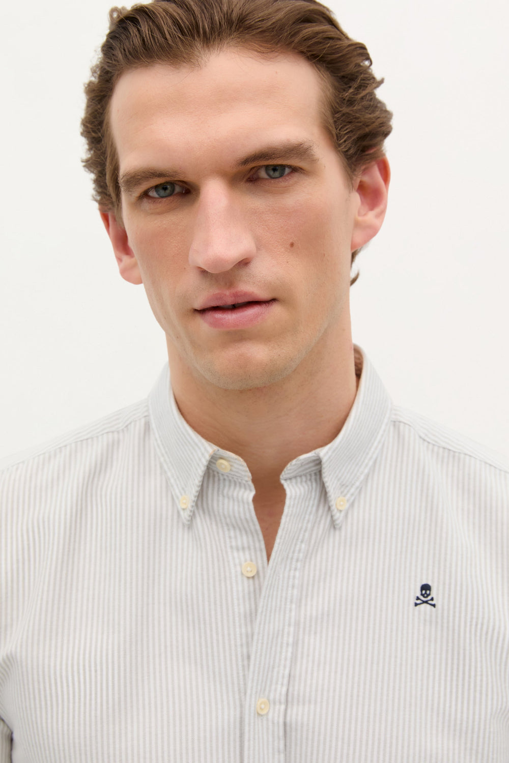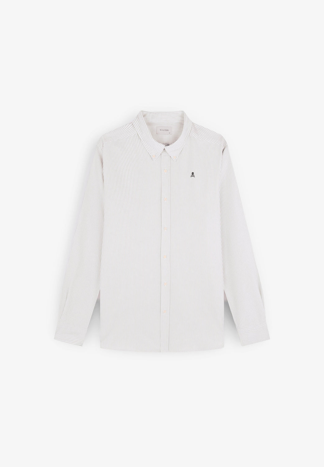 Camisa confeccionada en 100% algodón BCI. Regular fit, cuello con botones y cierre con botones. Manga larga terminada en puño con botones y calavera bordada a contraste.