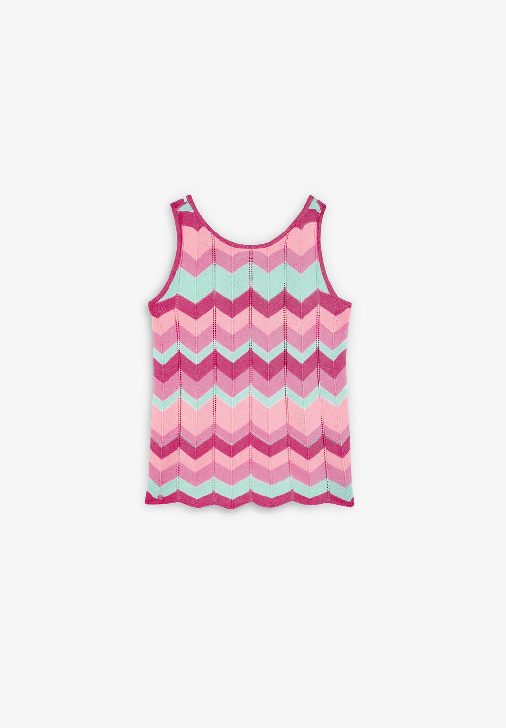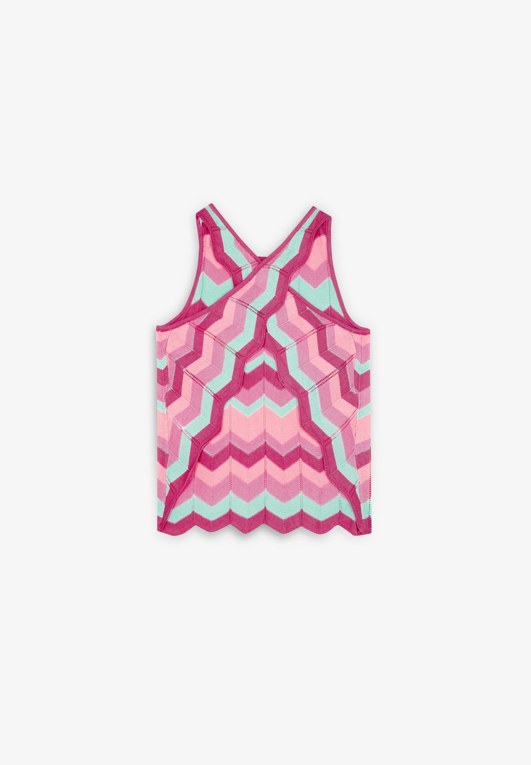 Jersey de punto con estampado en zig zag. Confeccionado en mezcla de algodón. Corte Regular fit. Cuello redondo. Manga en sisa. Acabados en rib a contraste. Detalle de calavera en marche metálico a tono en bajo. Espalda cruzada.