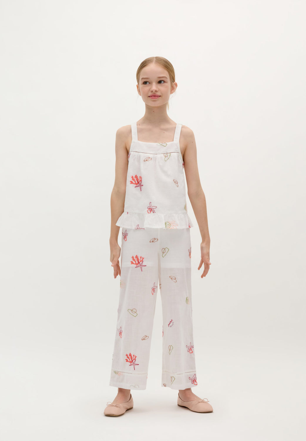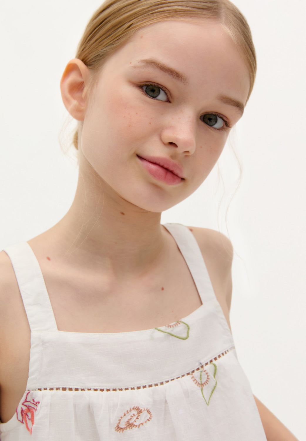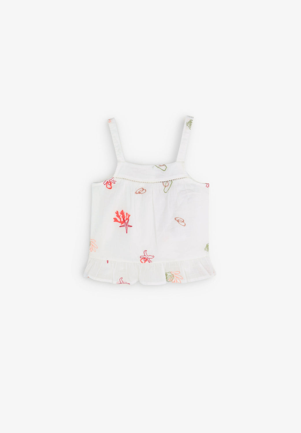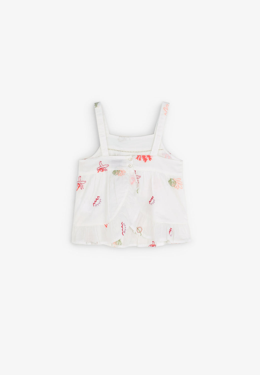 Top confeccionado en 100% algodón orgánico con motivos bordados. Escote cuadrado, tirantes y detalle de enrejado en pecho. Cierre con botones en espalda y detalle de volante cruzado delantero y trasero.