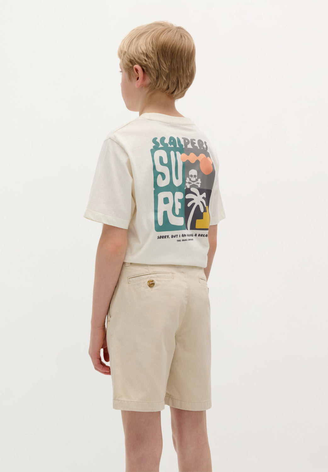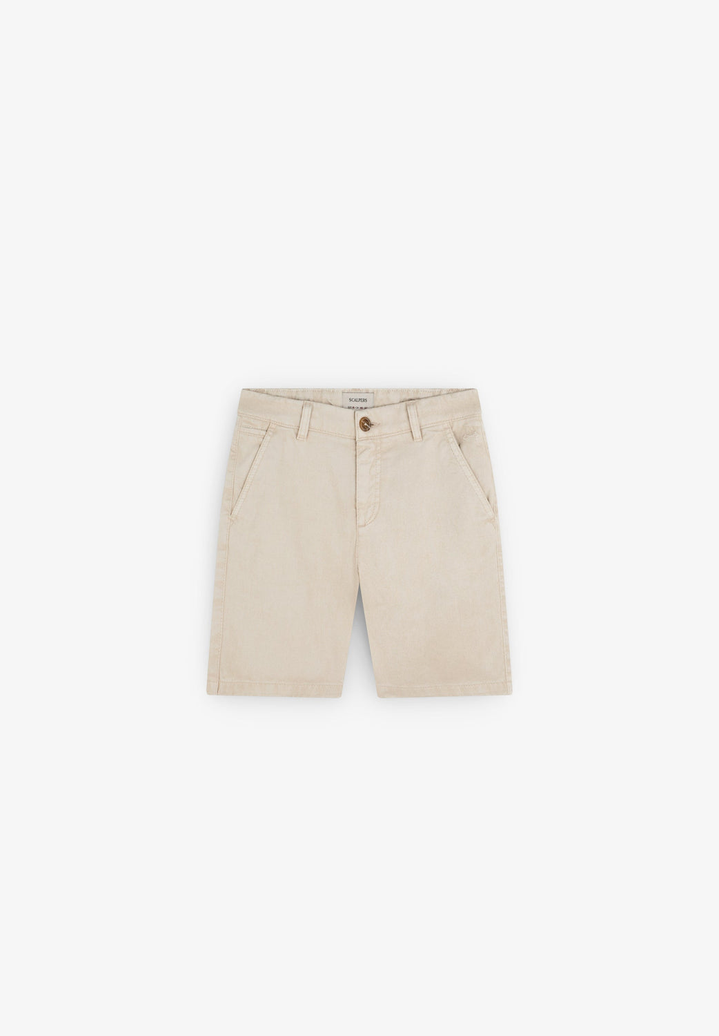 Bermudas confeccionadas en 100% algodón orgánico. Cierre frontal mediante botón y cremallera. Trabillas en cintura. Dos bolsillos delanteros y dos traseros con cierre mediante botón. Detalle de etiqueta con logo.