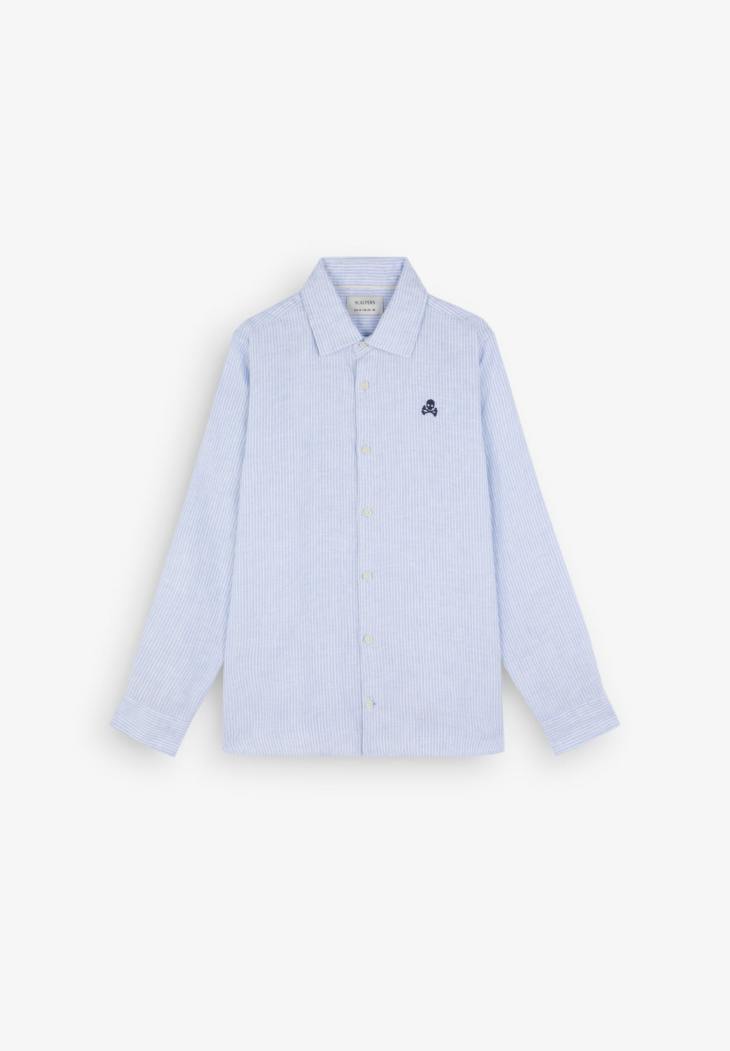 Camisa confeccionada en 100% lino con estampado de rayas. Corte regular fit, cuello clásico y manga larga con terminación en puño con botón. cierre con botones y logo calavera bordado en pecho.