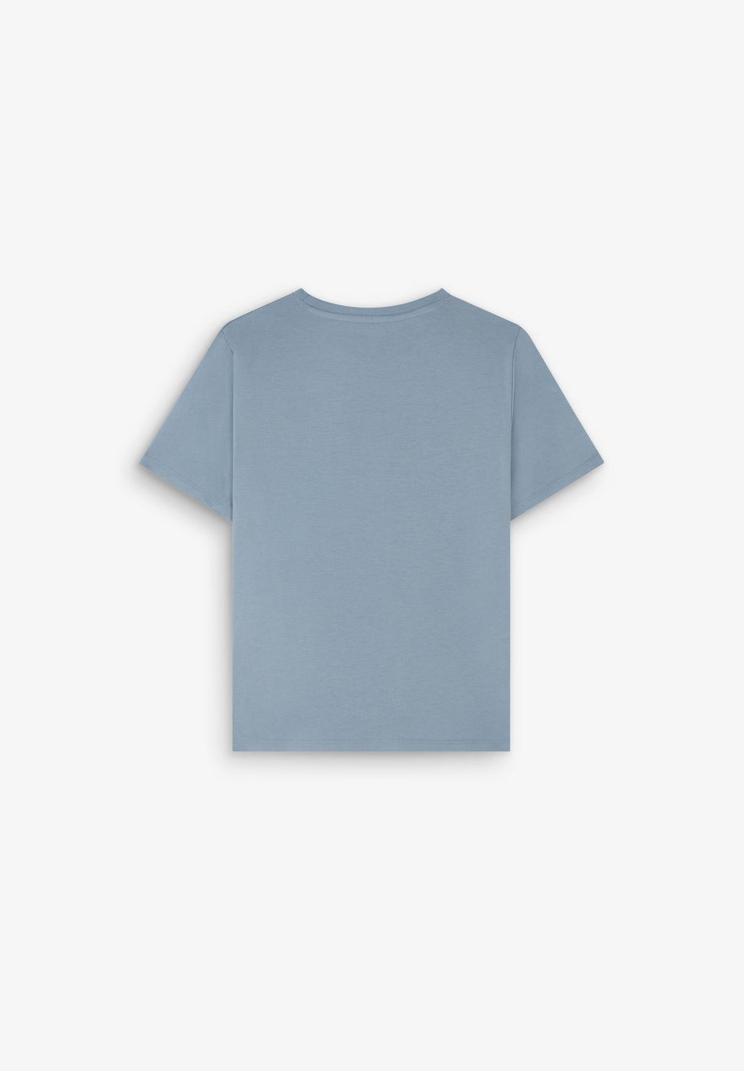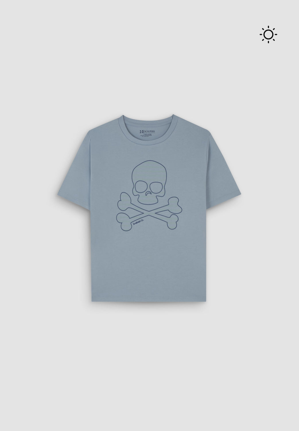 Camiseta confeccionada en tejido 100% algodón BCI. Corte recto, cuello redondo y manga corta. Detalle de bordado en el pecho y print de calavera "mágico": las rayas solo se aprecian cuando le da la luz del sol.