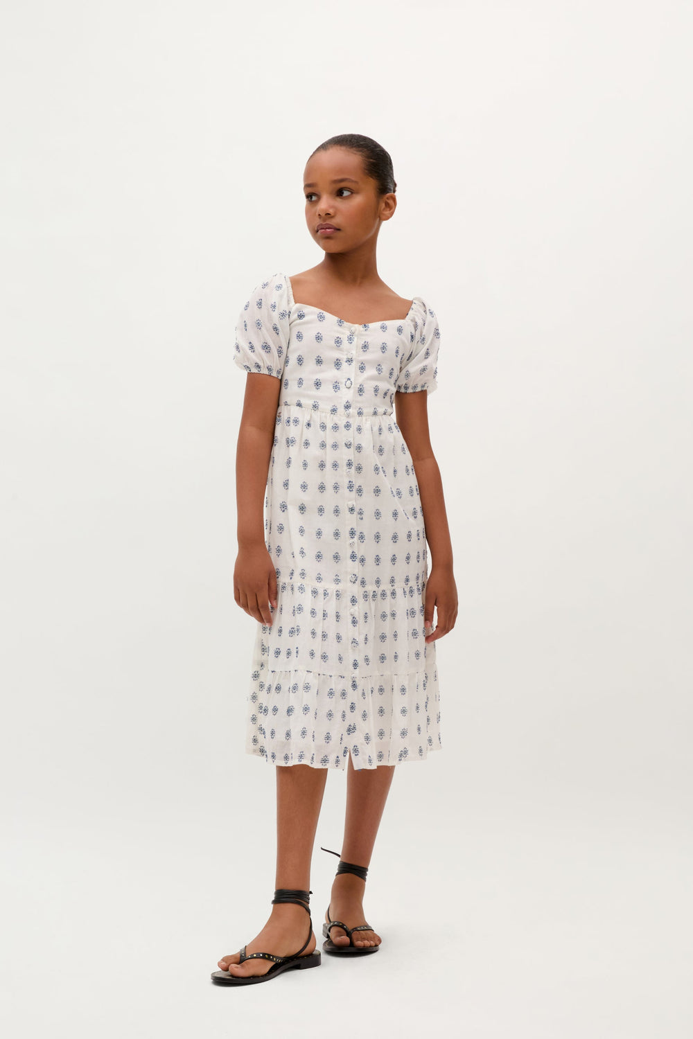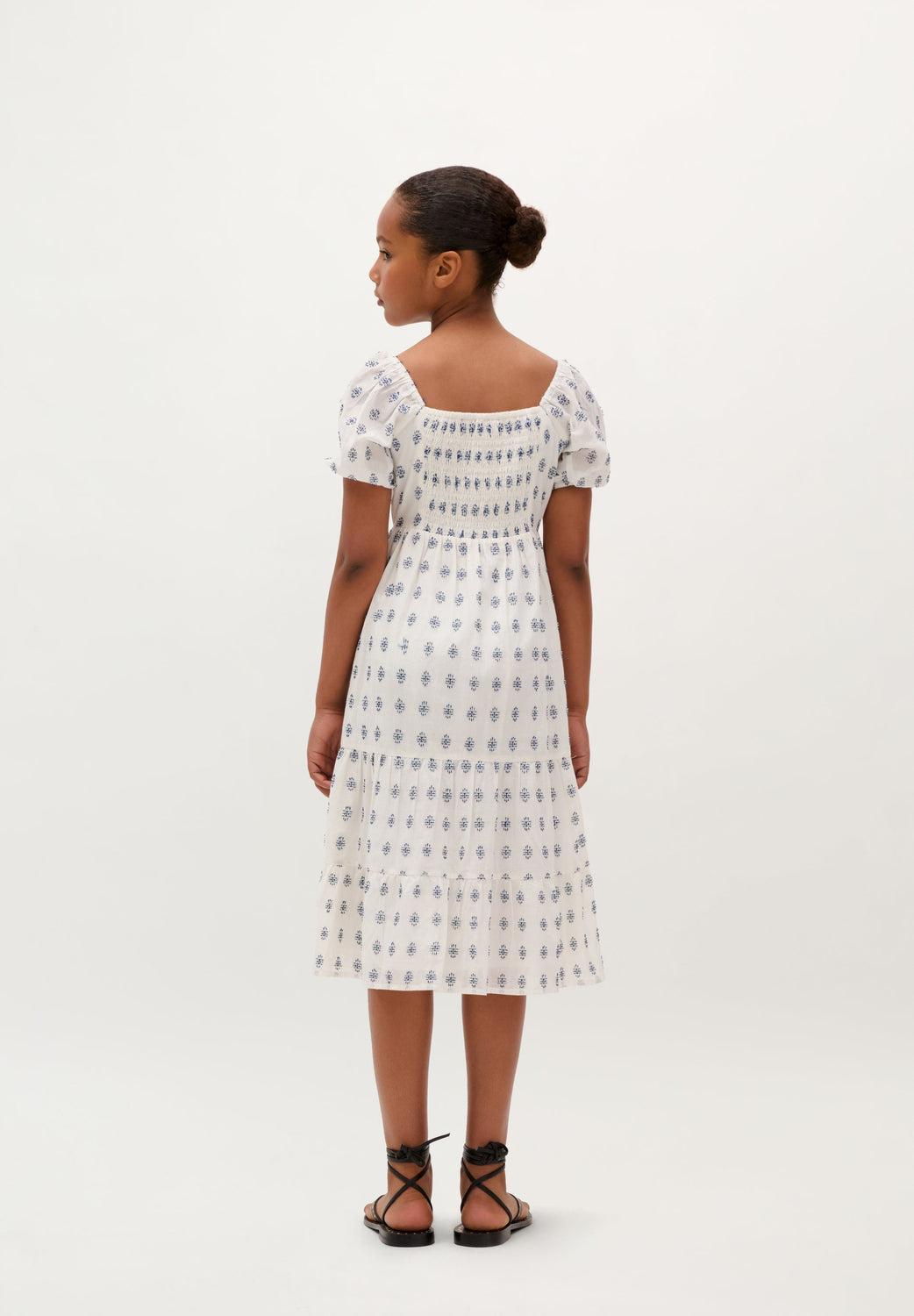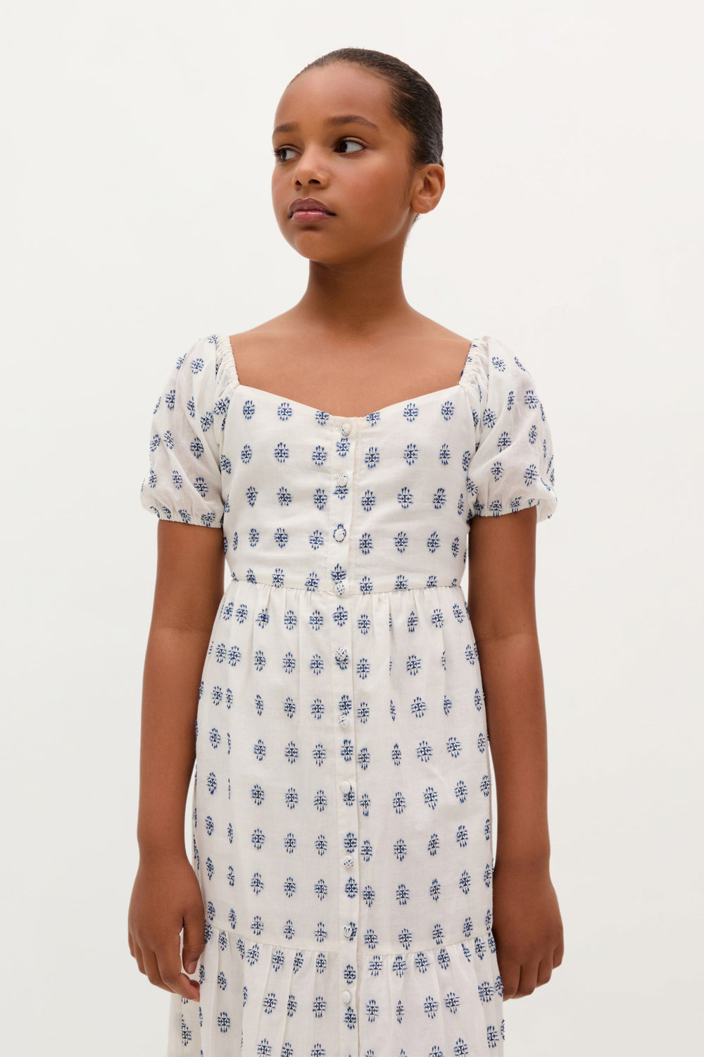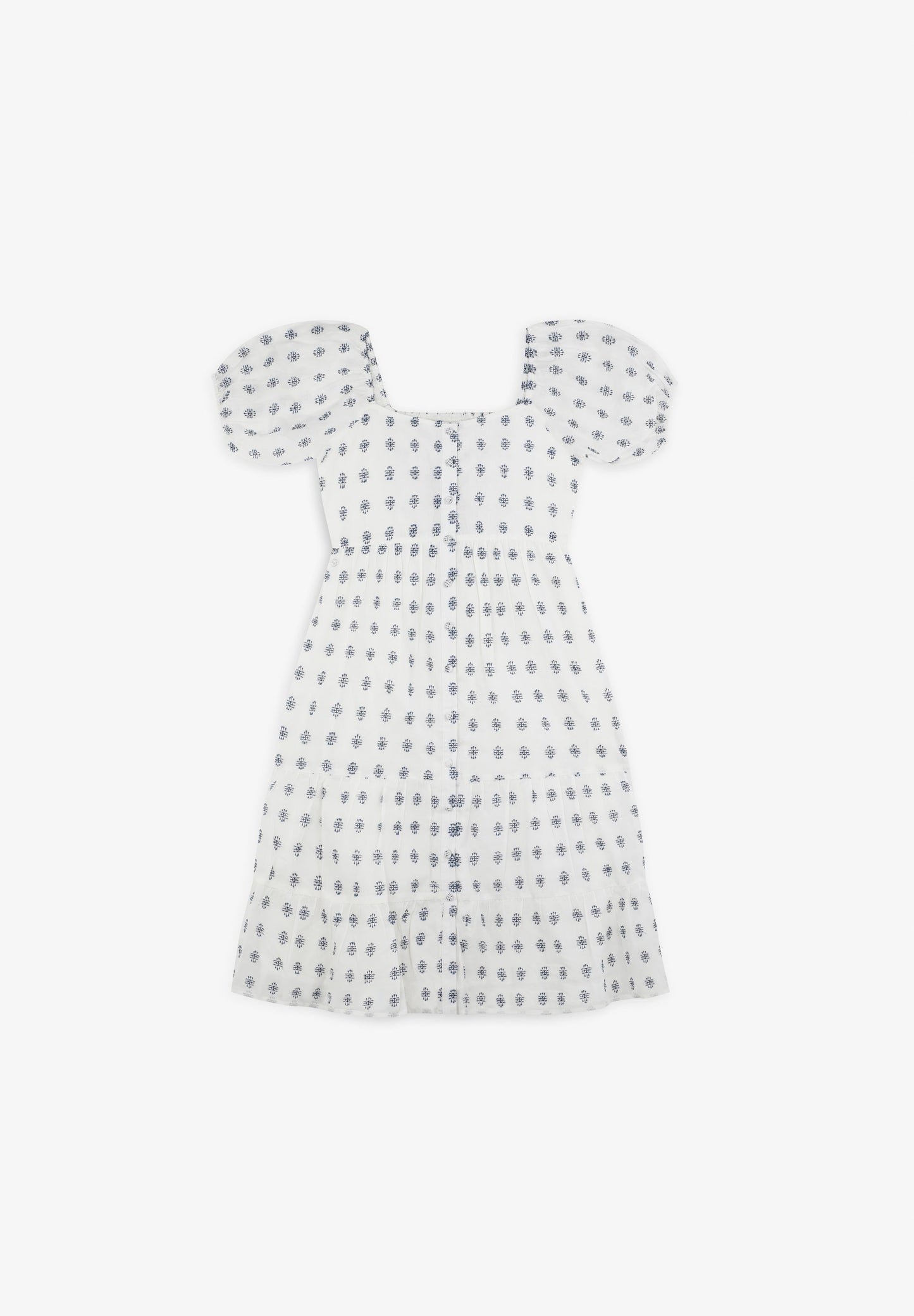 Vestido confeccionado en 100% algodón BCI. Escote cuadrado. Mangas abullonadas. Forro interior. Detalle de nido de abeja en espalda. Cierre por botones en frontal.
