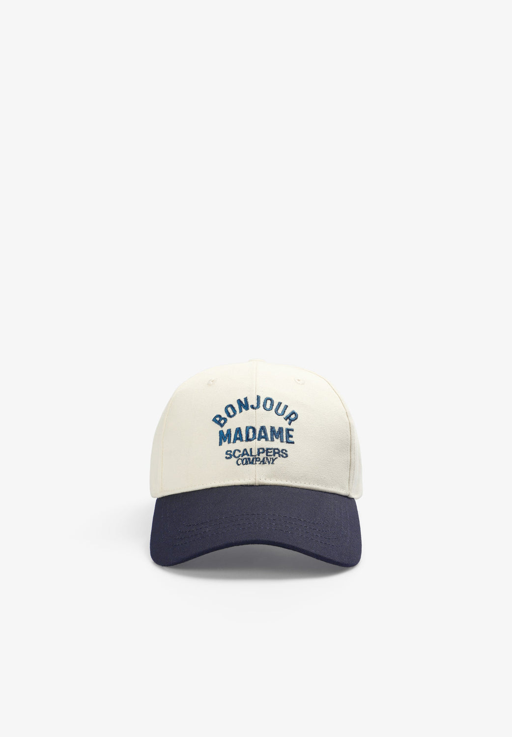 Gorra bicolor confeccionada en 100% algodón. Cierre ajustable trasero y print delantero a contraste.
