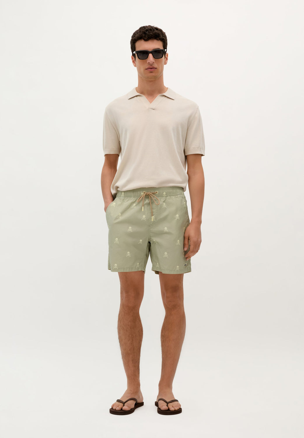 Bañador confeccionado en Algodón y Nailon. Cintura elástica ajustable con cordón. Diseño de monograma impreso con acabado mate. Rejilla interior. Bolsillos laterales y trasero con cierre por velcro. Detalle de logo engomado en frontal izquierdo.