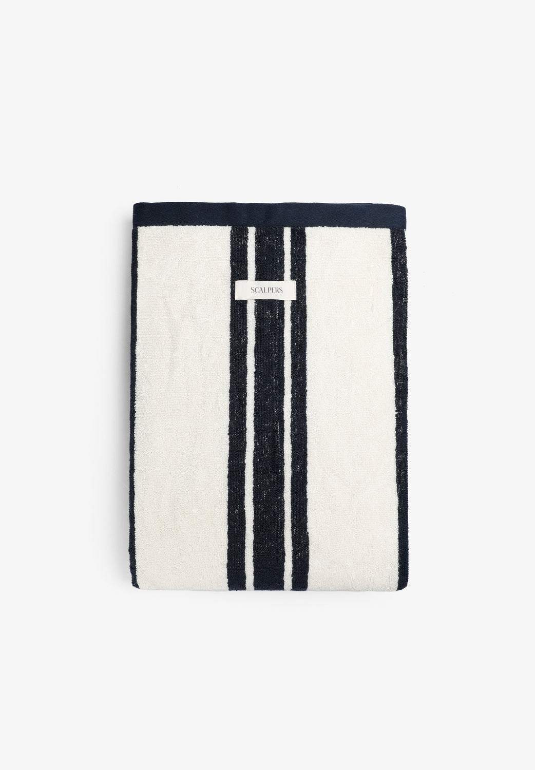Toalla confeccionada en 100% Algodón Orgánico BCI. Estampado a rayas. Detalle logotipo en etiqueta bordada.
