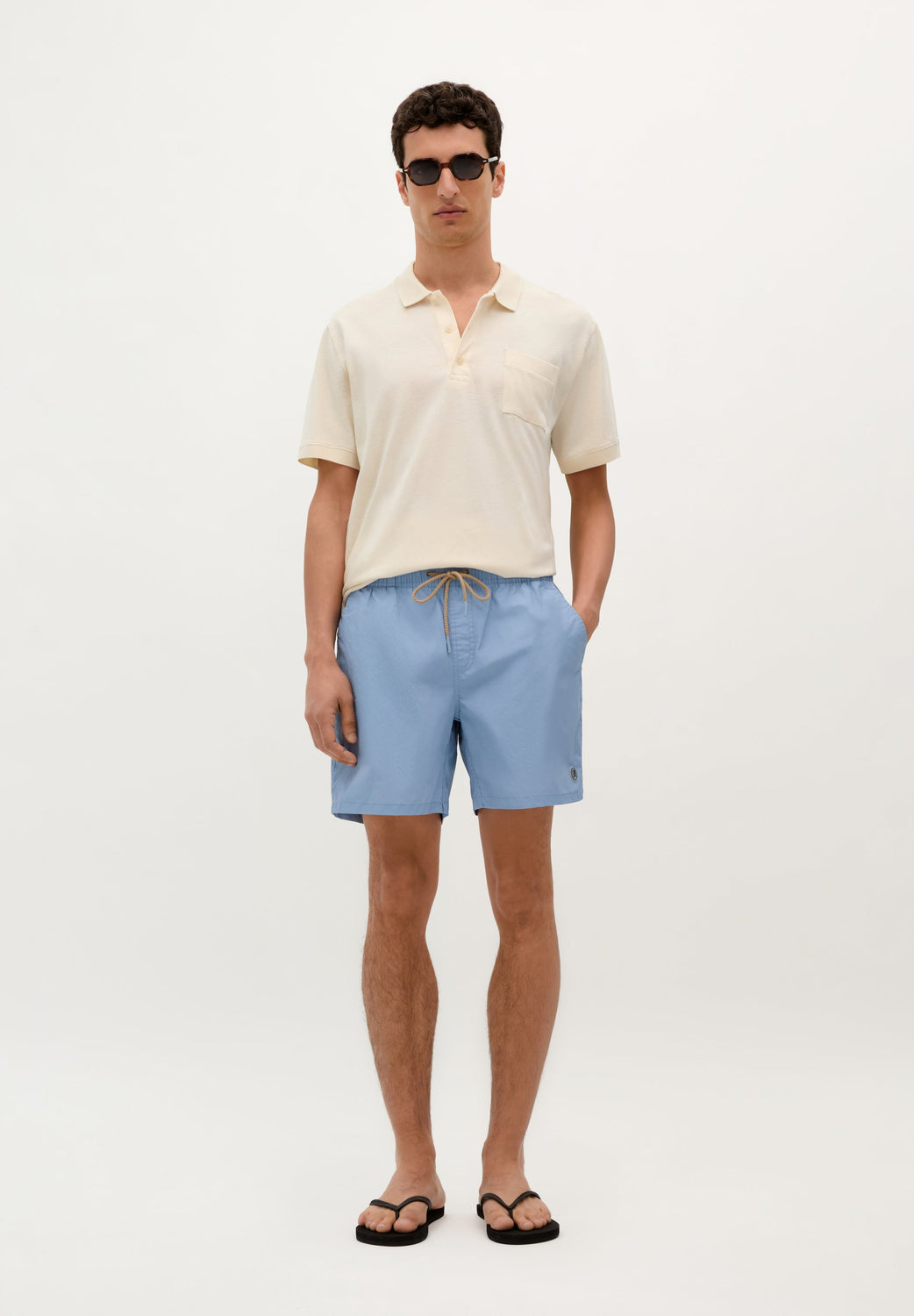 Bañador confeccionado en tejido técnico. Cintura elástica ajustable con cordón. Bolsillos laterales y detalle de bolsillo trasero de plastrón. Forro interior.