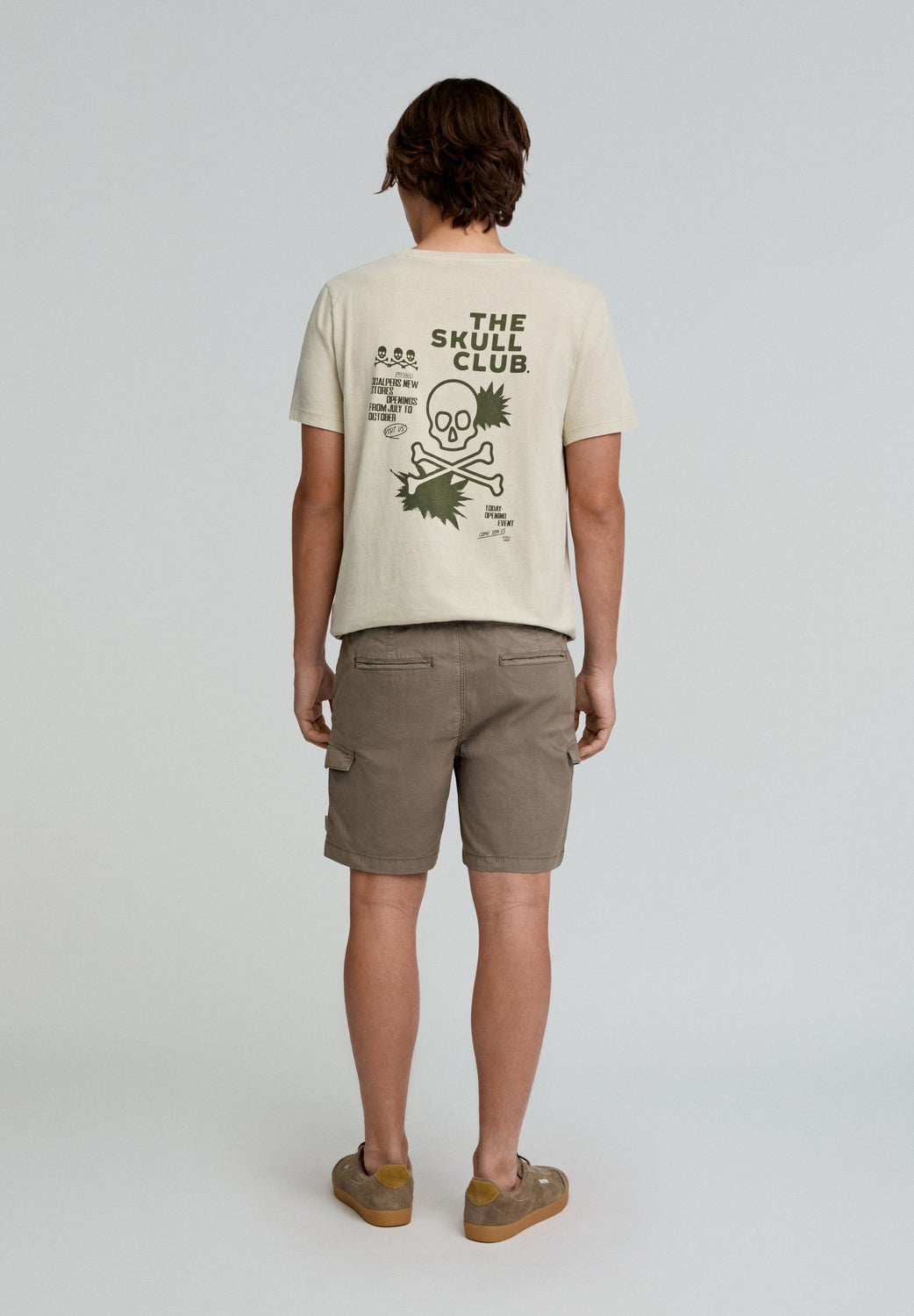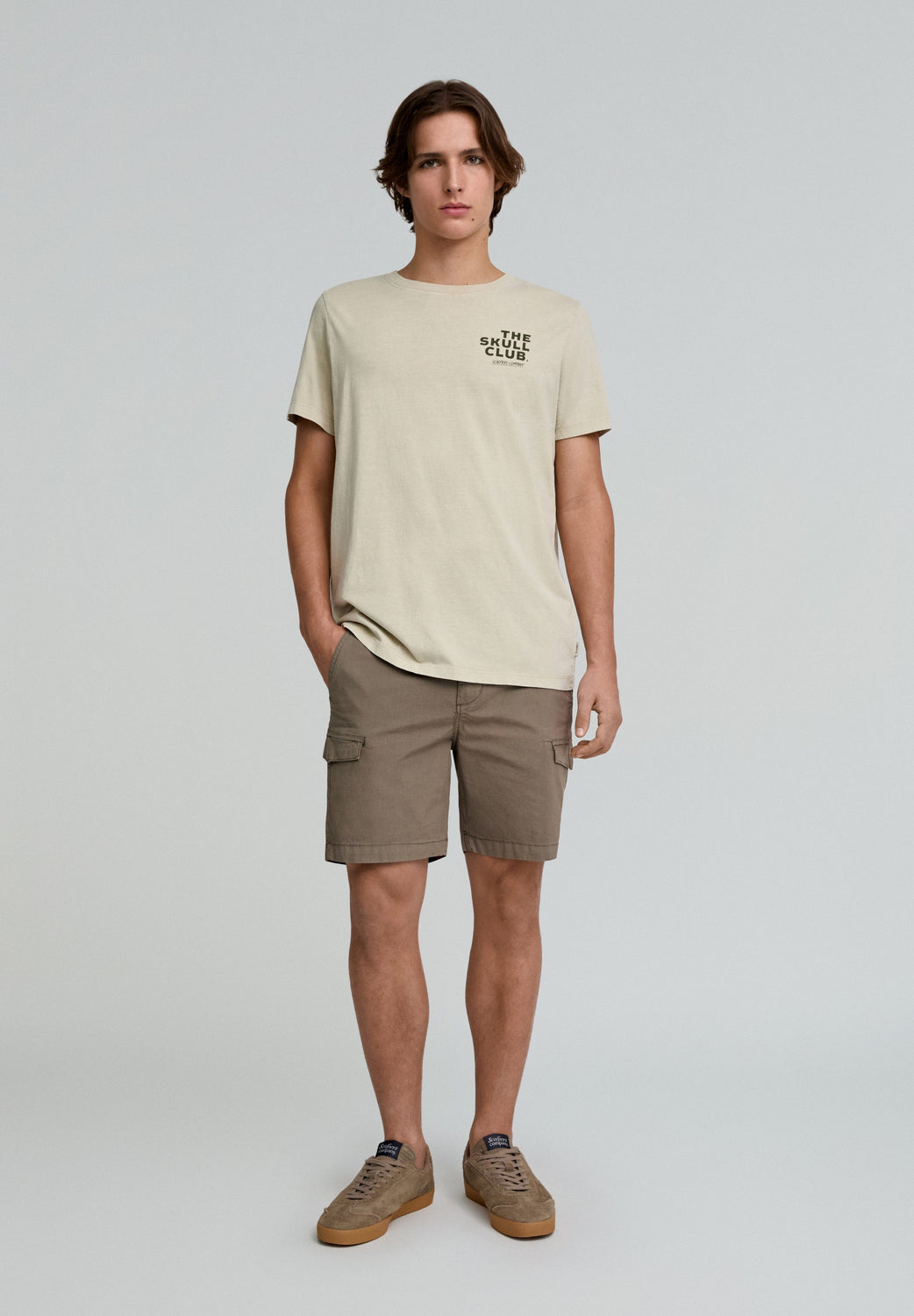 Bermuda cargo efecto lavado. Confeccionada en algodón orgánico. Corte Regular fit. Cierre con botón y cremallera. Bolsillos laterales. Bolsillos en pernera de parche con solapa y cierre con snaps. Bolsillos trasero de parche. Trabillas en cintura. Detalle de calavera bordada a tono.