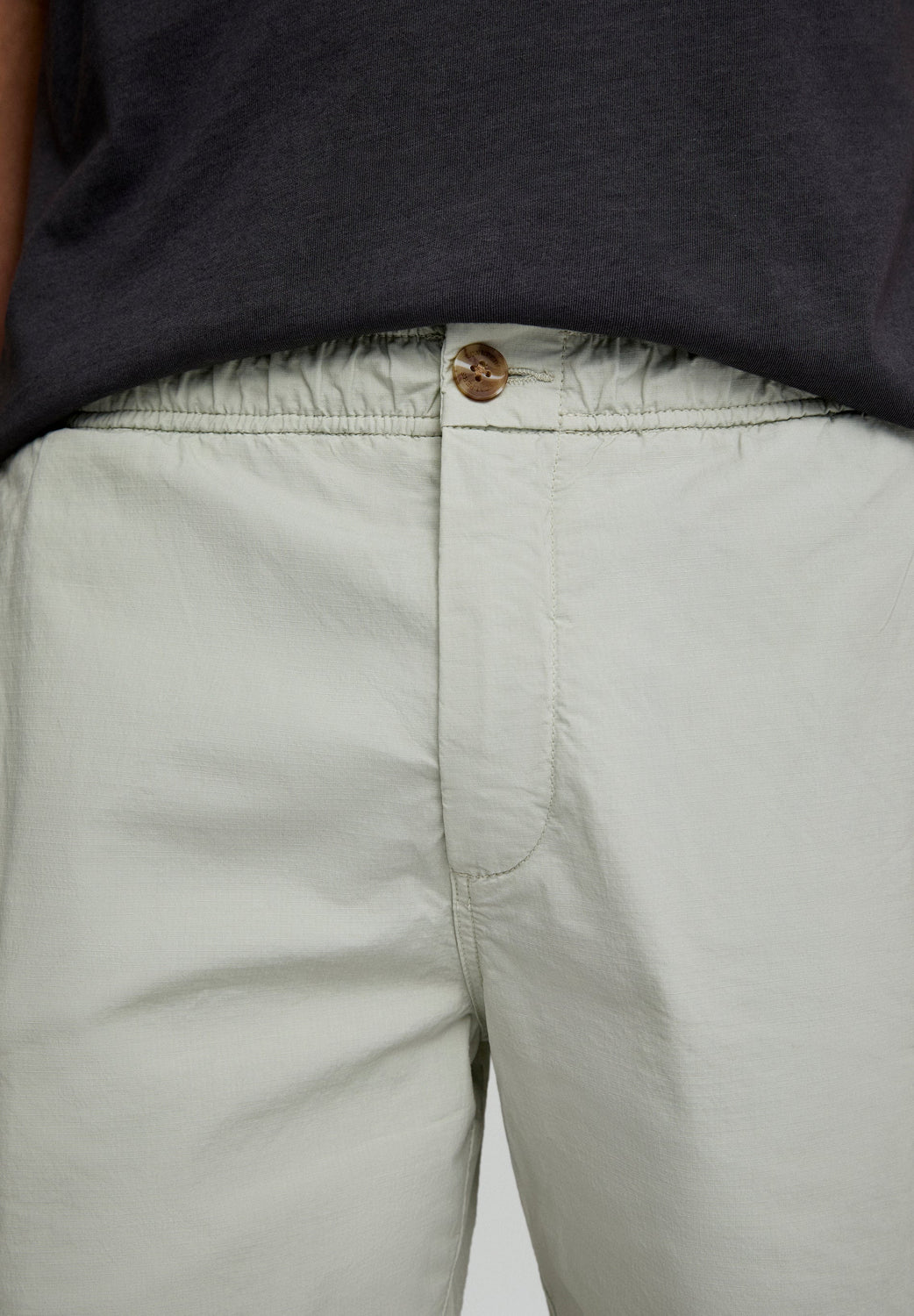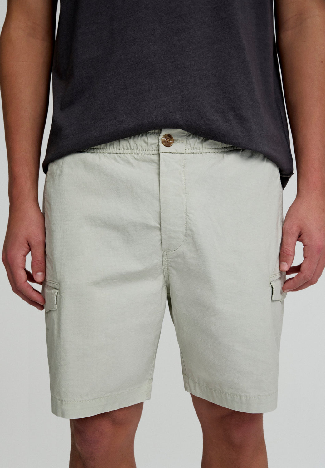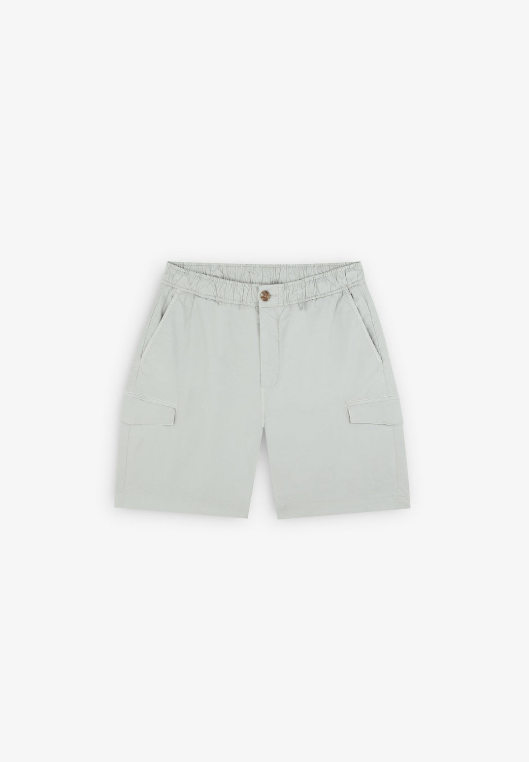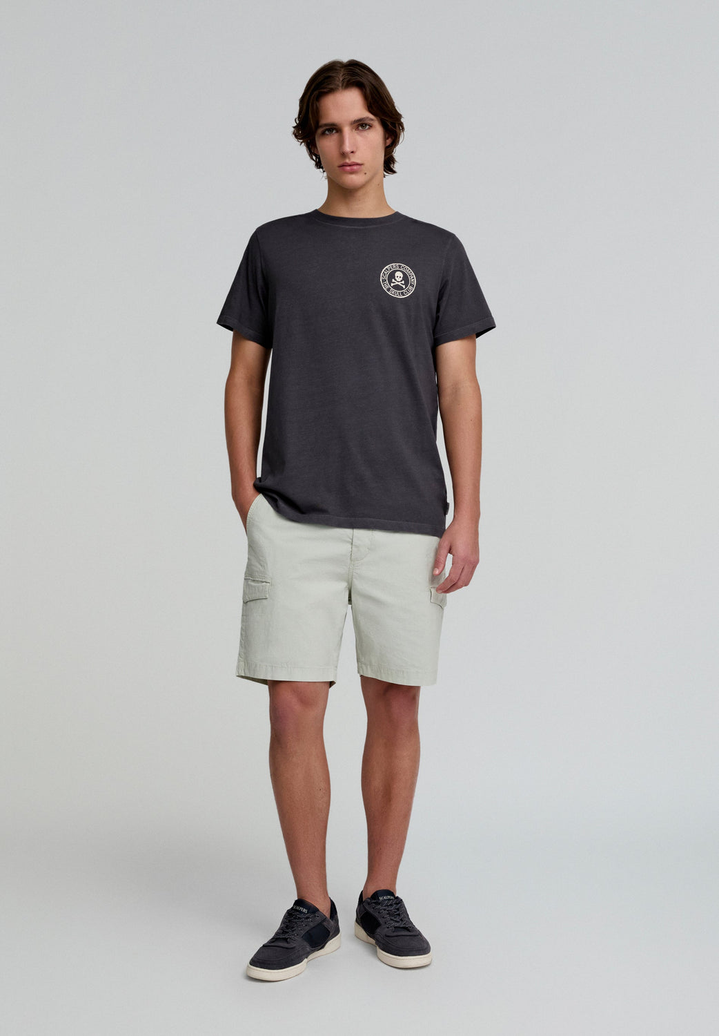 Bermuda cargo efecto lavado. Confeccionada en algodón orgánico. Corte Regular fit. Cierre con botón y cremallera. Bolsillos laterales. Bolsillos en pernera de parche con solapa y cierre con snaps. Bolsillos trasero de parche. Trabillas en cintura. Detalle de calavera bordada a tono.