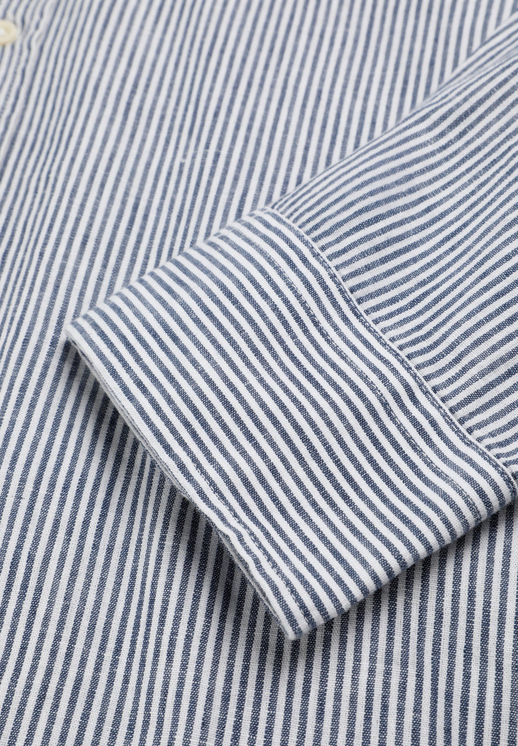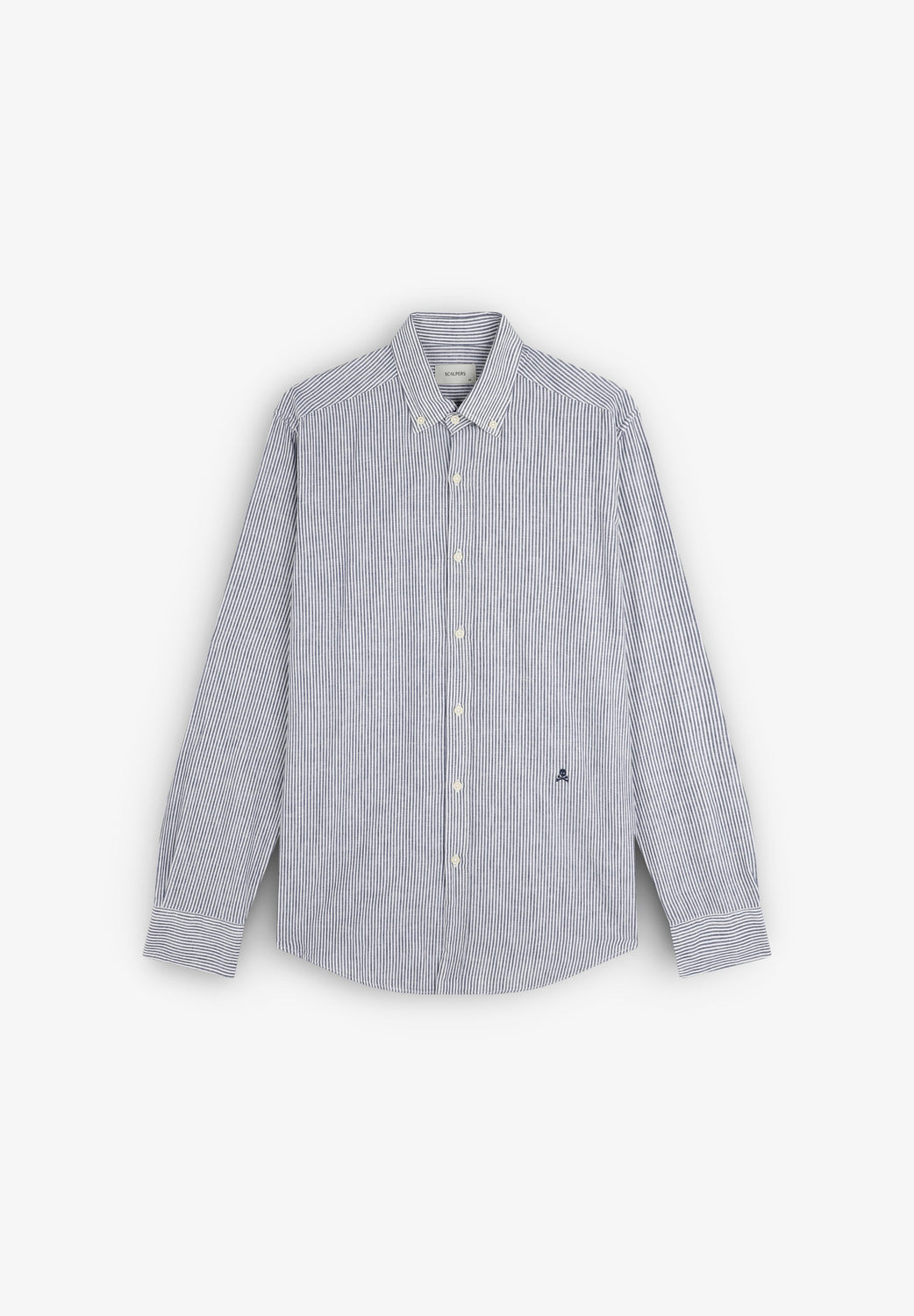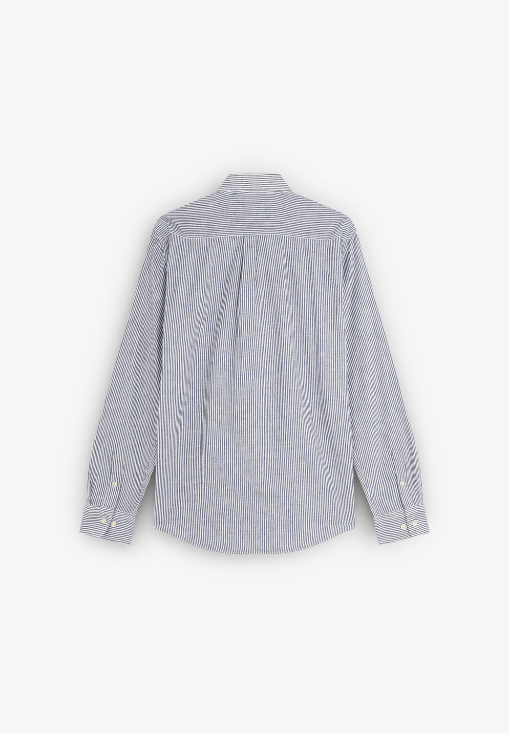 Camisa confeccionada en tejido Lino. Regular fit. Cuello camisero con abotonadura. Manga larga ajustable. Cierre mediante botonadura frontal. Estampado rayas. Logo bordado.