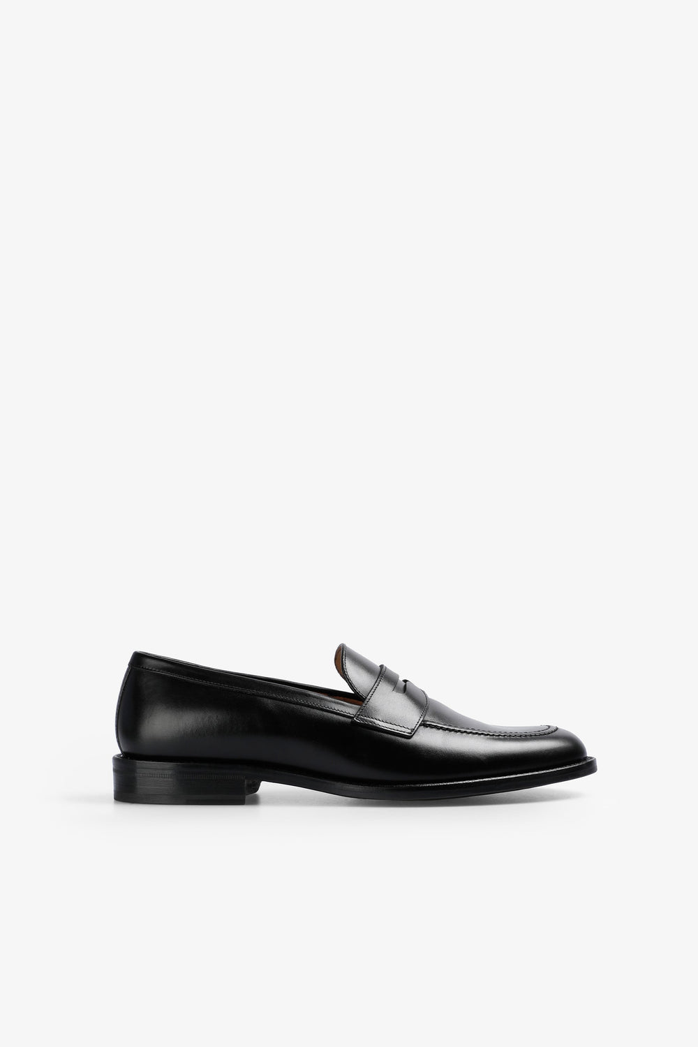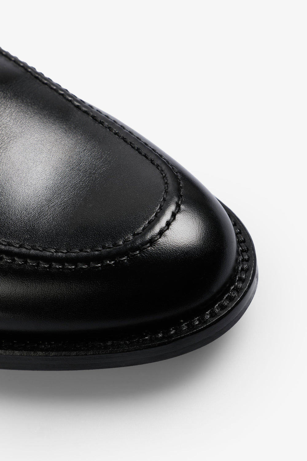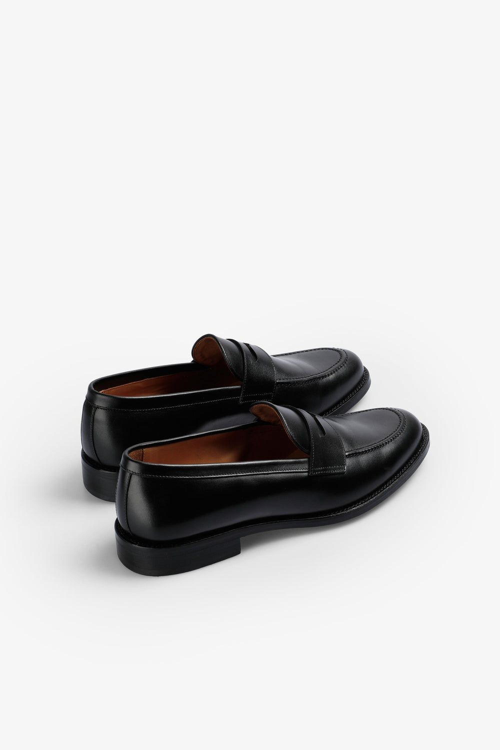 Mocasín negro de vestir con antifaz. Parte superior fabricada en 100% piel de alta calidad con acabado brillo. Plantilla interior en piel. Horma redonda en forma de pico. Suela de piel cosida al corte.