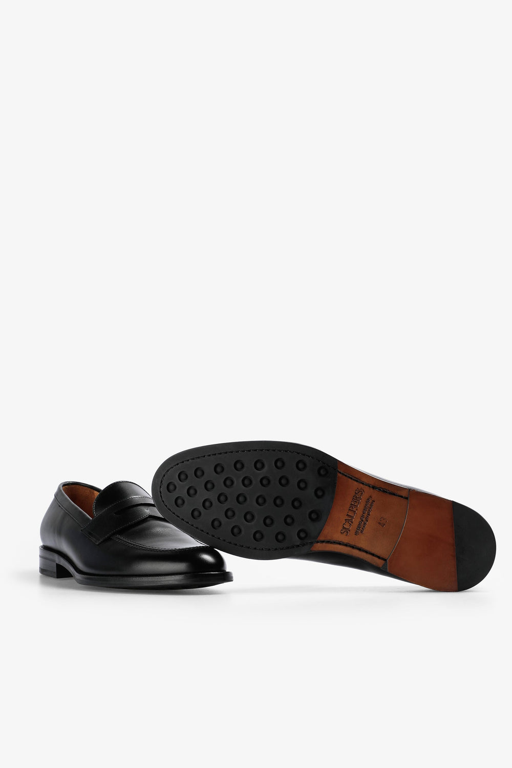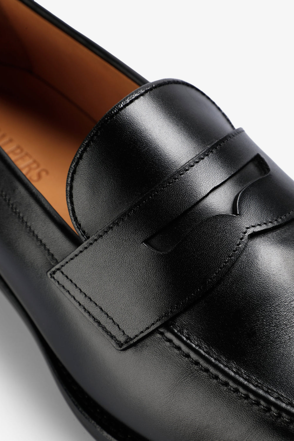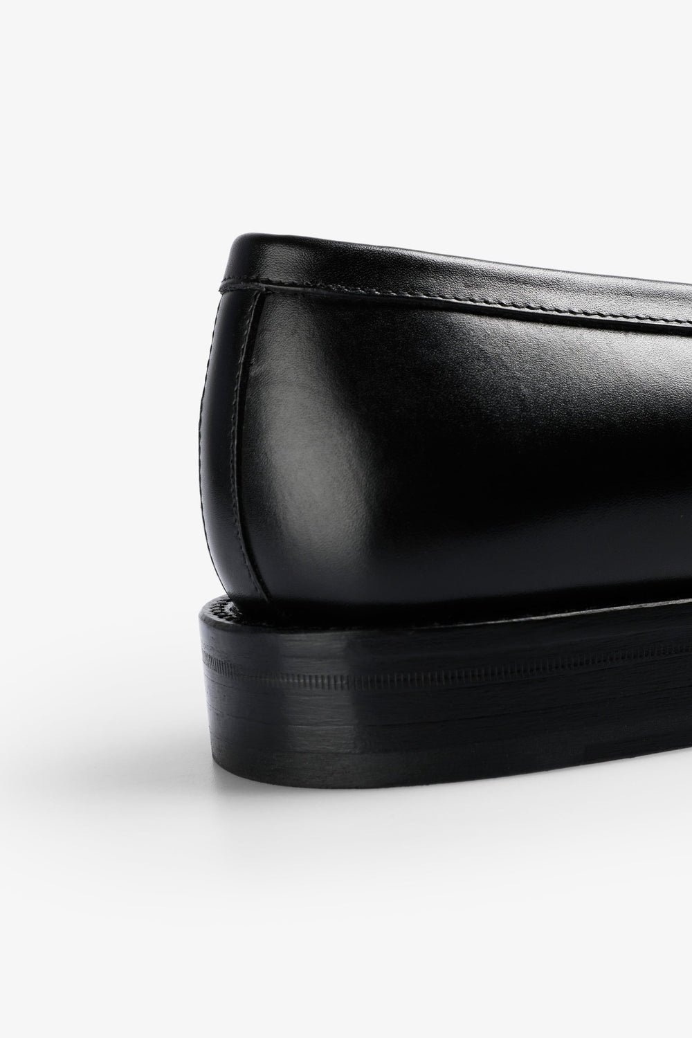 Mocasín negro de vestir con antifaz. Parte superior fabricada en 100% piel de alta calidad con acabado brillo. Plantilla interior en piel. Horma redonda en forma de pico. Suela de piel cosida al corte.