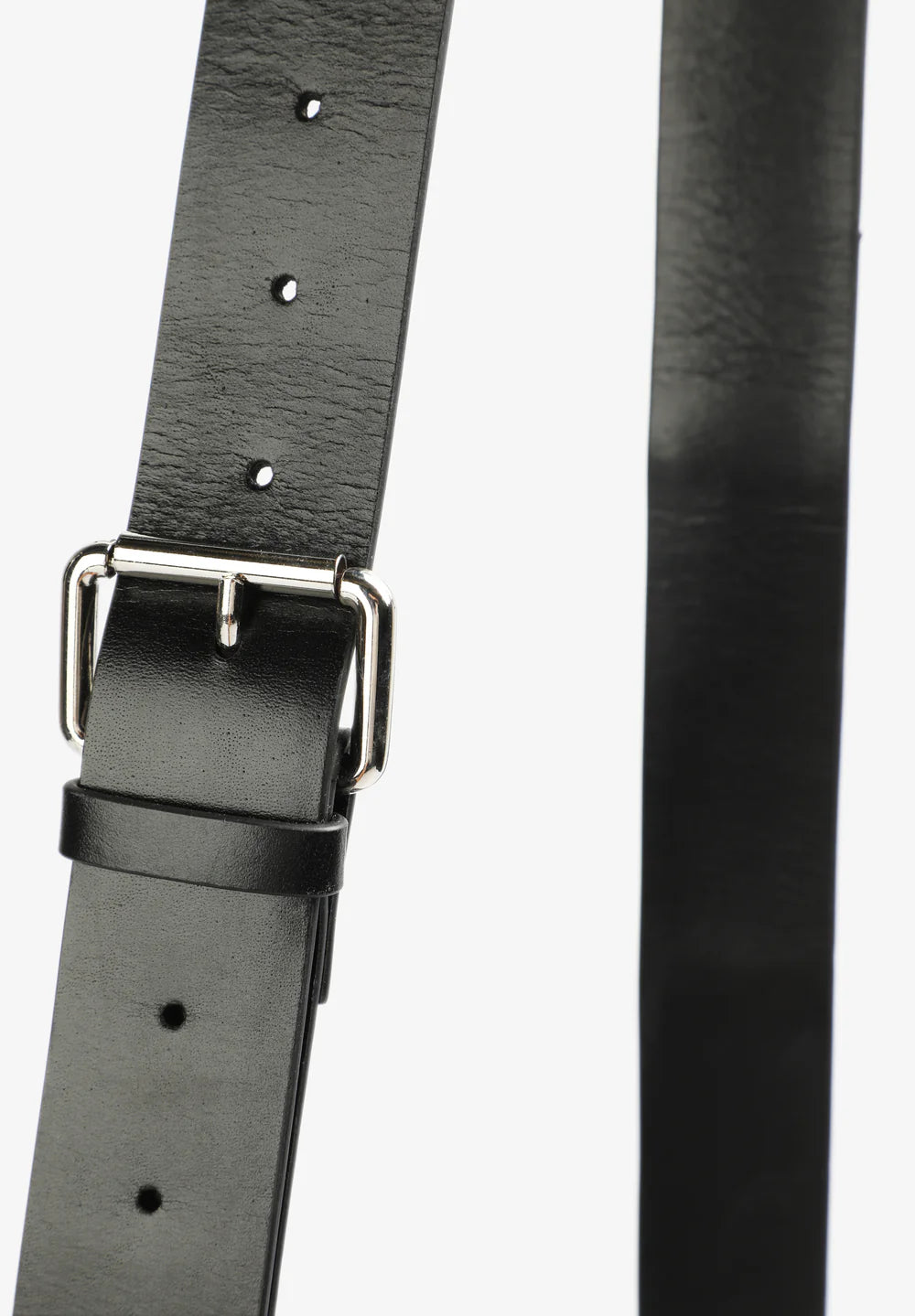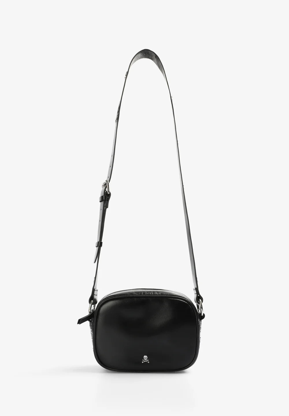 Bolso bandolera confeccionado en 100% piel. Cierre con cremallera y asa larga ajustable con calaveras metálicas. Detalle de logo metálico.