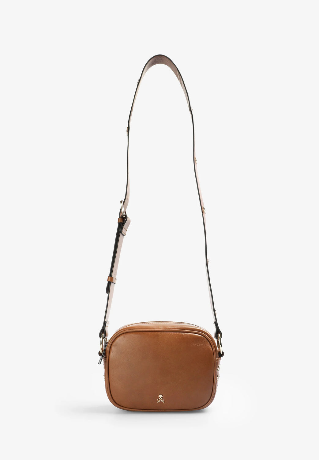 Bolso bandolera confeccionado en 100% piel. Cierre con cremallera y asa larga ajustable con calaveras metálicas. Detalle de logo metálico.