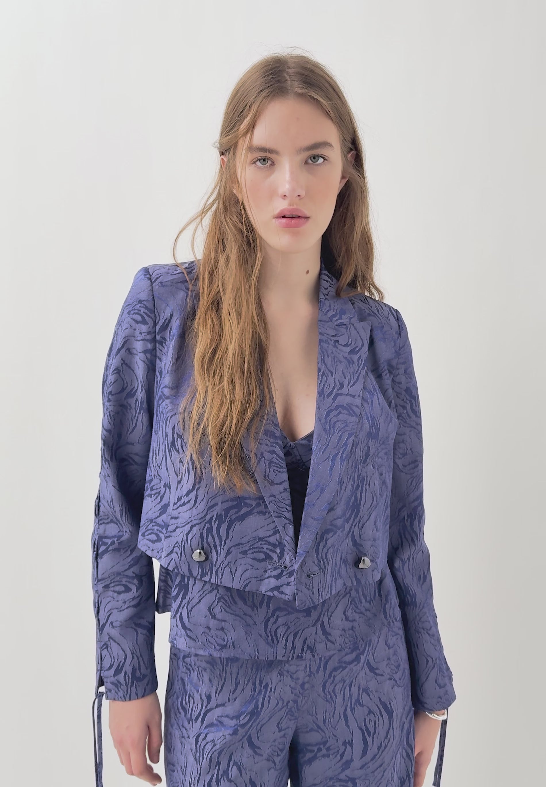 Blazer cropped confeccionada en tejido de jacquard. Regular fit, cuello con solapa punta de lanza y cierre con botones cruzados. Manga larga con detalle de tiras para fruncir.