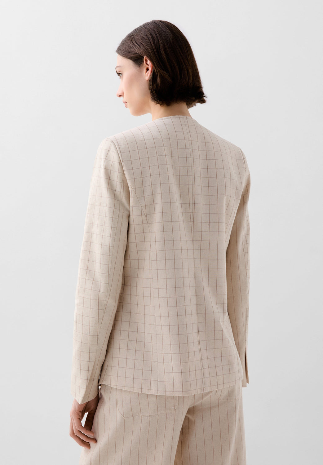 Blazer confeccionada en mezcla de algodón y lino. Corte Regular Fit, cuello de solapa multiposición. Exterior estampado de cuadros, forro interior de rayas. Cierre con botones y bolsillos frontales con vivo.