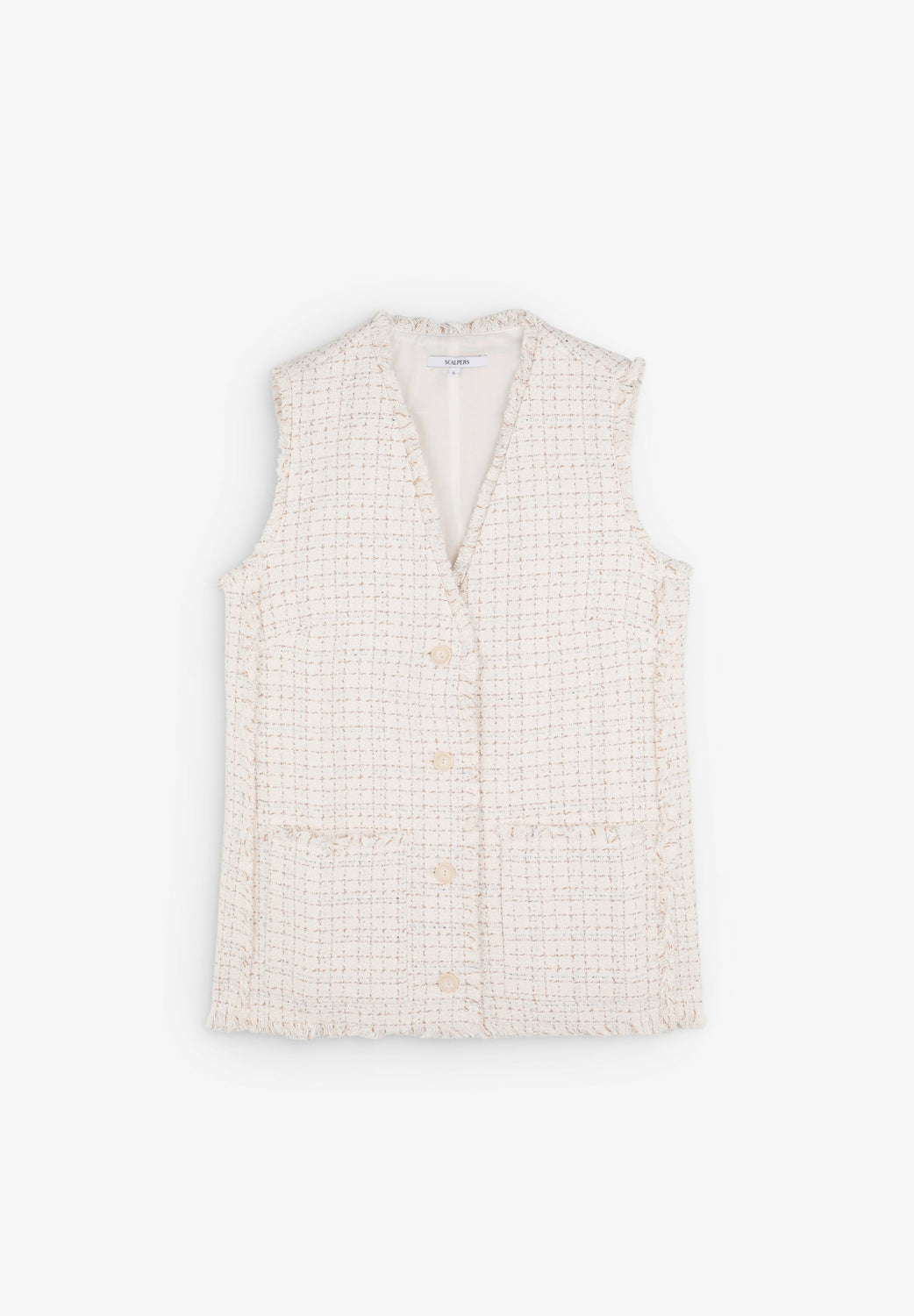 Chaleco confeccionado en mezcla de algodón con hilo metalizado. Corte Regular fit, escote de pico y cierre con botones. Manga en sisa con detalles desflecados en manga y el bajo. Bolsillos de parche frontales.